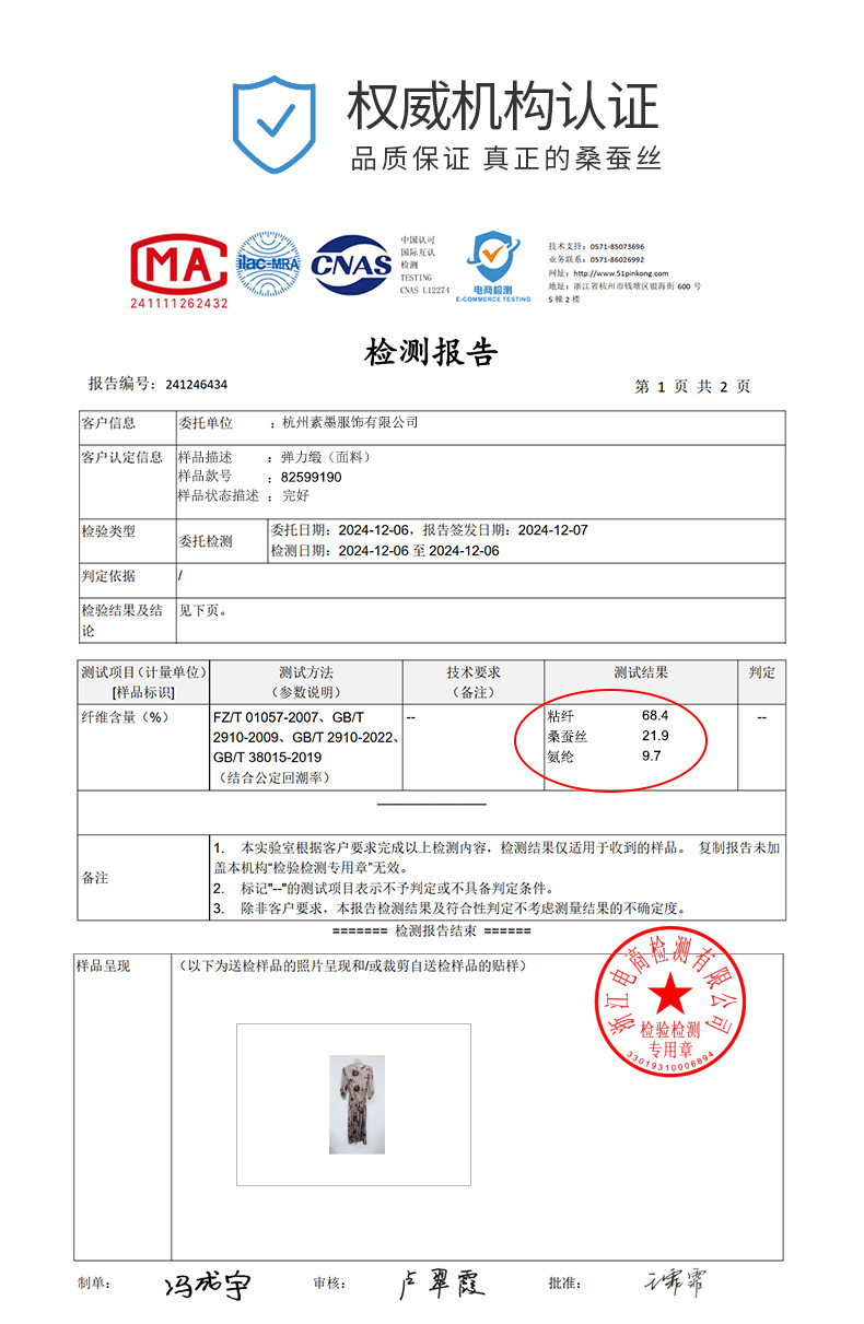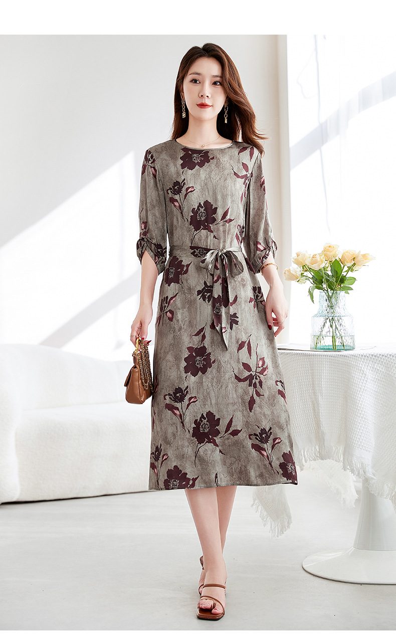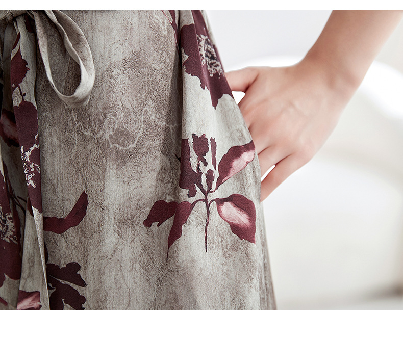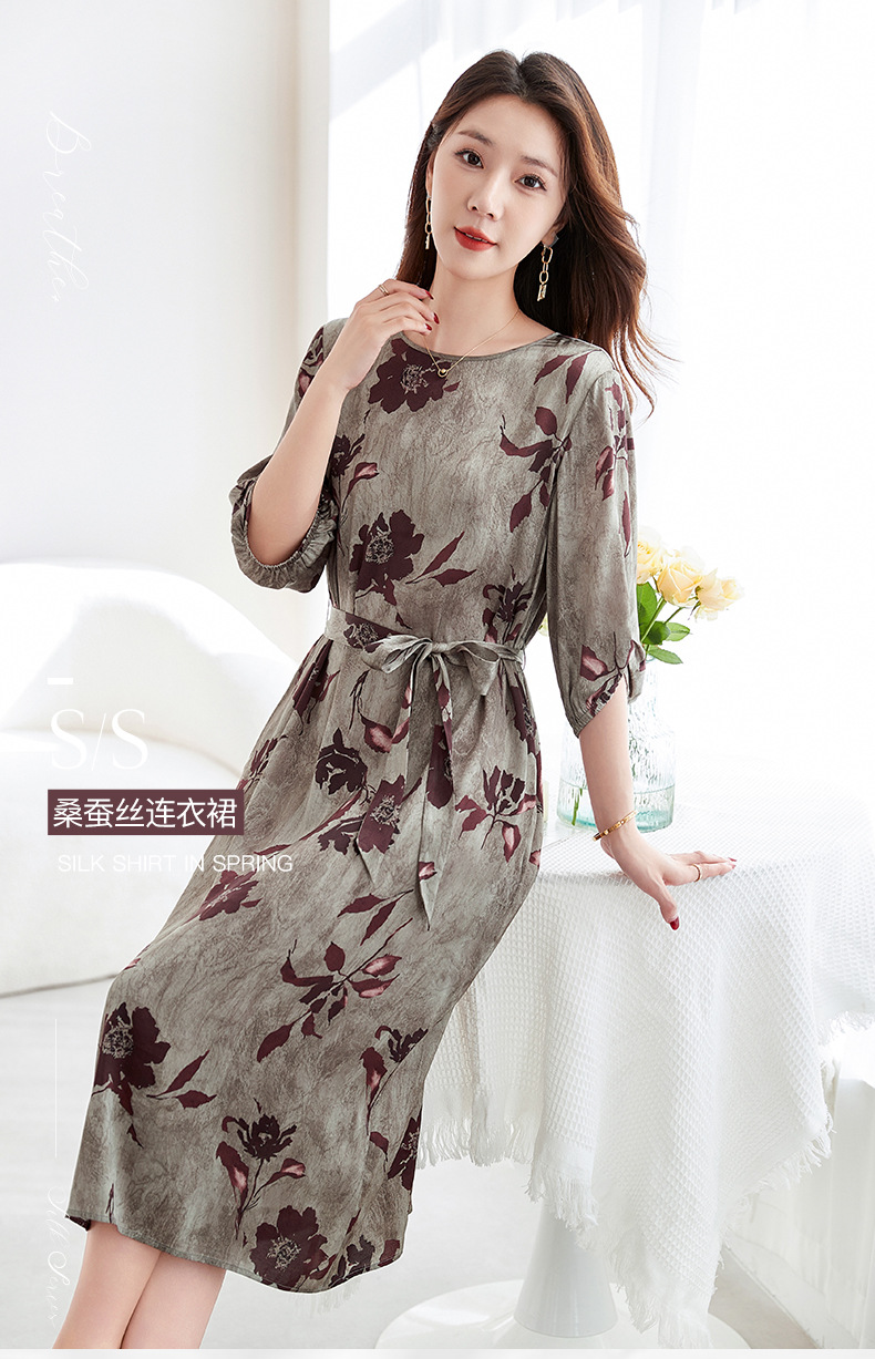 QS-82599190丝绣未央原创国风真丝缎面连衣裙圆领短袖印花桑蚕丝中长裙女9190