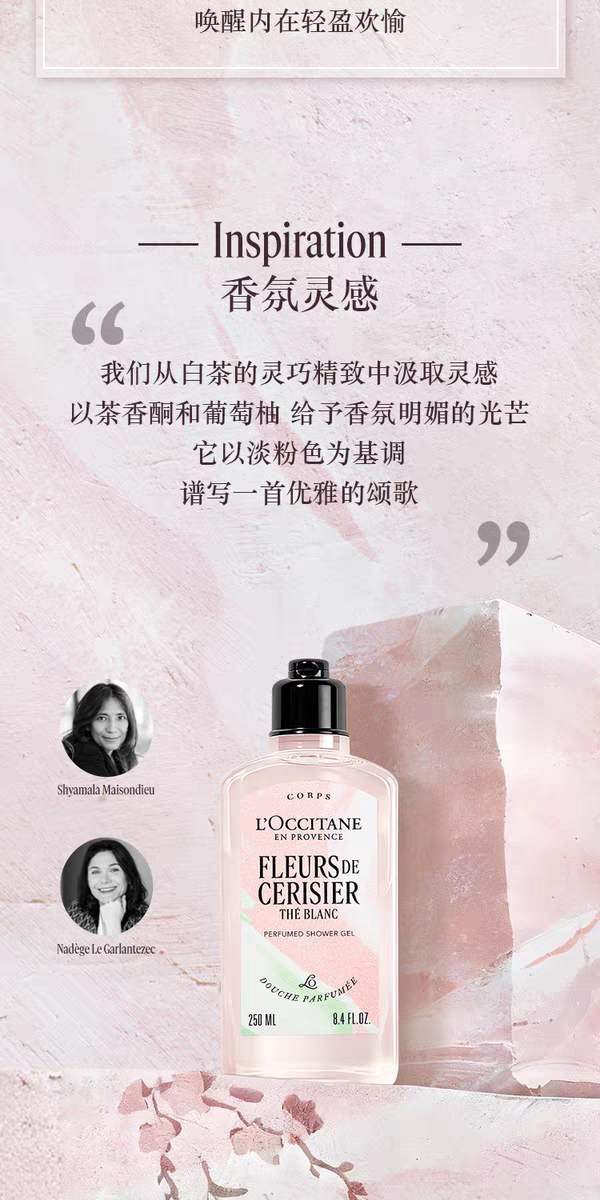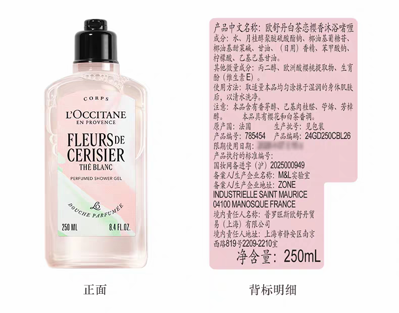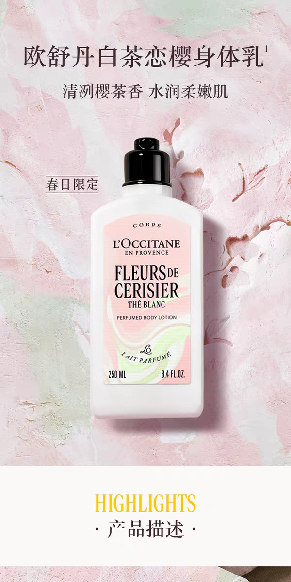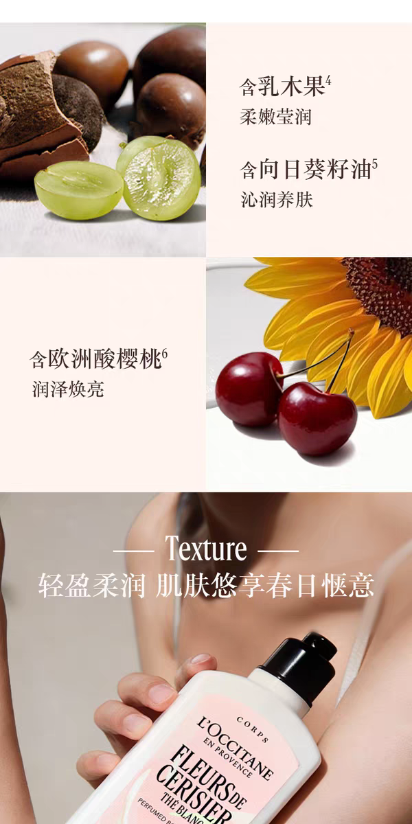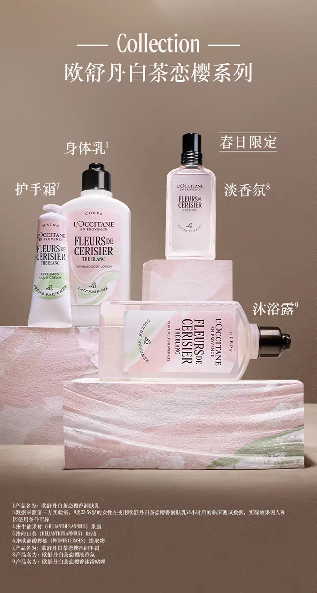 【新品上市】欧舒丹白茶恋樱香沐浴啫喱250ml+润肤乳250ml+护手霜30ml