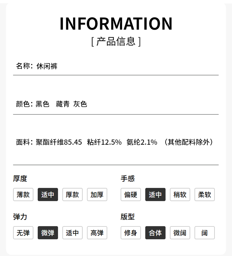 面料:85.45%聚酯纤维12.5%粘纤2.1%氨纶(其他配料除外)
