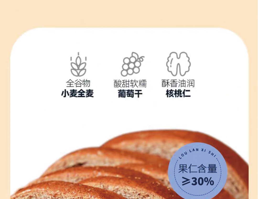 【配料表】黑麦粉,全小麦粉,牛奶,葡萄干,核桃仁,白砂糖,鸡蛋,全脂乳粉,黄油,酵母,食用盐,食品添加剂(丙酸钙)