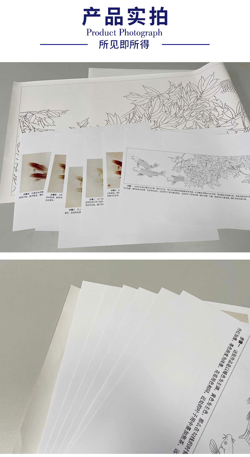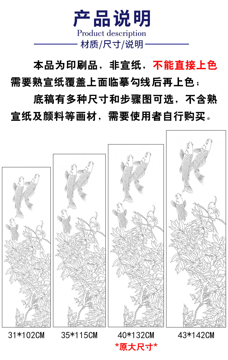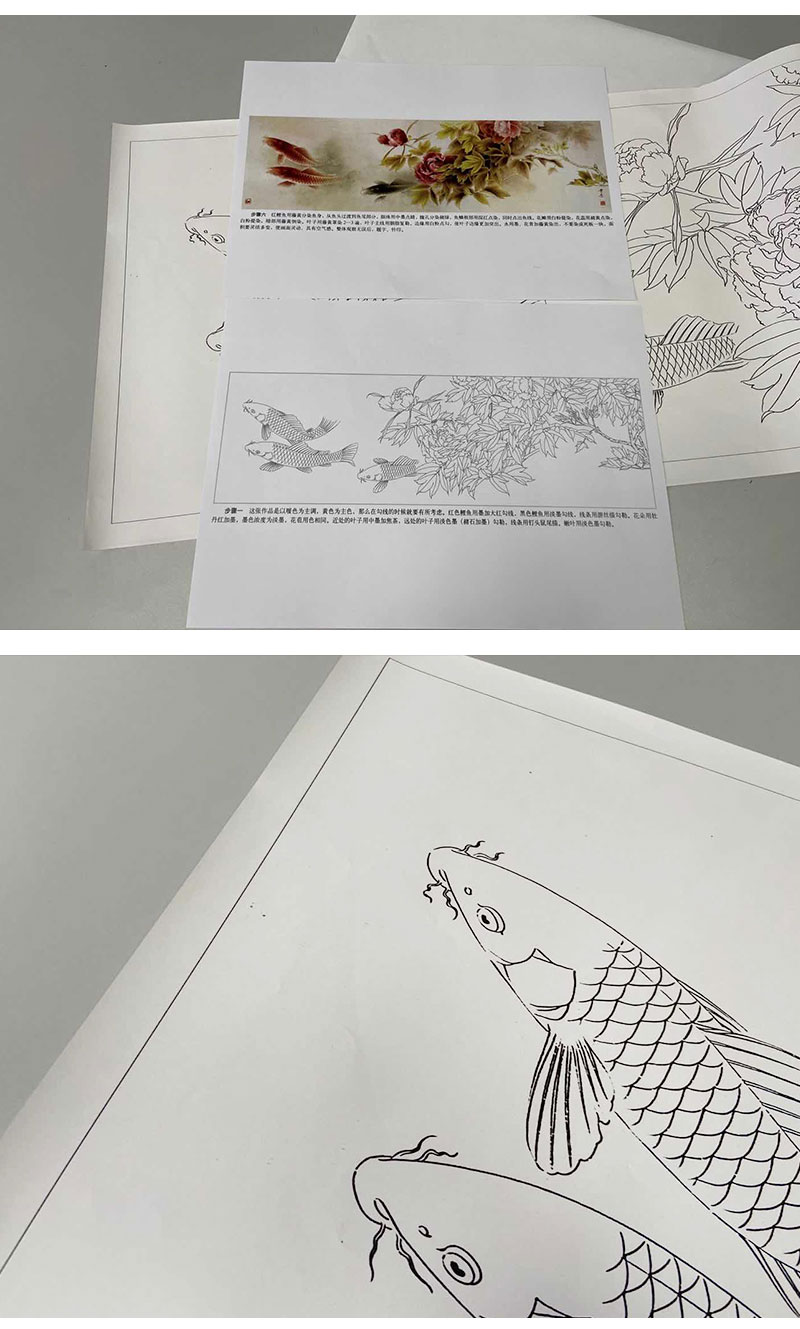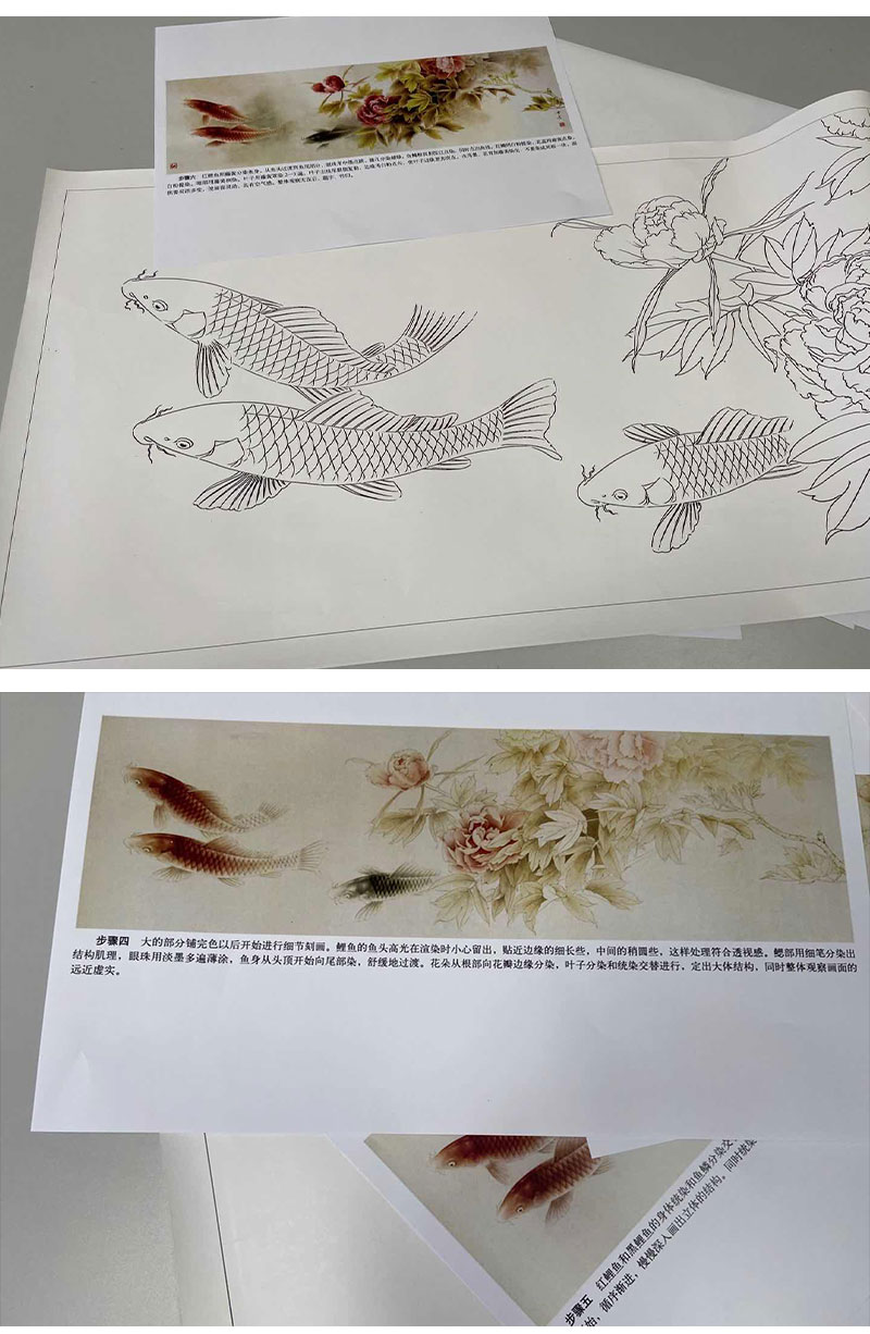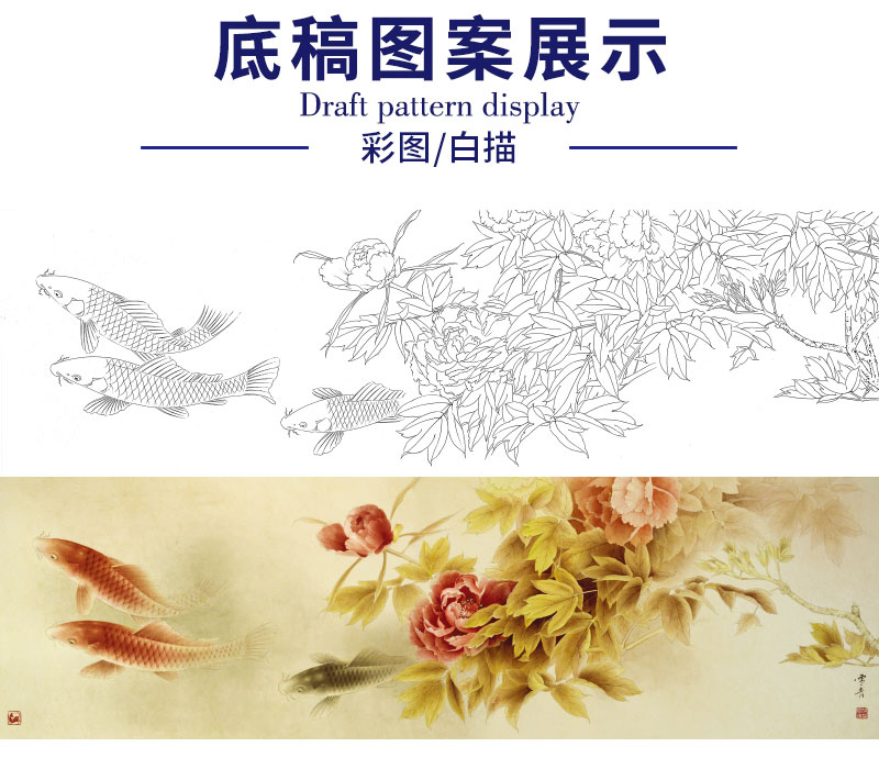 【有步骤、大彩图】龚雪青横幅工笔画白描底稿《富贵多来图》牡丹鲤鱼图初学者临摹花鸟线稿XQ95