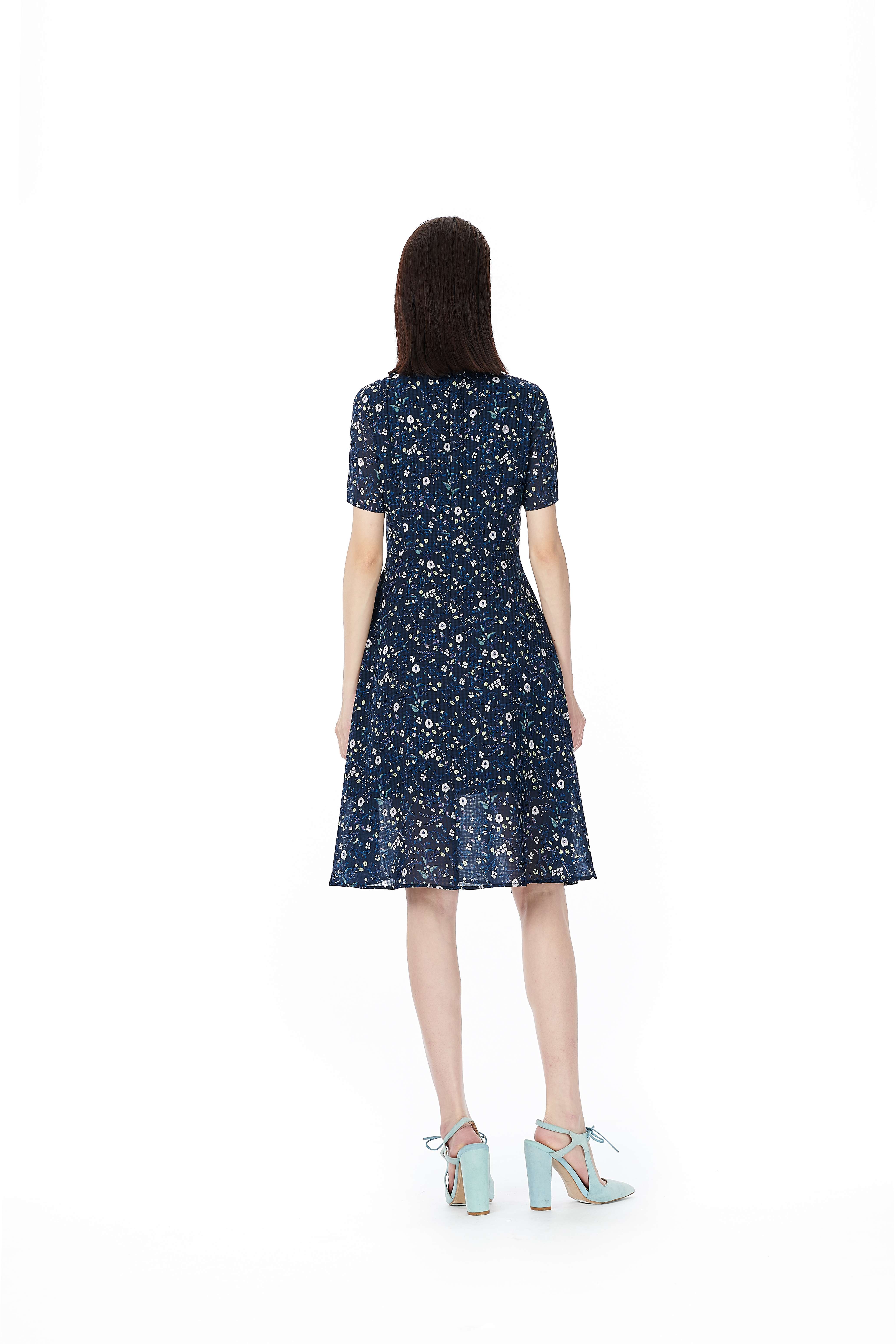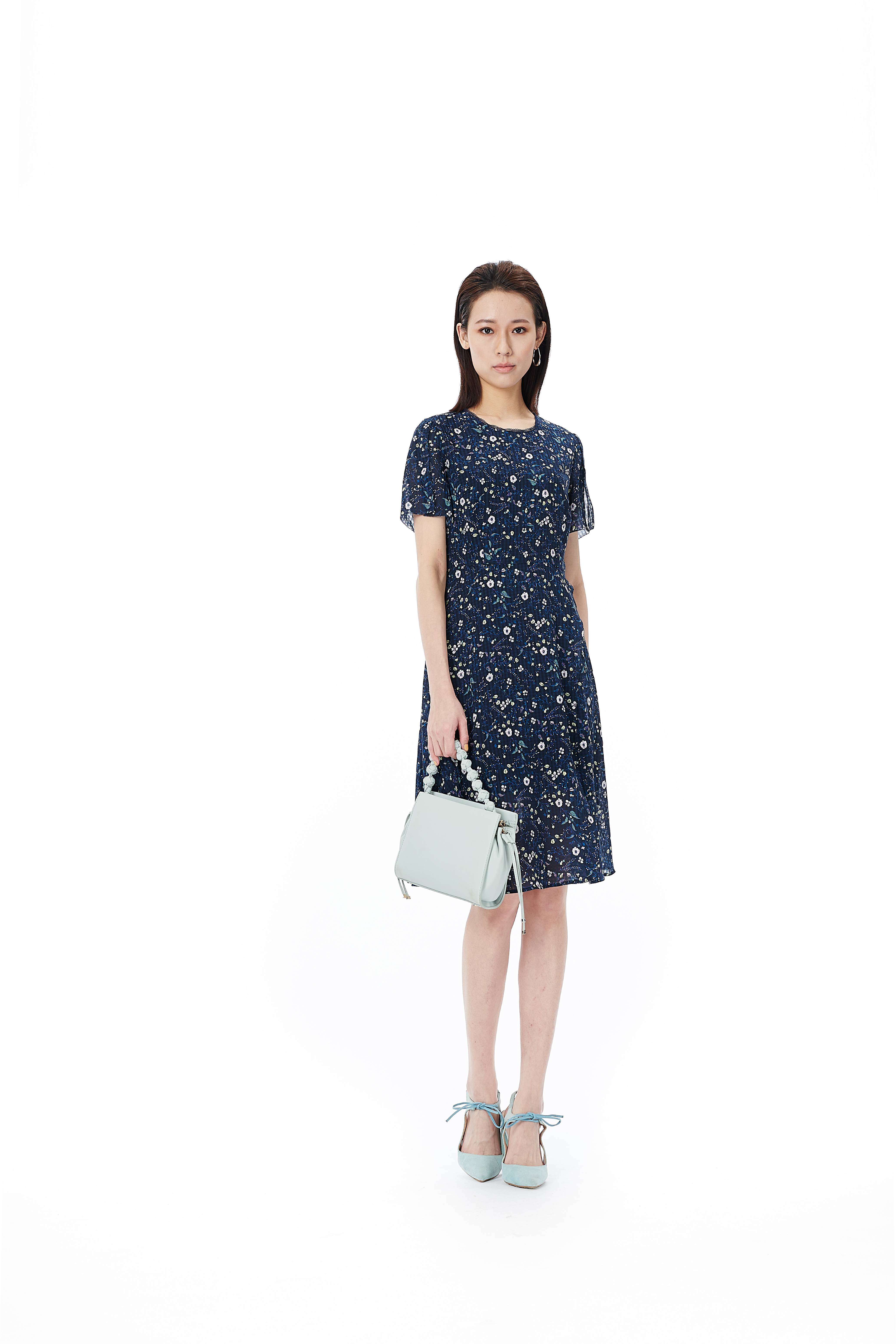 S2奇威小碎花短袖蓝底格纹连衣裙 0HC0317859