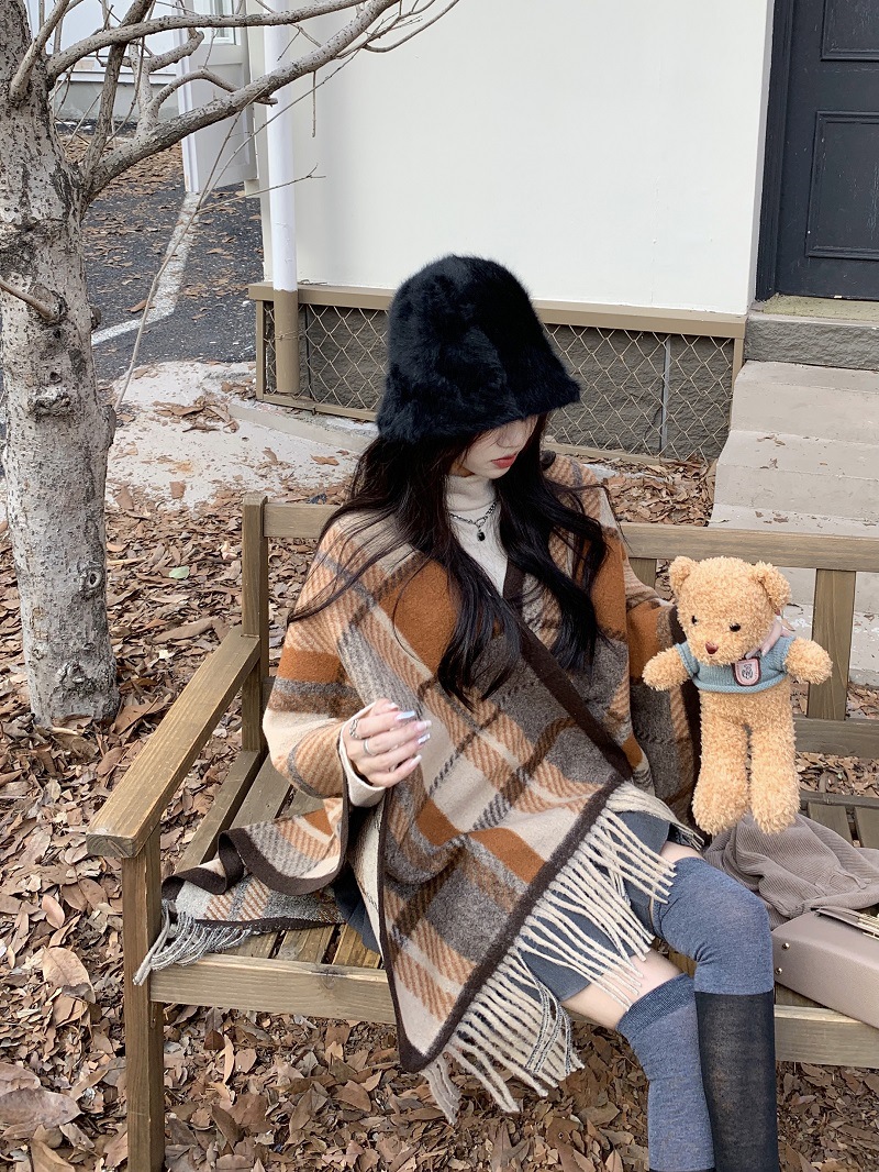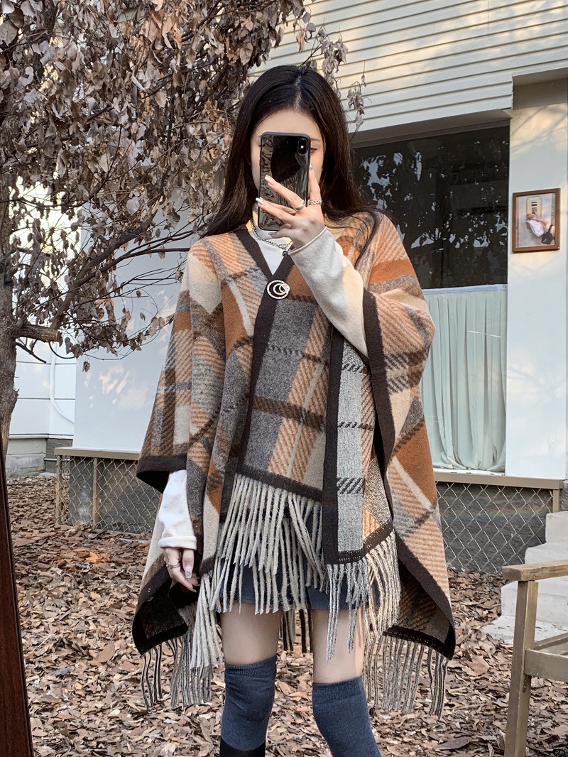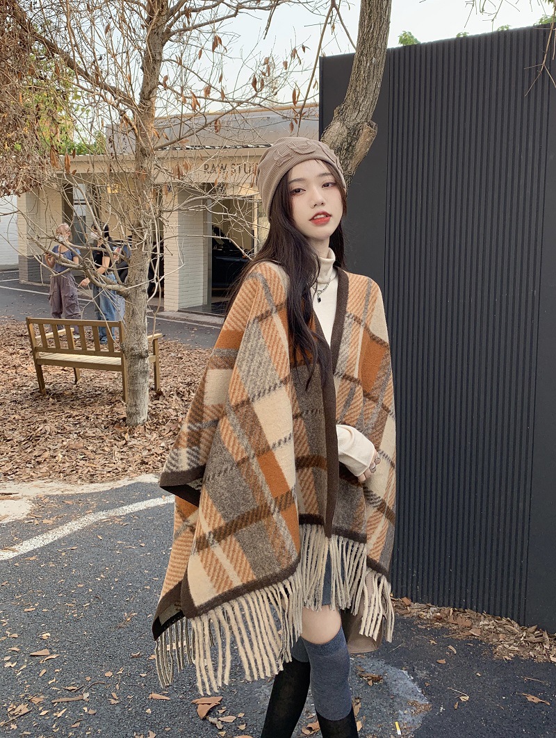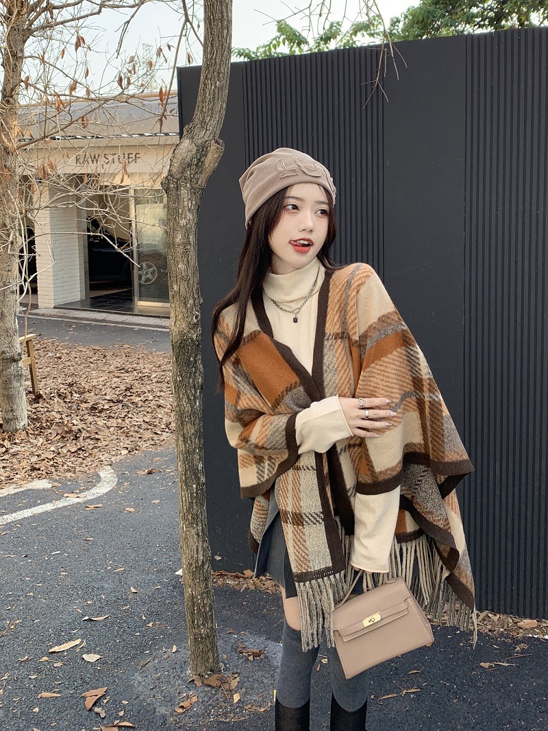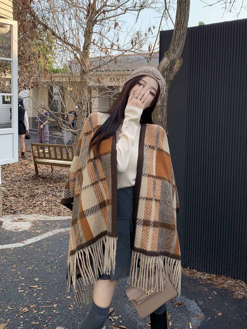 ZW0191 2023春秋新款女士针织衫披肩外套女装格纹设计感流苏针织斗篷 商品图0