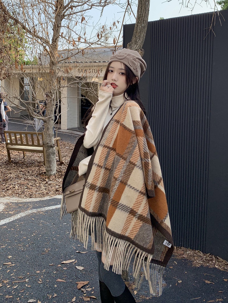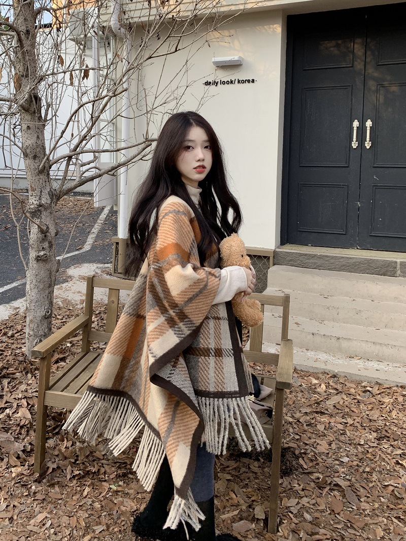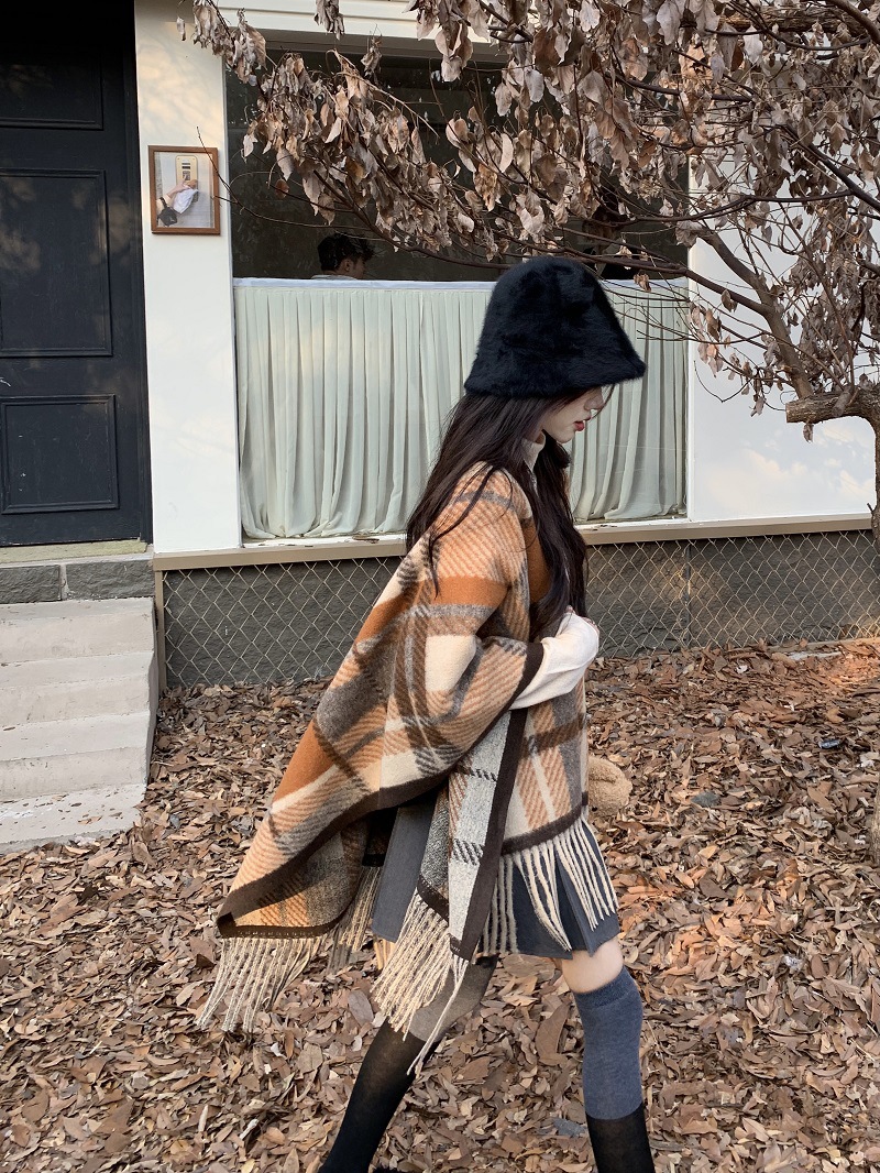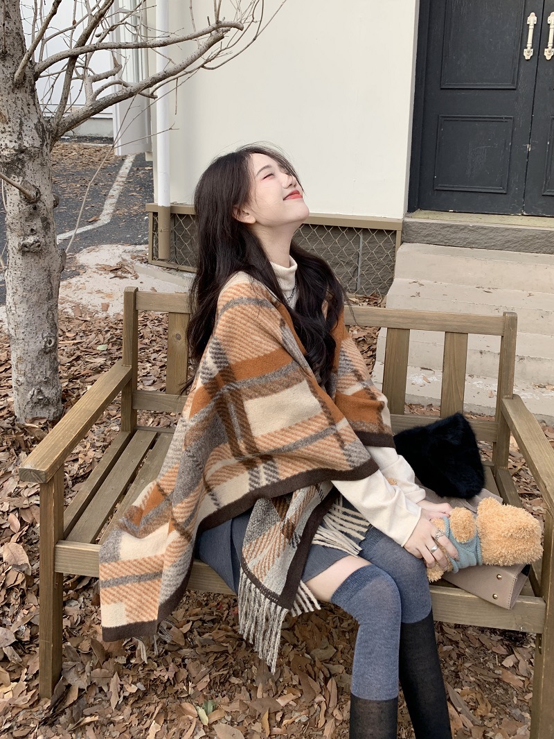 ZW0191 2023春秋新款女士针织衫披肩外套女装格纹设计感流苏针织斗篷 商品图0