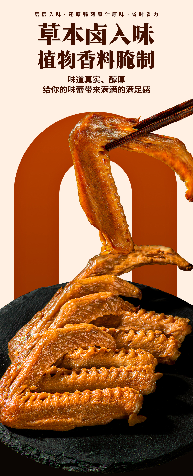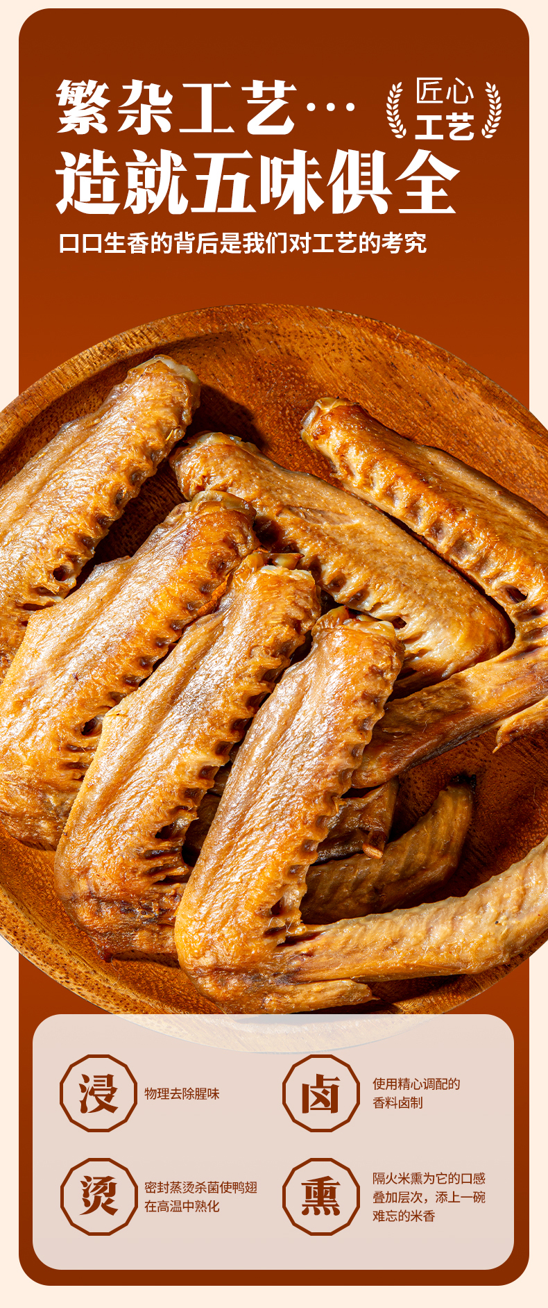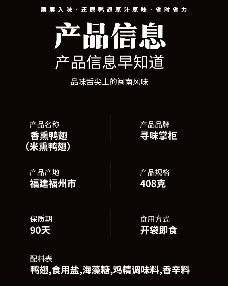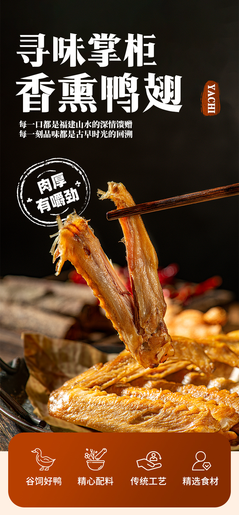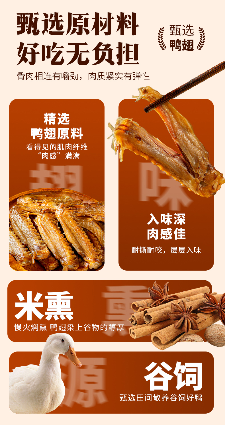 米熏鸭翅:鸭翅、食用盐、海藻糖、鸡精调味料、香辛料