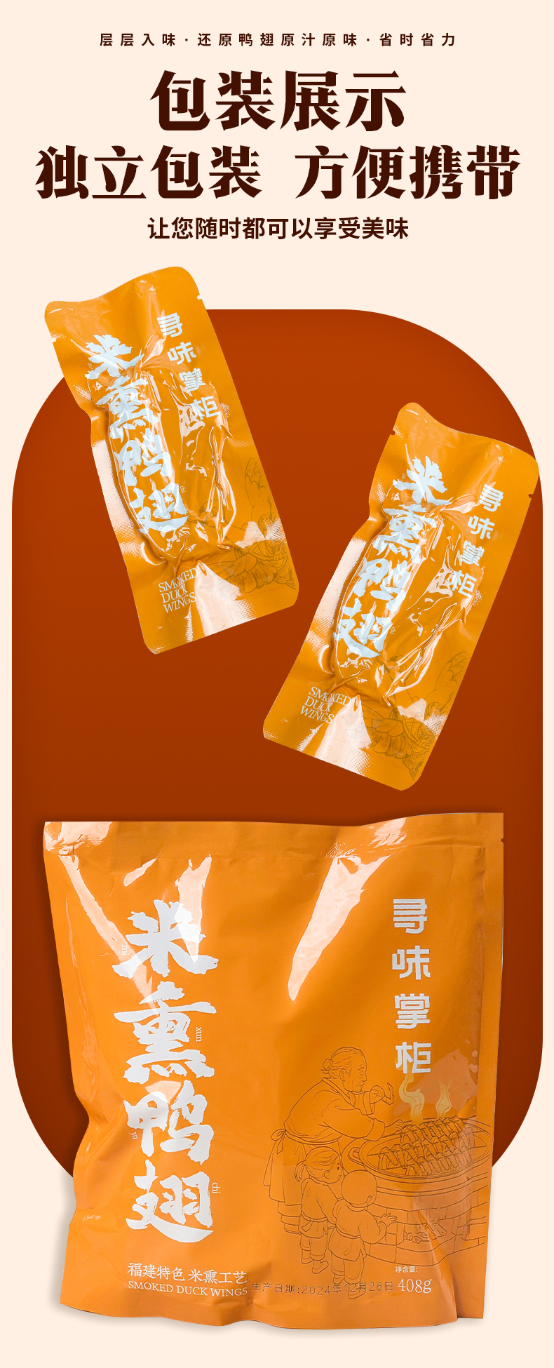 【天然香料低温慢卤,传统炉灶隔火米雾蒸熏 】寻味掌柜米熏鸭翅408克/袋10个、米熏鸭爪240克/袋8个