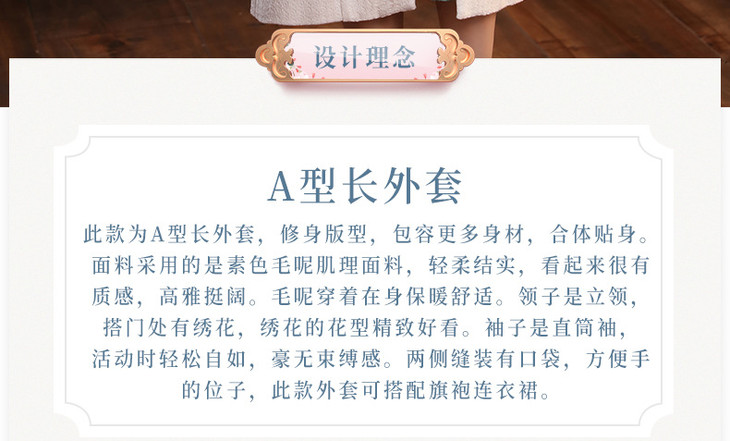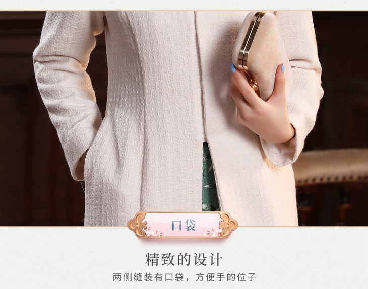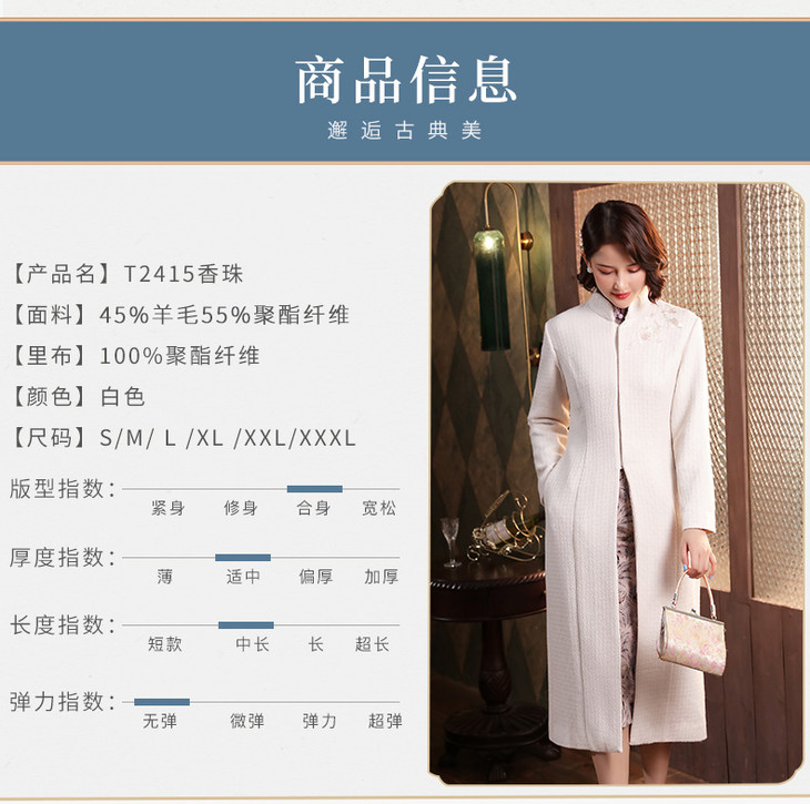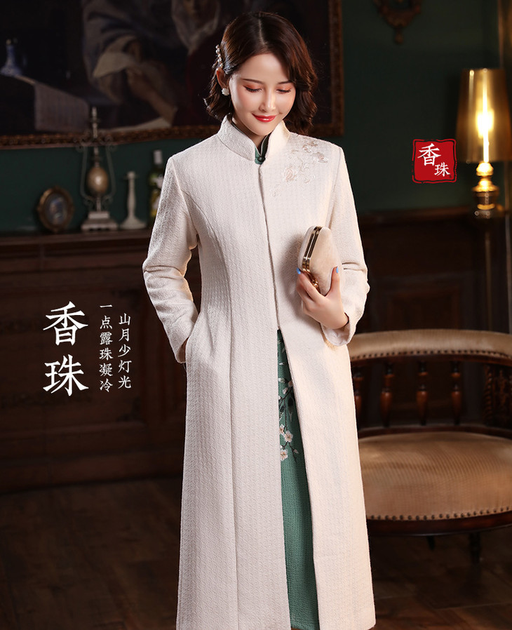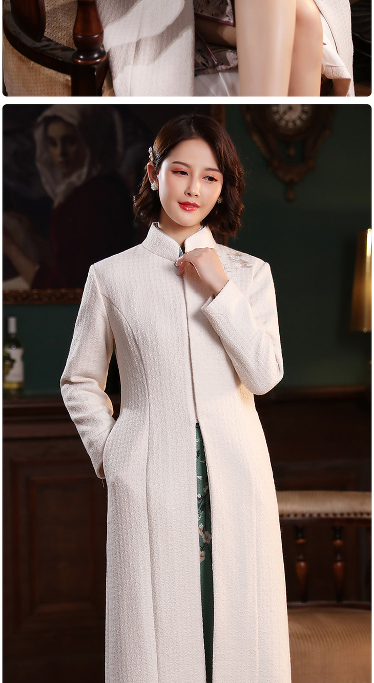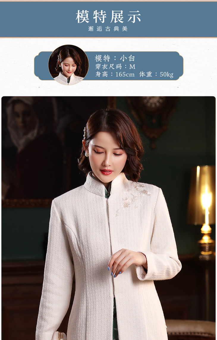 XGT-T2415古典百搭羊毛毛呢绣花长款旗袍外套