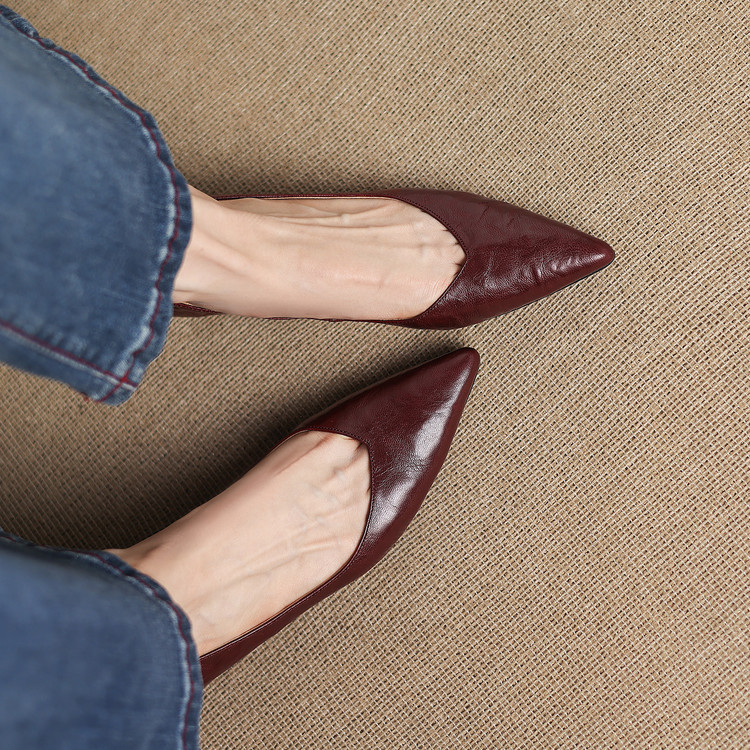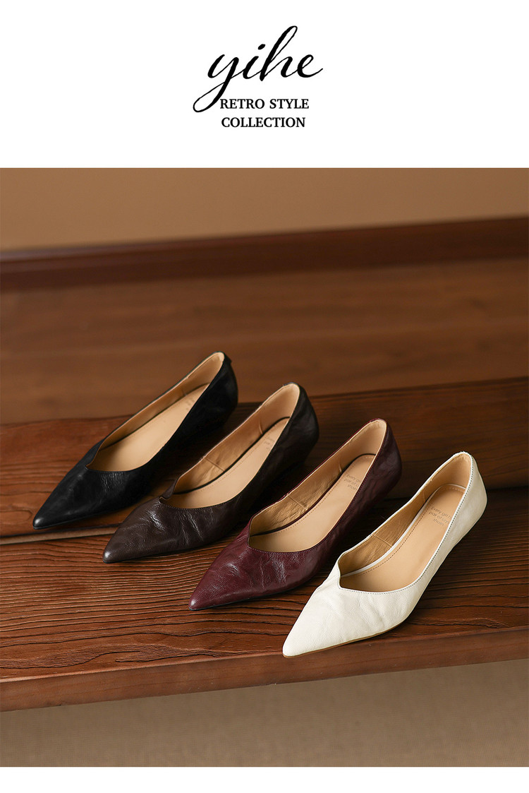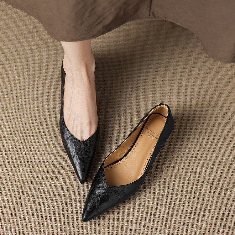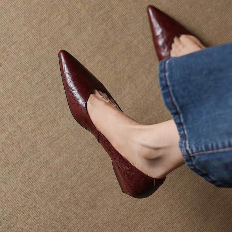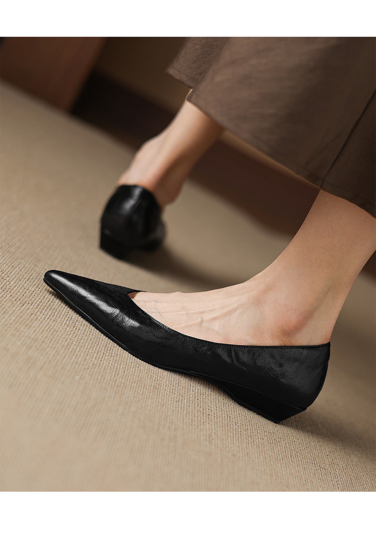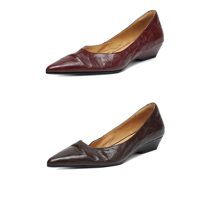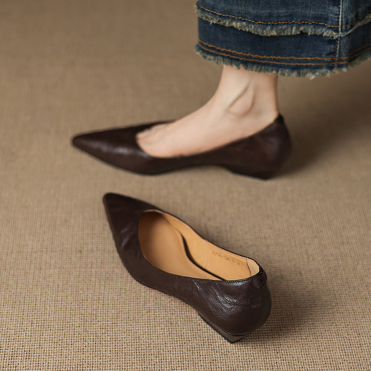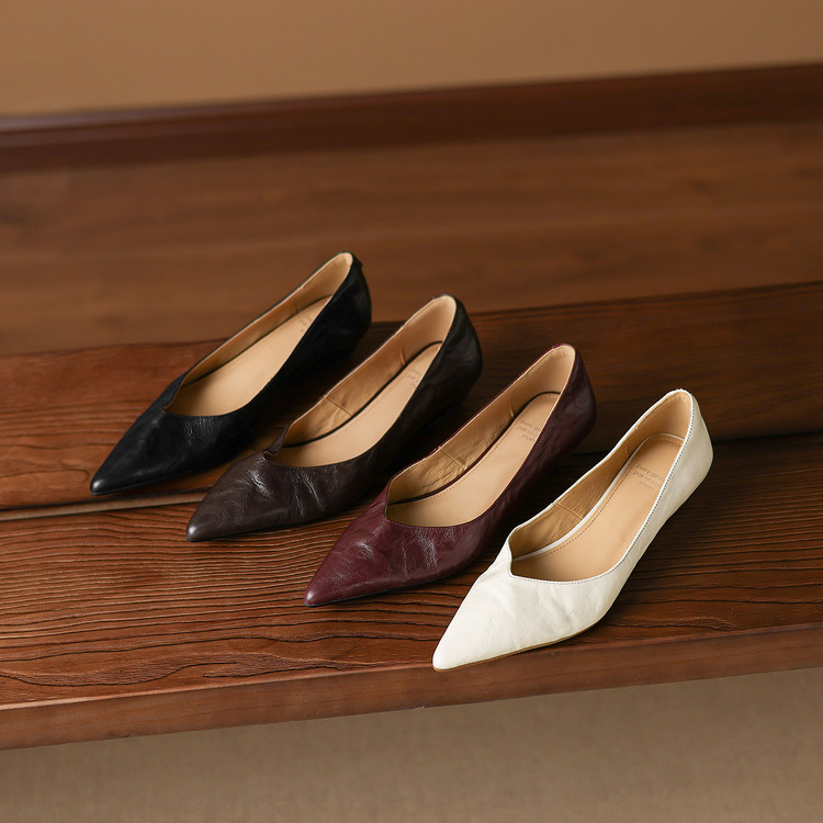 【预售5天】韩版优雅尖头小坡跟质感手抓羊皮通勤低跟全真皮浅口单鞋女HB&5566