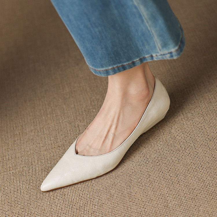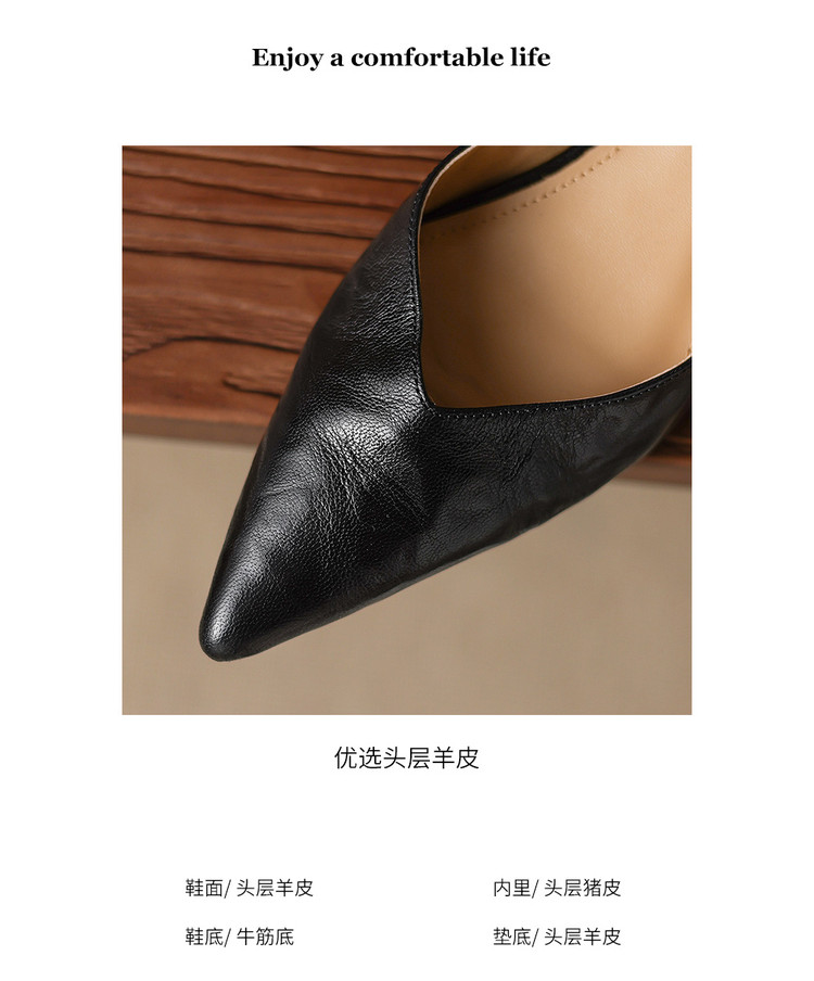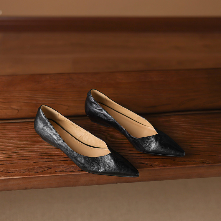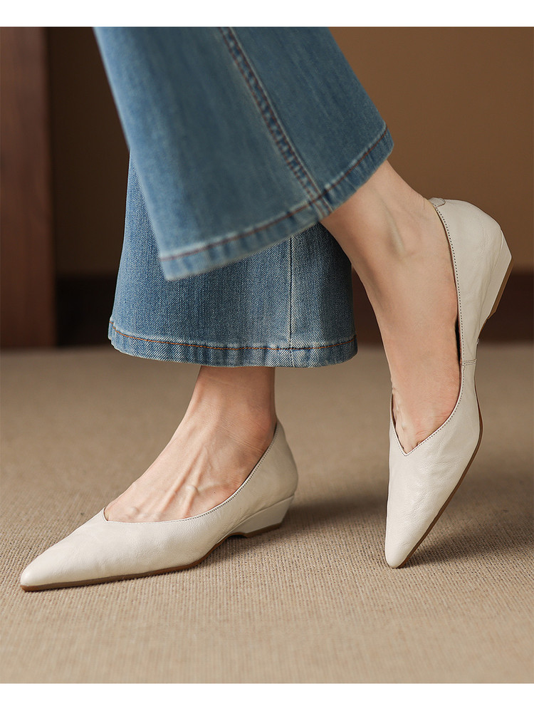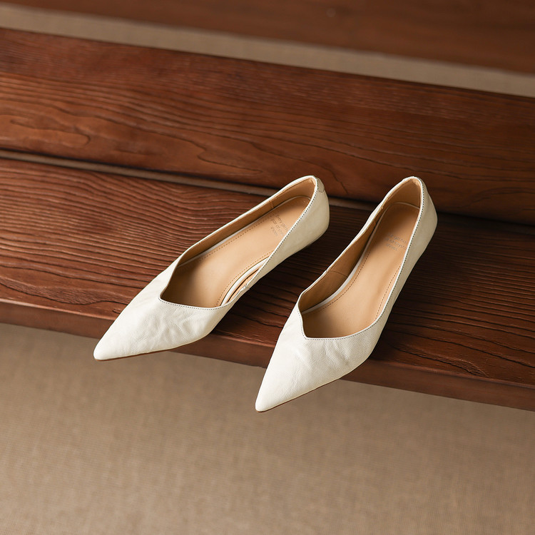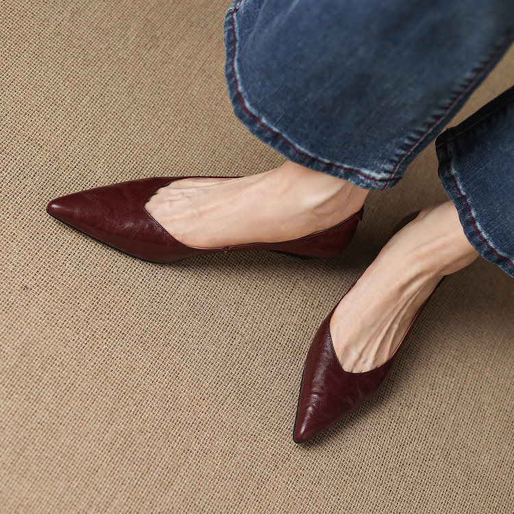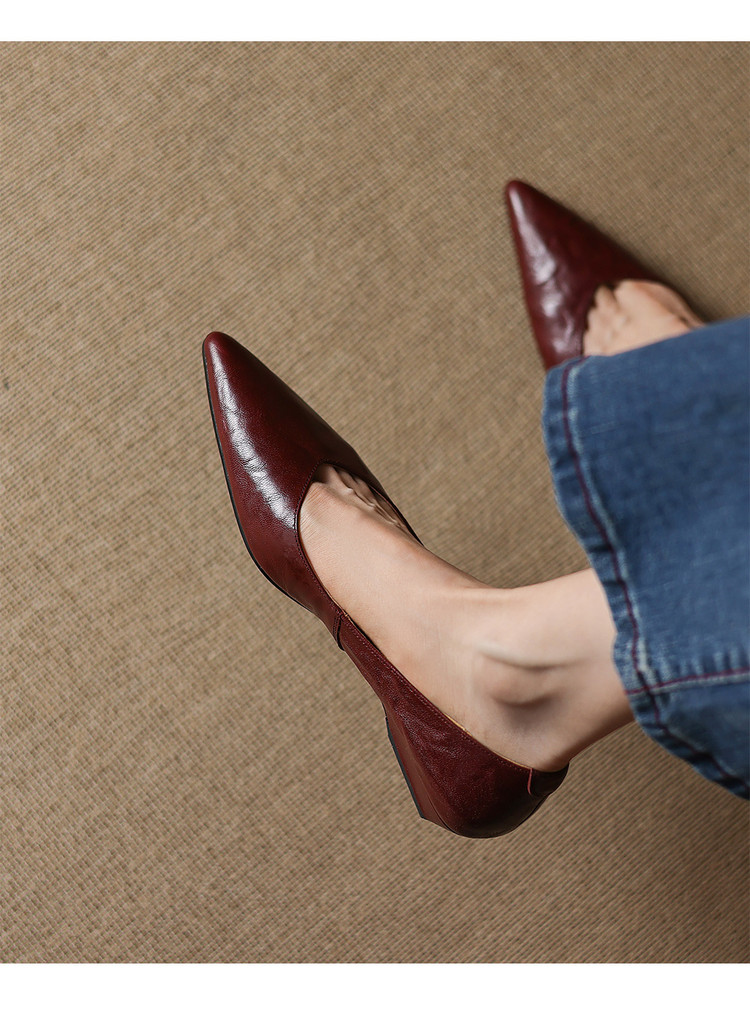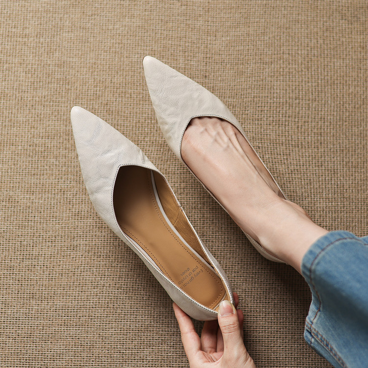 【预售5天】韩版优雅尖头小坡跟质感手抓羊皮通勤低跟全真皮浅口单鞋女HB&5566