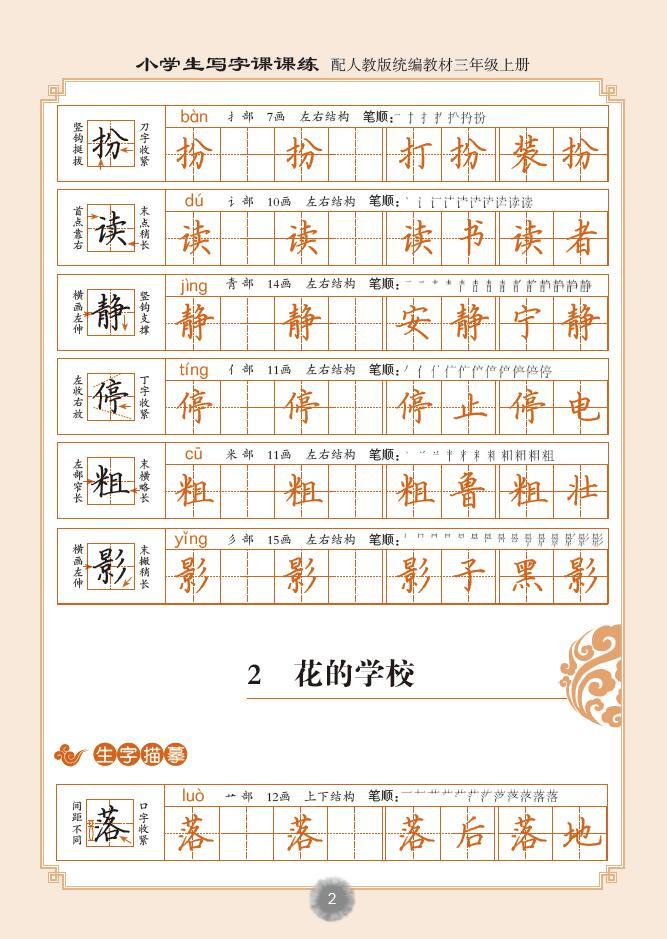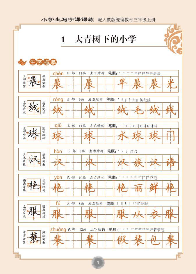 每一个生字都配合口诀和辅助线,提示书写要点,有利于识字写字结合,同时提示正确的笔顺、结构,安排拼音和词语的描红;生字组词一般不出现没学过的字,不增加学生负担;课文要求掌握的重点句段、语文园地中的日积月累等要求掌握的语文知识都安排描红,边写边记。