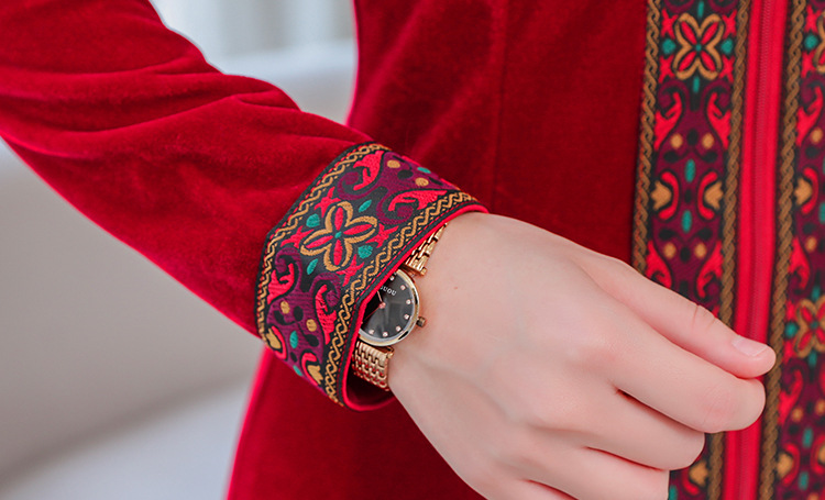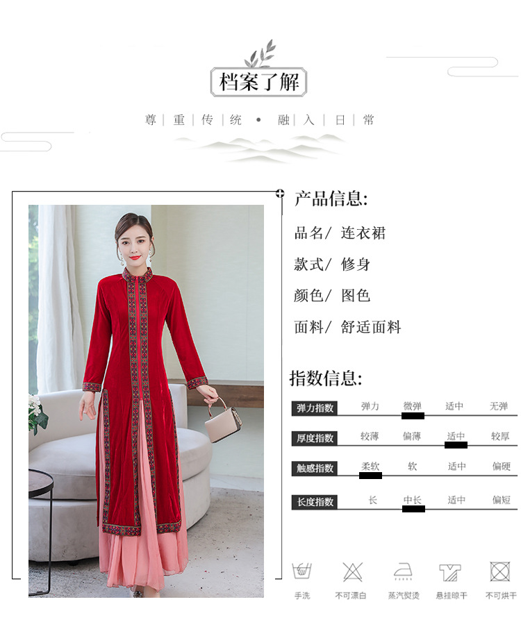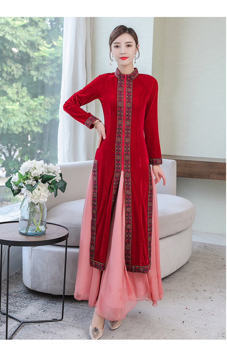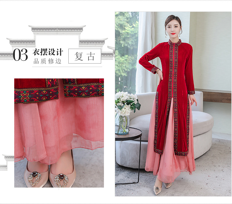 F-FS6677新款金丝绒酒红色气质开叉旗袍两件套连衣裙TZW