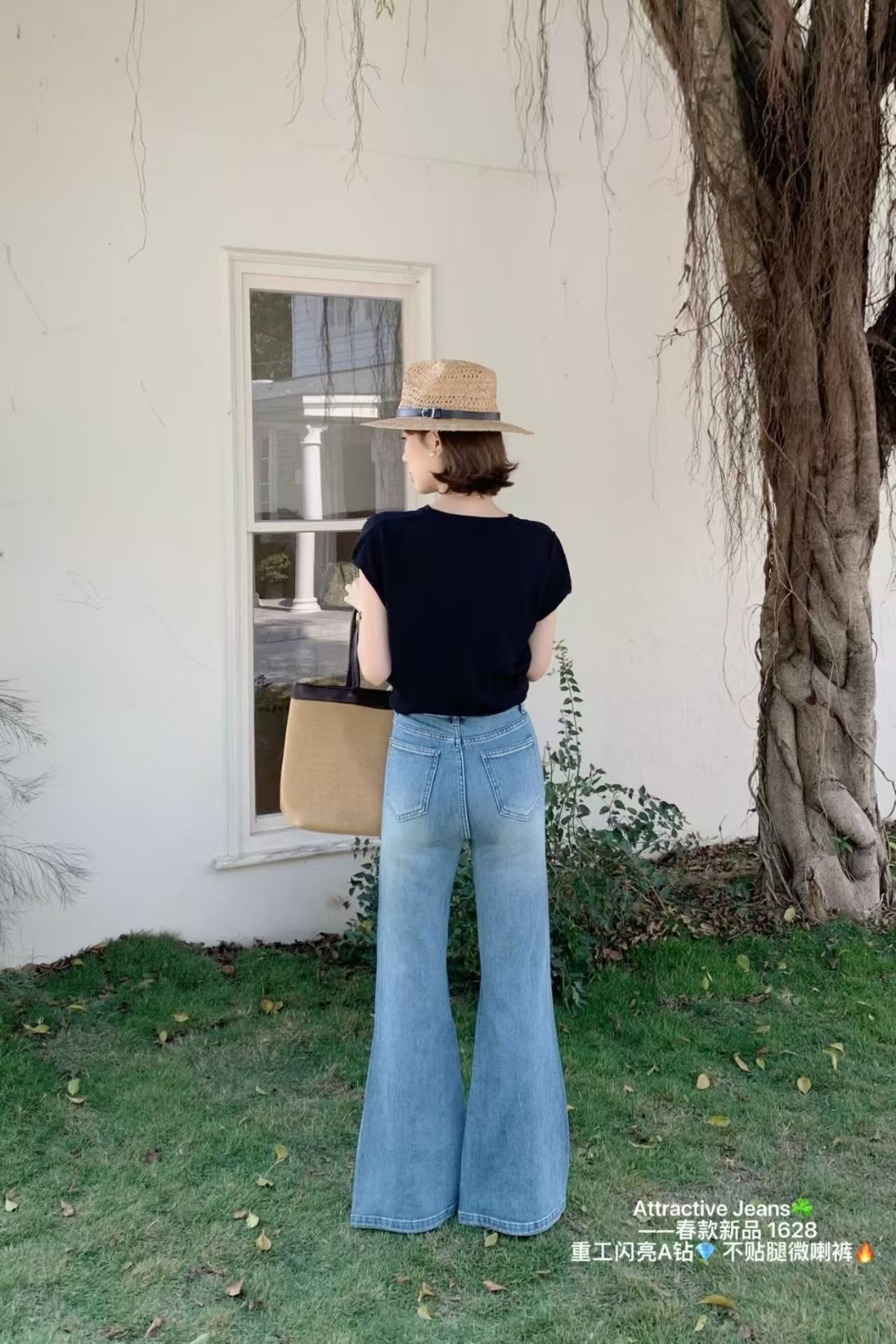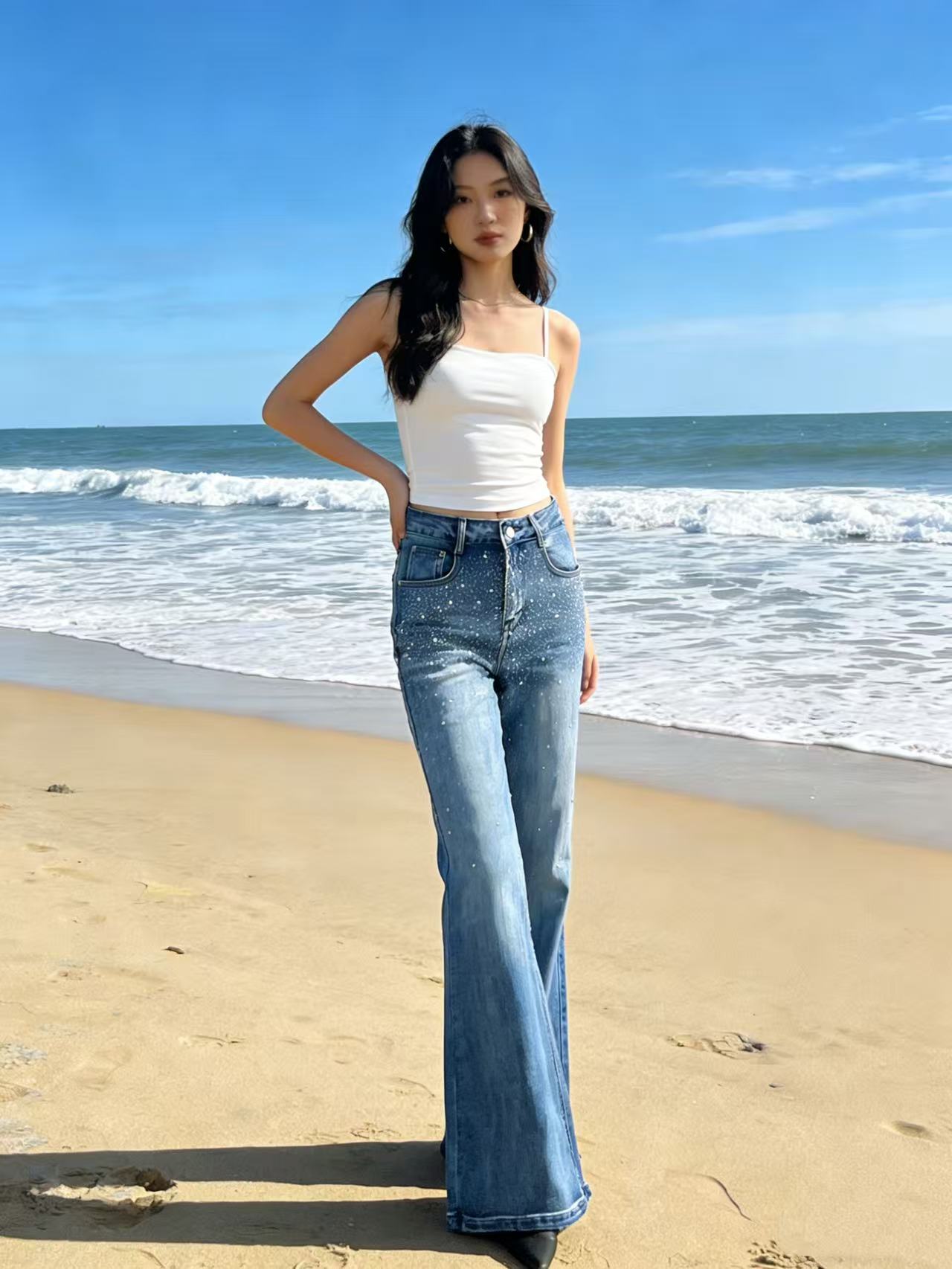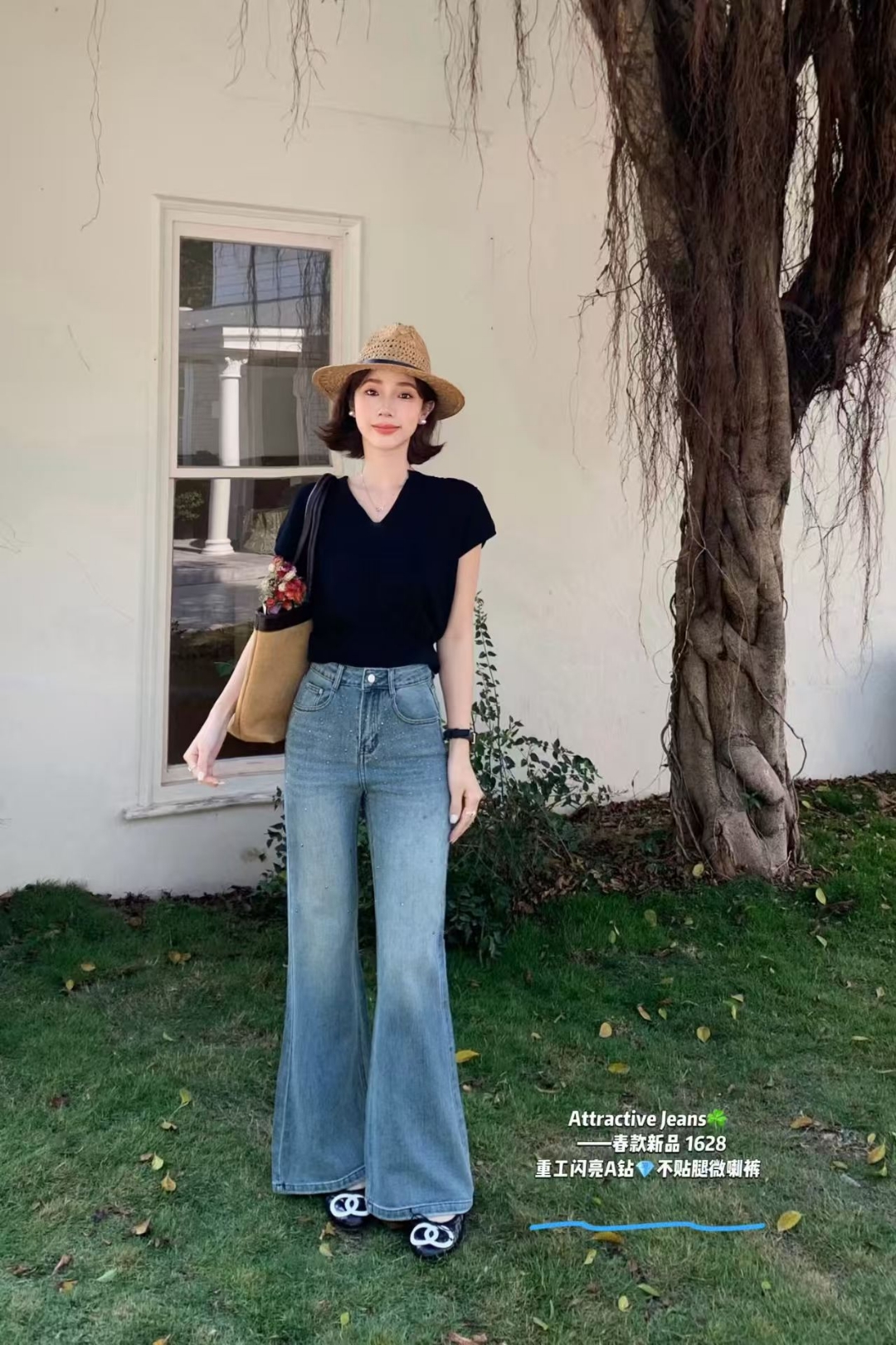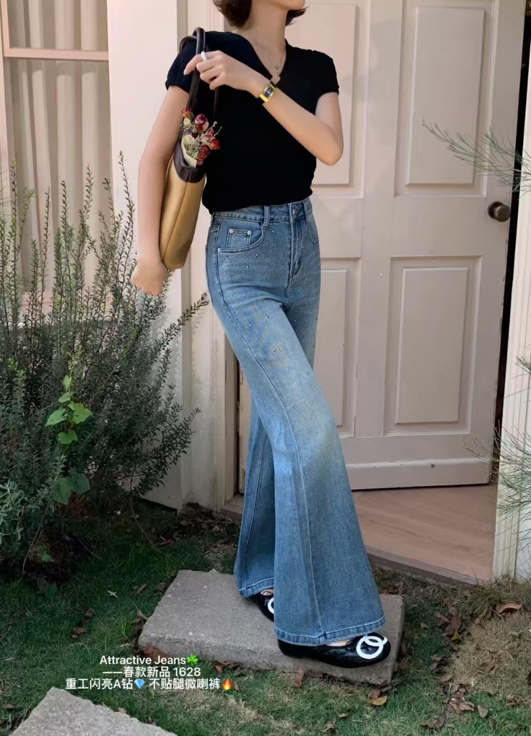 爆款烫钻【自营】1628超显瘦春季牛仔星空钻筒喇裤长款拖地裤-喜出