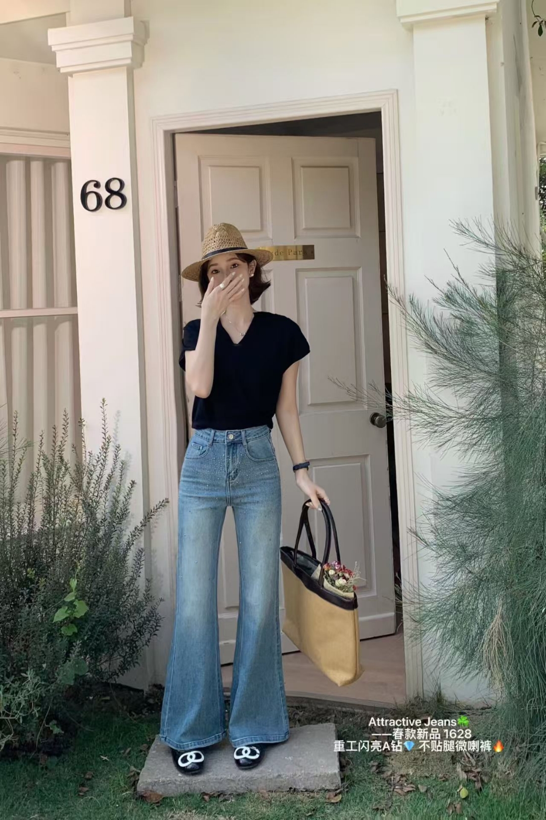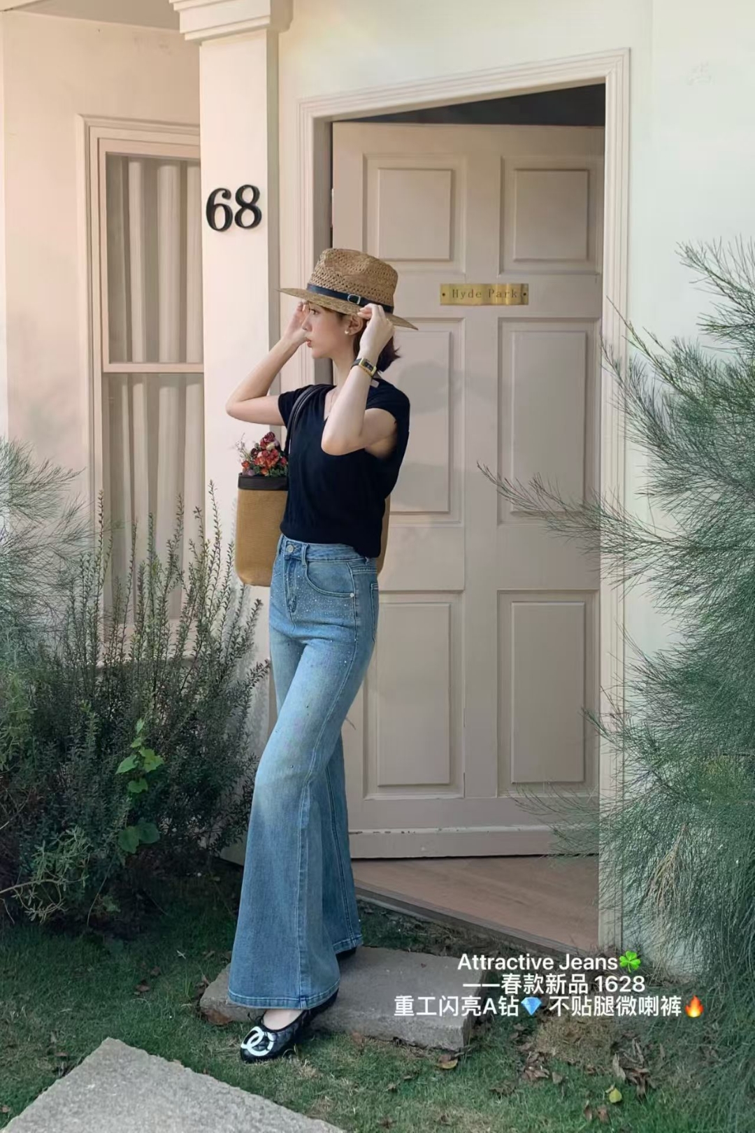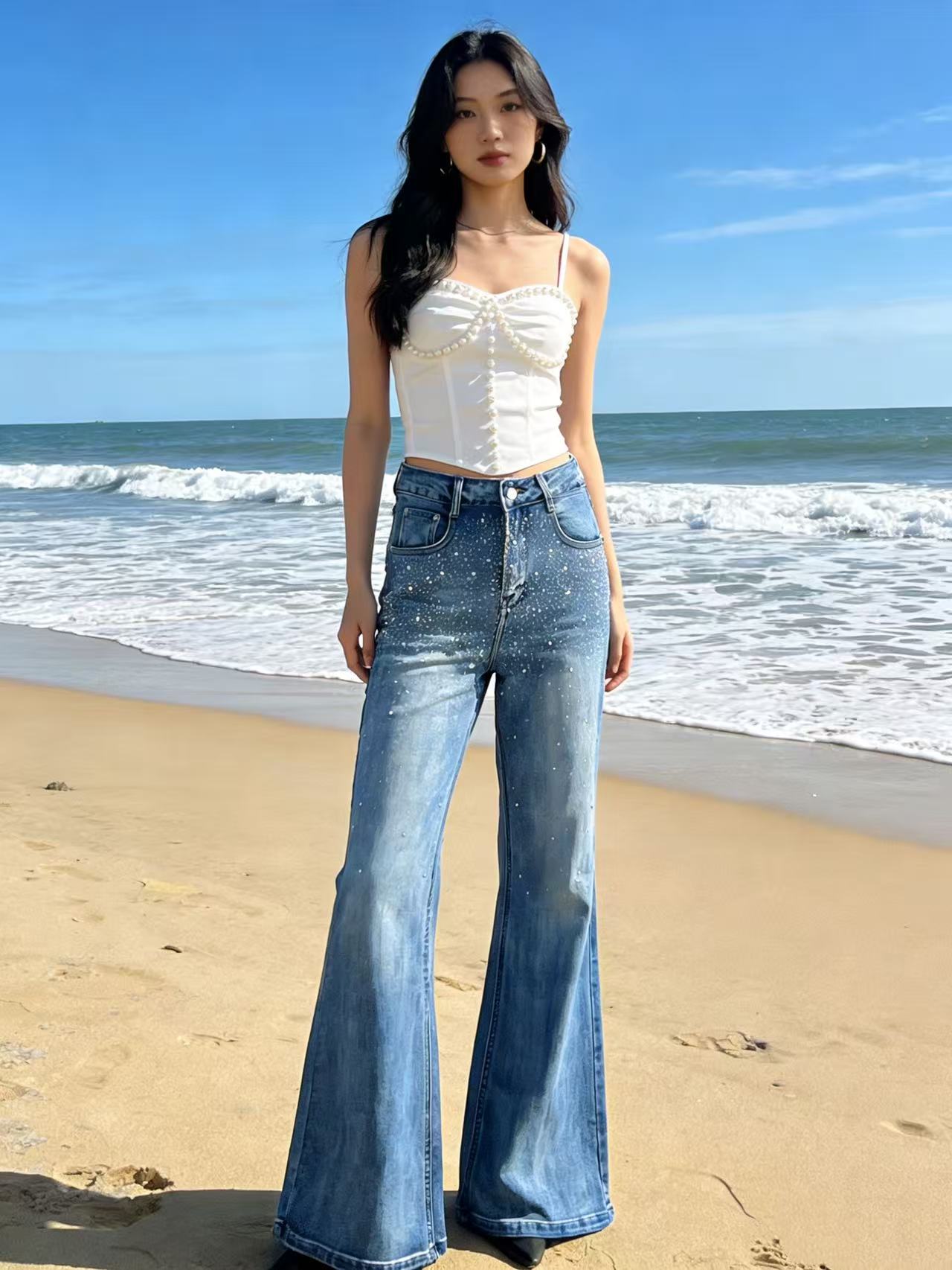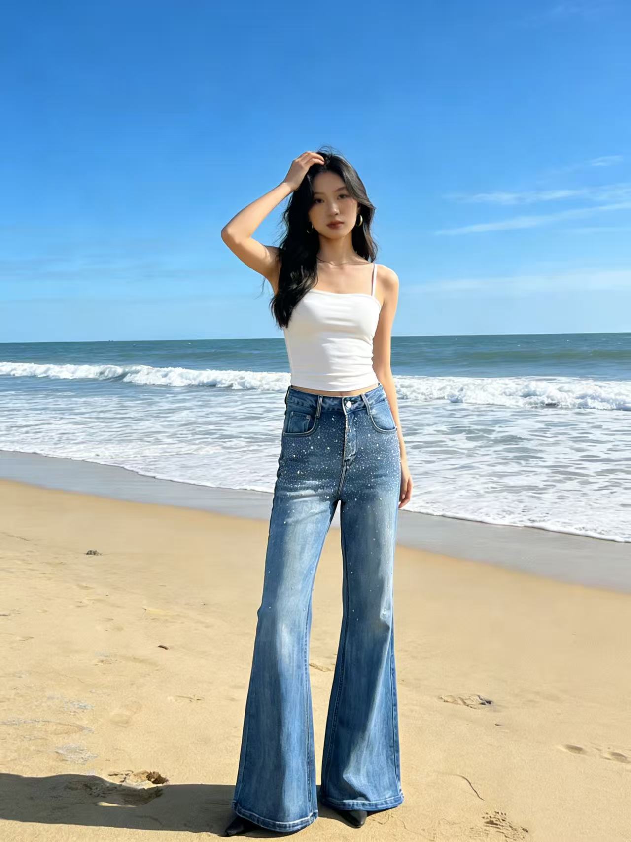 爆款烫钻【自营】1628超显瘦春季牛仔星空钻筒喇裤长款拖地裤-喜出