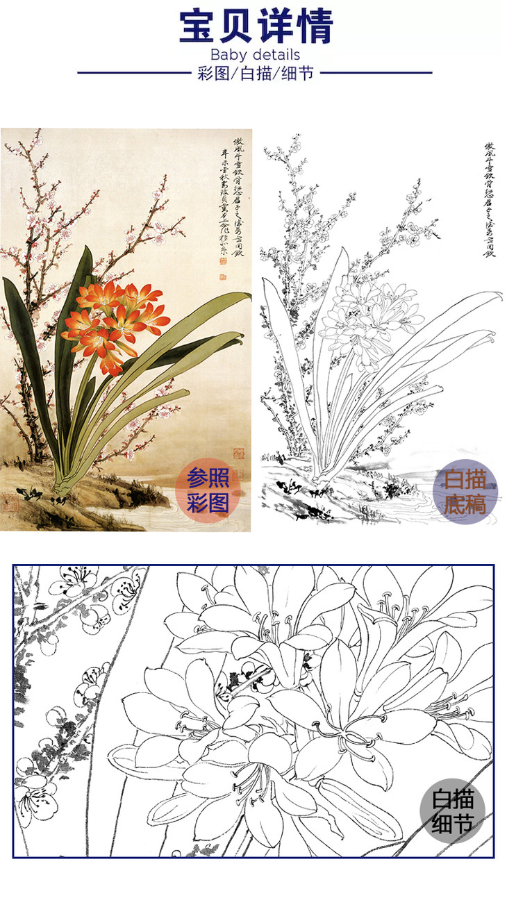 俞致贞竖幅工笔花鸟白描底稿-兰花《君子兰》-多种白描尺寸可选-JV36