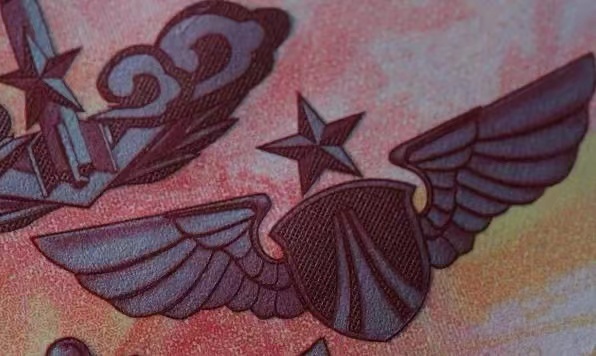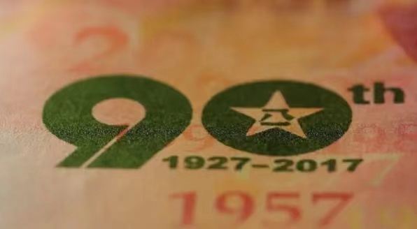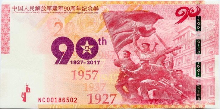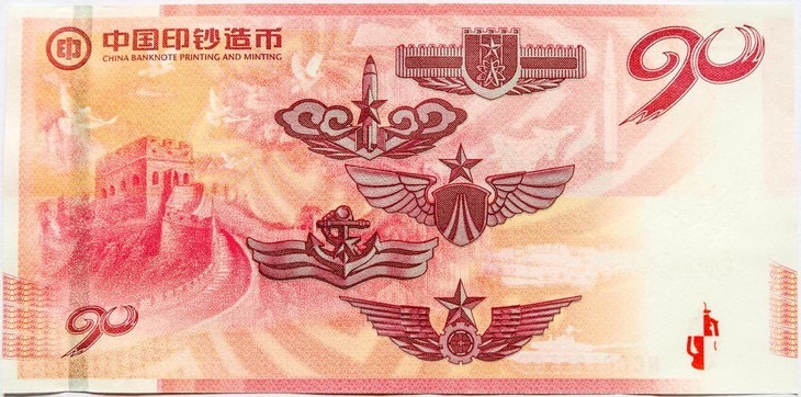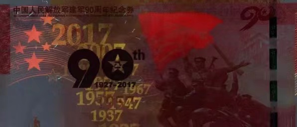 背面图案:主景为中国人民解放军徽章,分别代表战略支援部队、火箭军、空军、海军、陆军,背景由长城、和平鸽、祥云、部分代表性兵器剪影组成,彰显了威武之师、文明之师、和平之师的风采,臻善诠释和典藏纪念中国人民解放军建军90周年,对弘扬“八一精神”、传承英雄基因、繁荣红色文化具有积极意义。