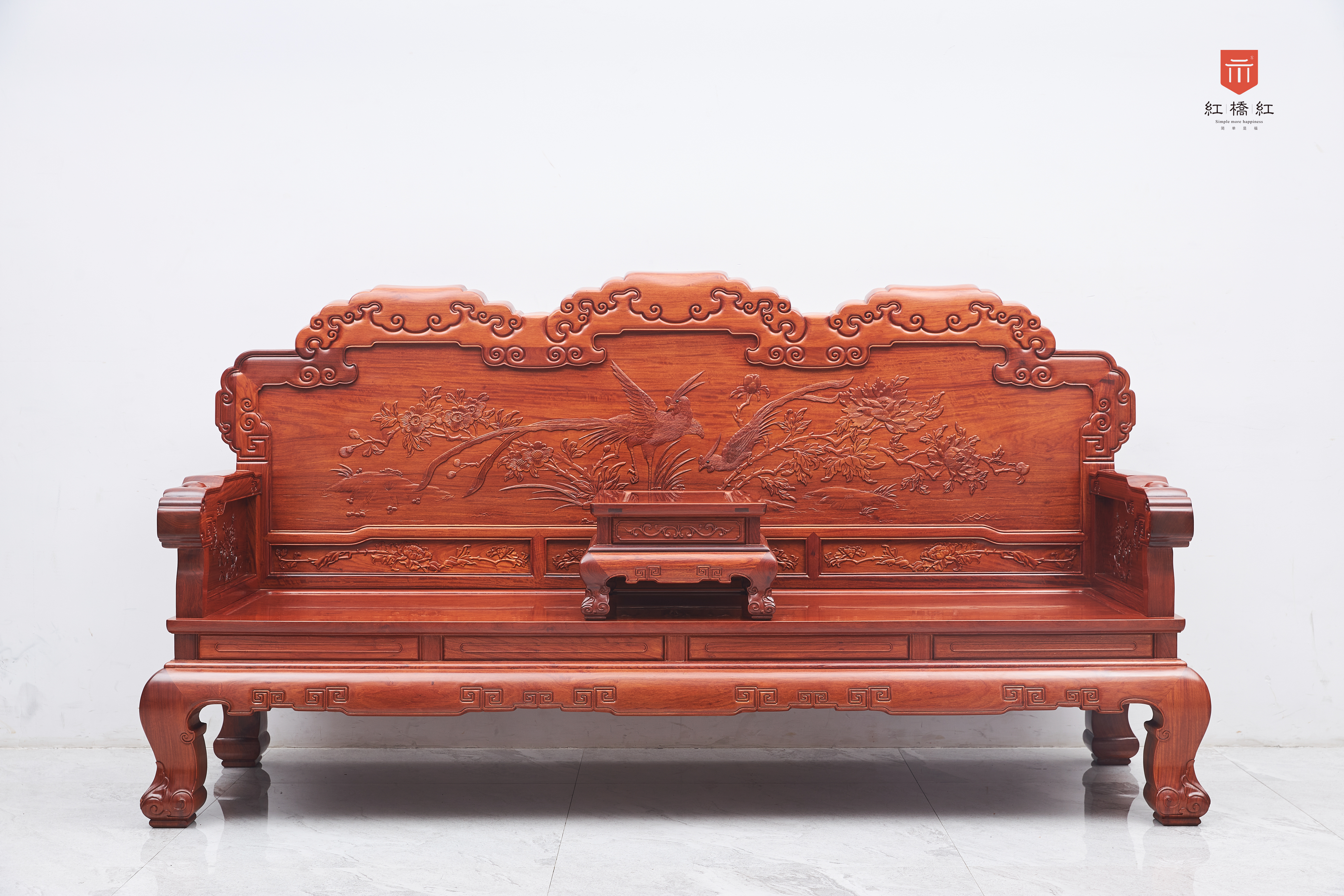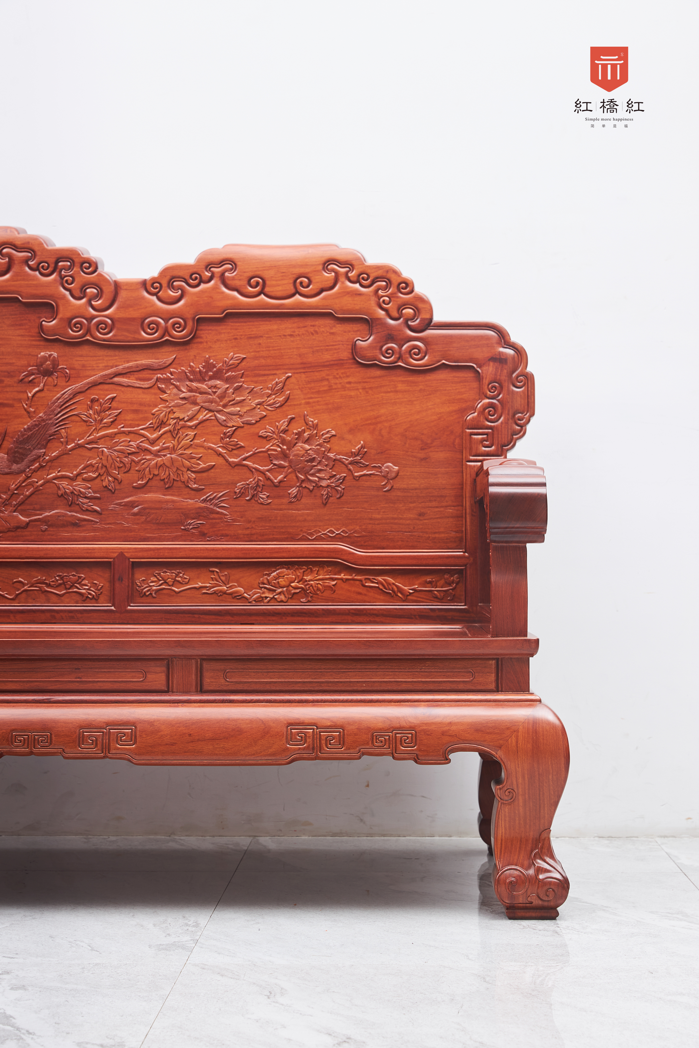 这款沙发背板雕刻以凤凰和牡丹为主题,两者相结合代表着吉祥富贵,寓意美好,厚实扶手,内外侧面板雕花,熠熠生辉,回形纹、卷草纹更添美感,恰当的高度和坐深,人体工程学设计,用准确的数据,制造出符合人体坐姿的沙发,传统手工艺,榫卯结构,造型厚实沉稳,真材实料,经久耐用,经得起岁月的考验,具有收藏价值,可世代传承。