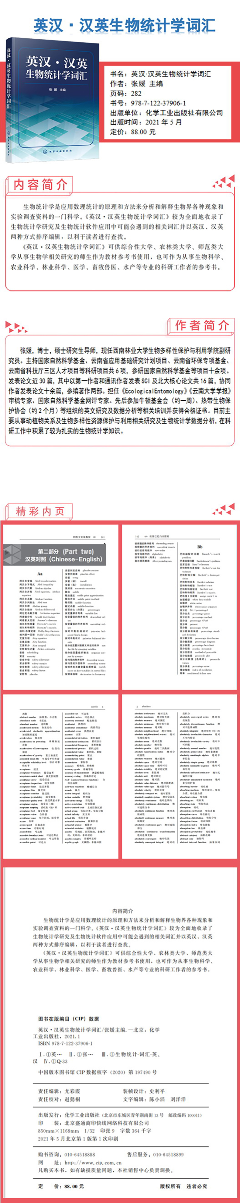 生物统计学是应用数理统计的原理和方法来分析和解释生物界各种现象和实验调查资料的一门科学。本书较为全面地收录了生物统计学研究及生物统计软件应用中可能会遇到的相关词汇约20000条,词汇以英-汉,汉-英两种方式排序编辑,以利于读者进行查找。本书可供综合性大学、农林类大学、师范类大学从事生物学相关研究的学生作为教参使用,也可作为从事生物科学、农业科学、林业科学、医学、畜牧兽医、水产等专业的科研工作者、教师和研究生的参考书。