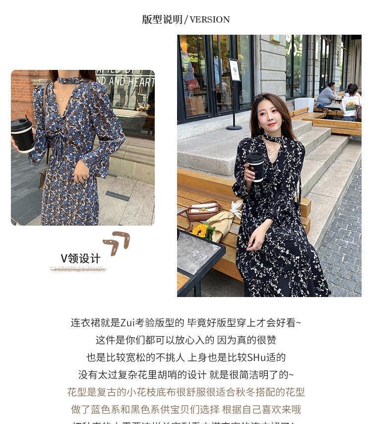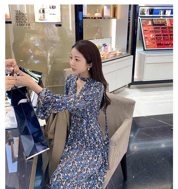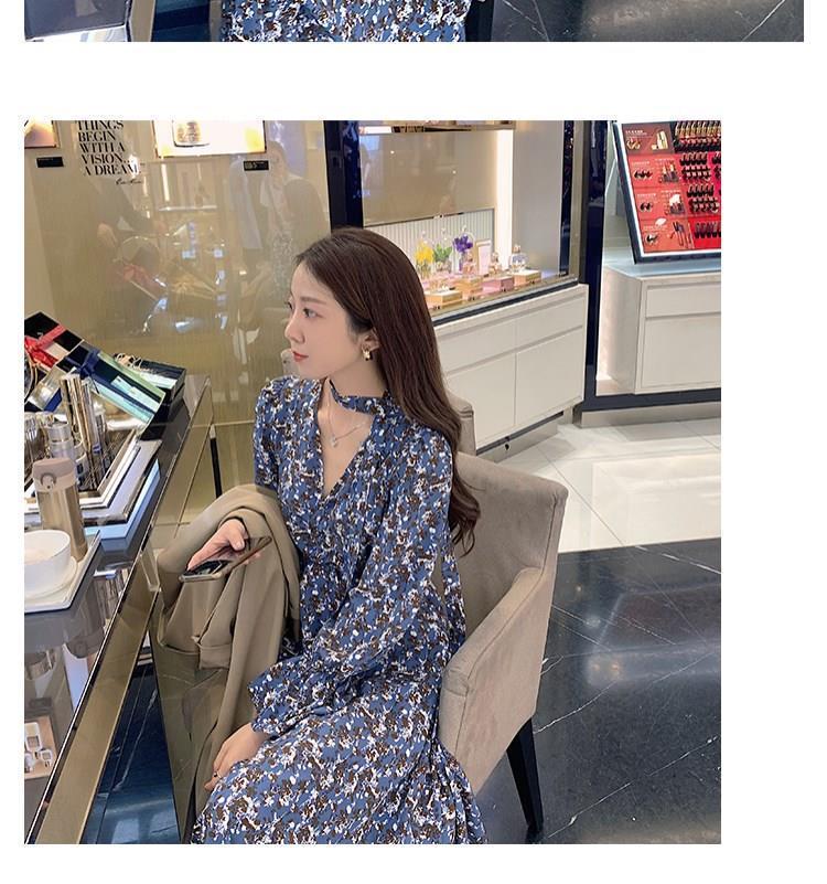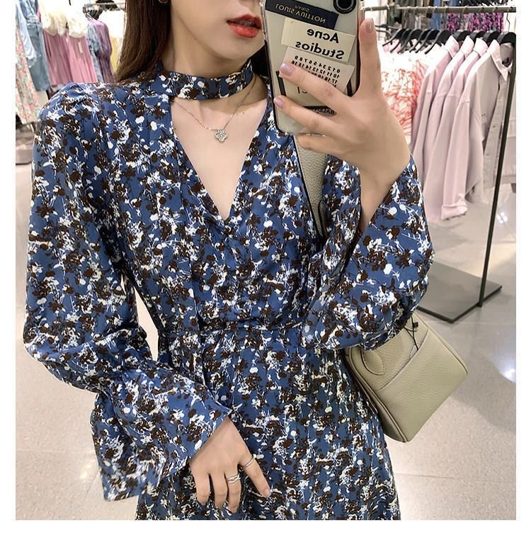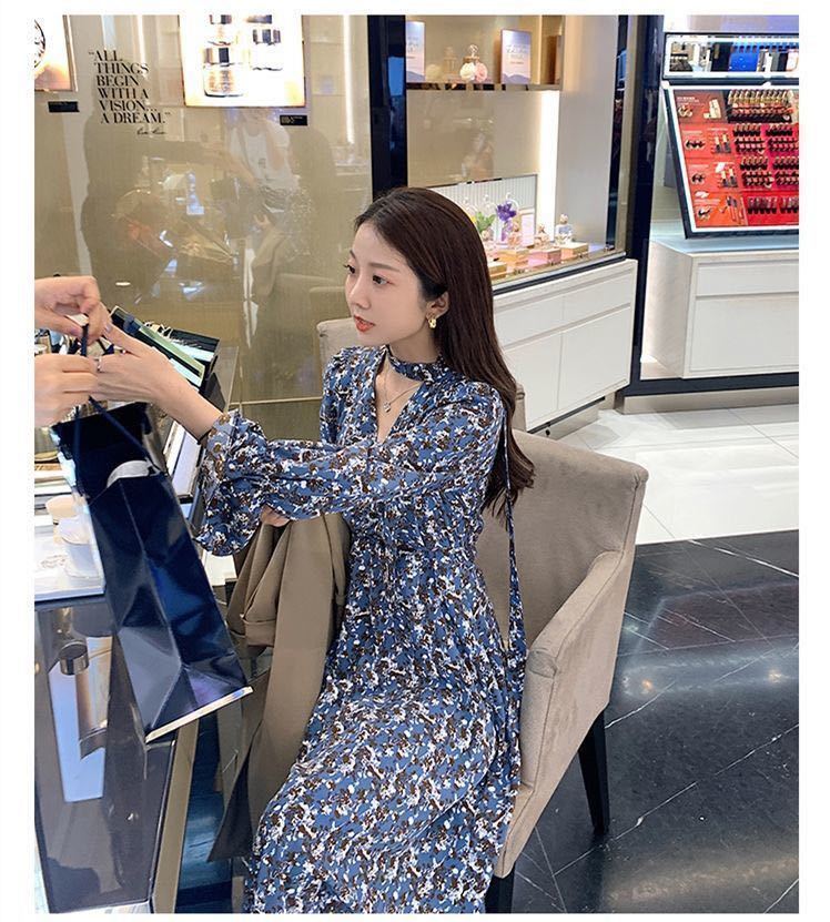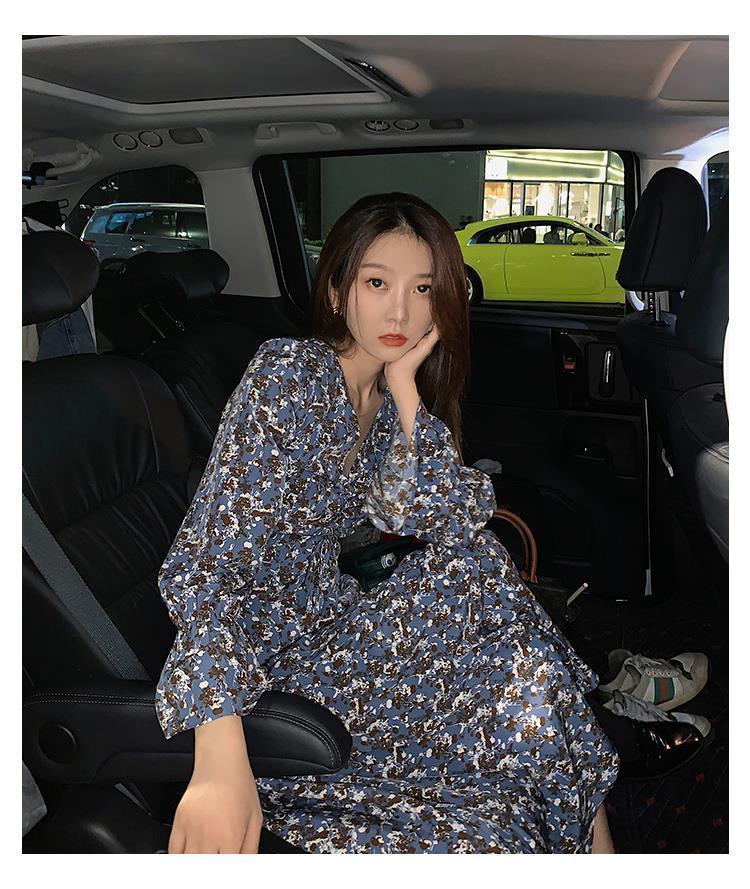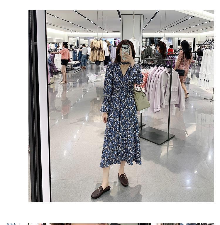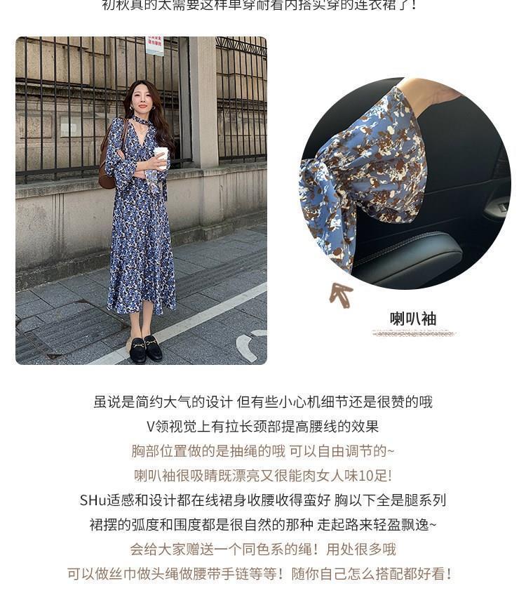 雪纺碎花v领长袖连衣裙女2021新款收腰显瘦气质喇叭袖中长款裙子