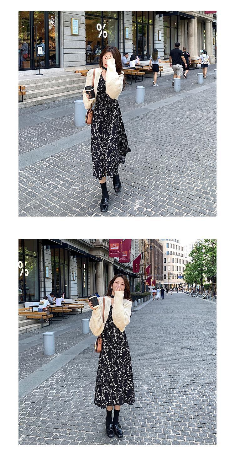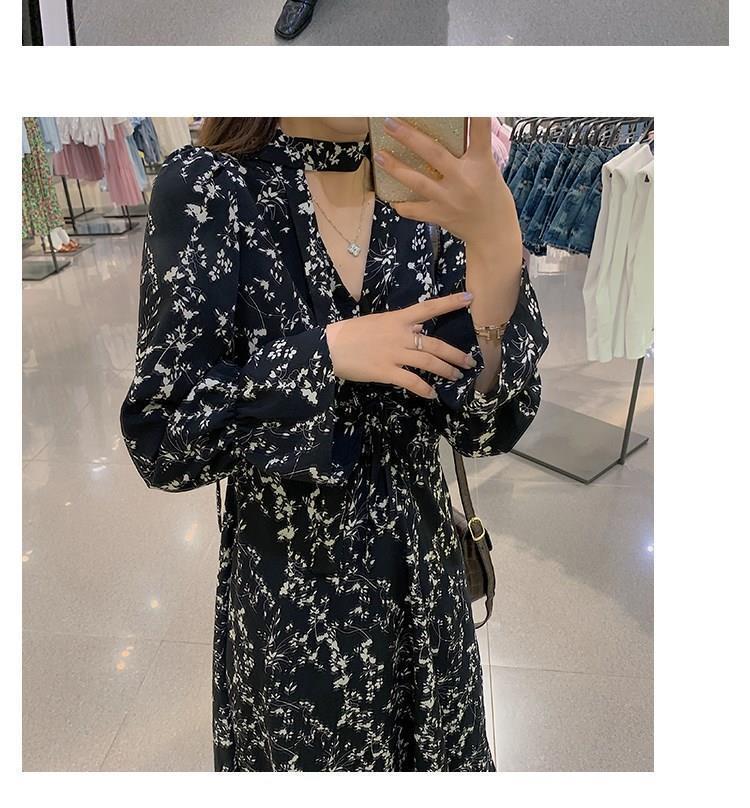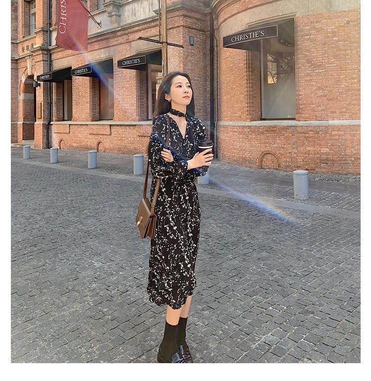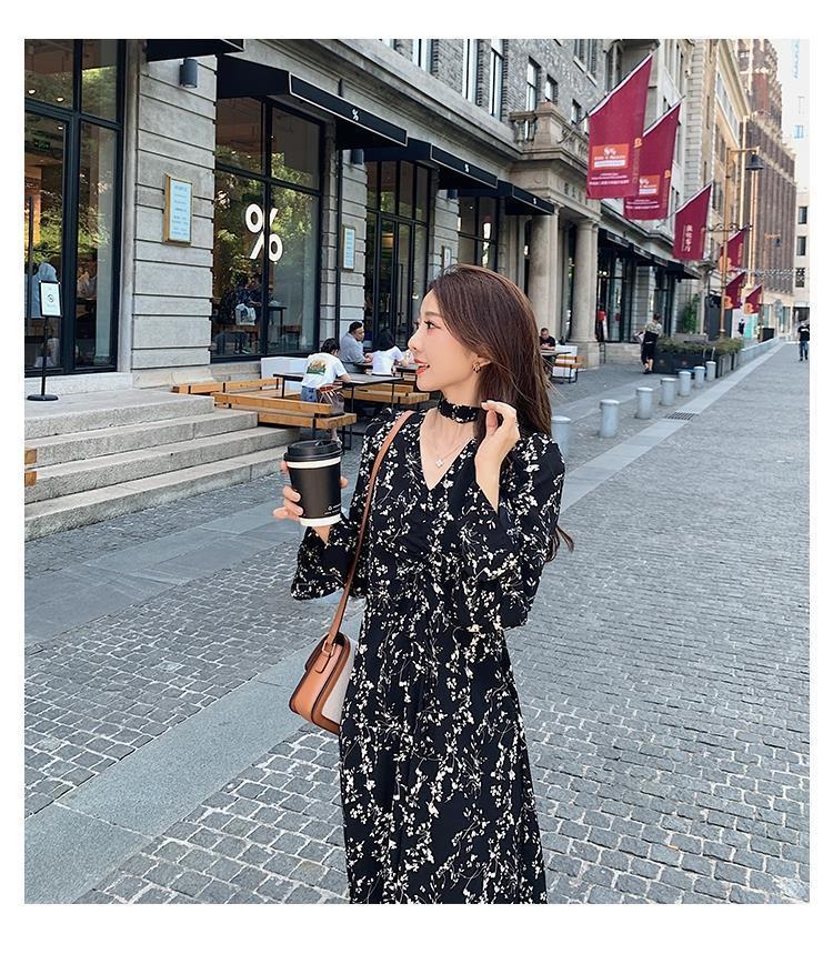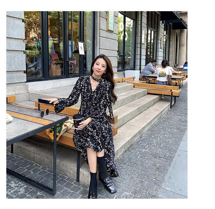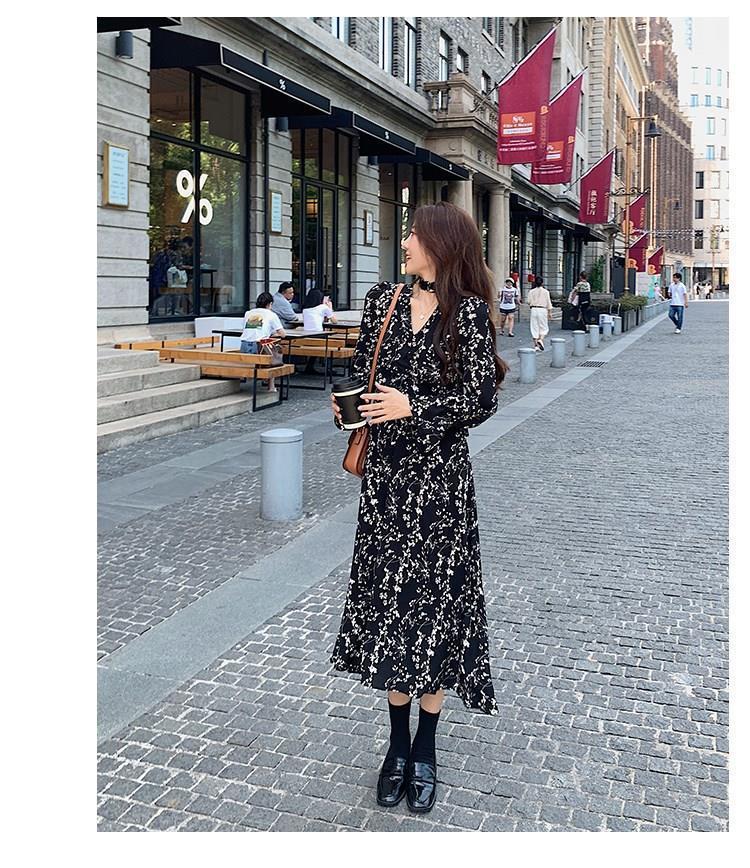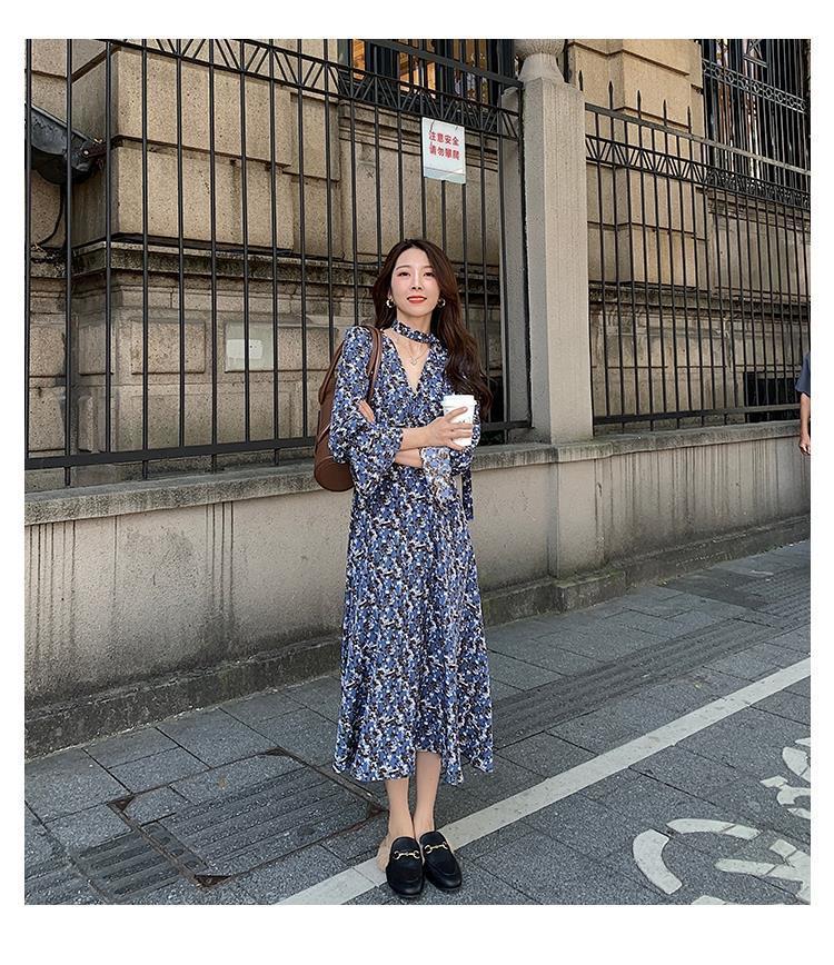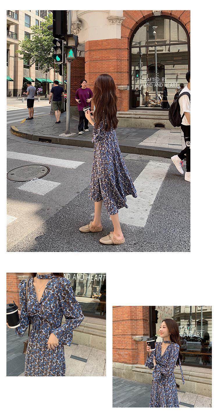 雪纺碎花v领长袖连衣裙女2021新款收腰显瘦气质喇叭袖中长款裙子