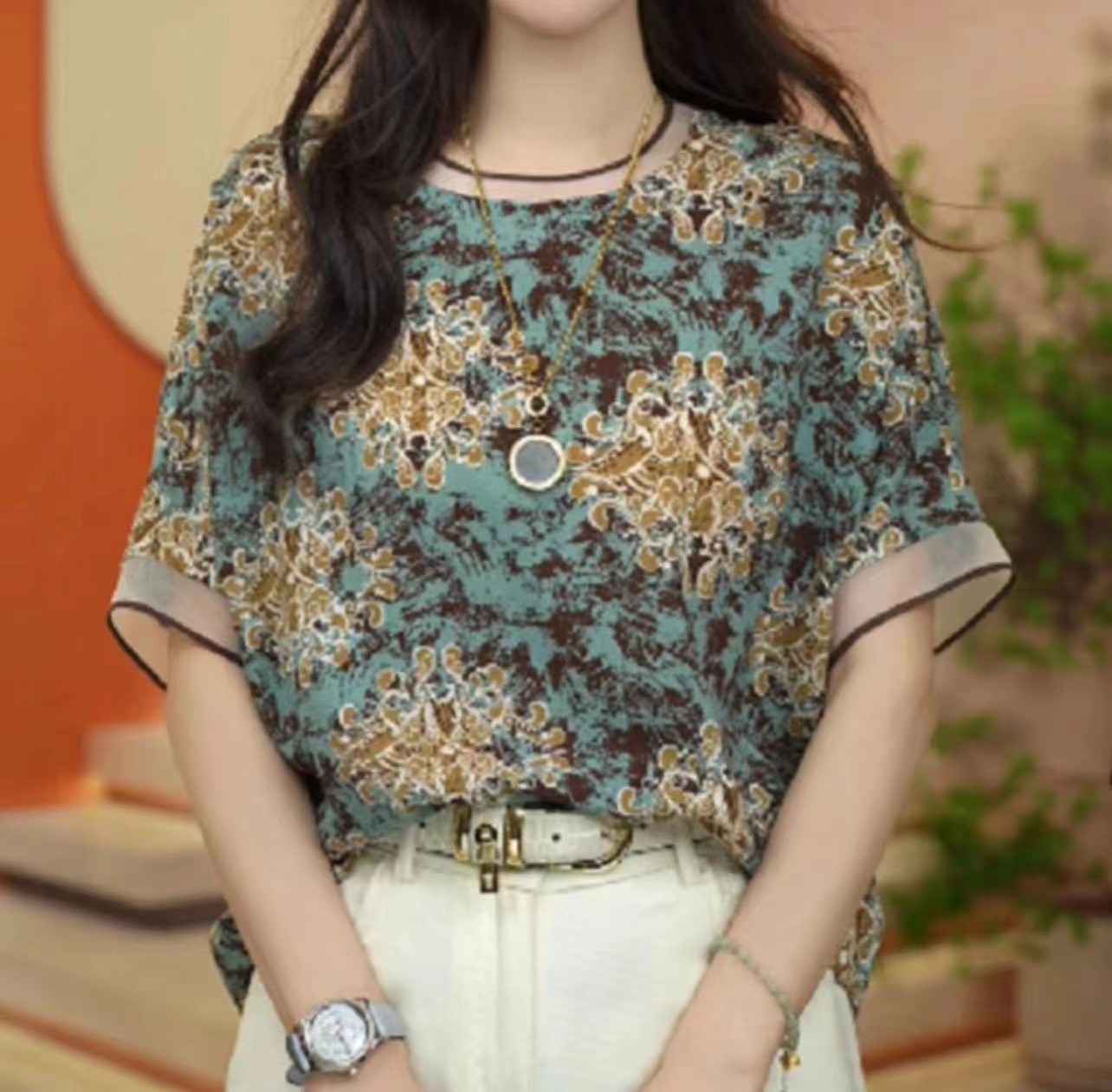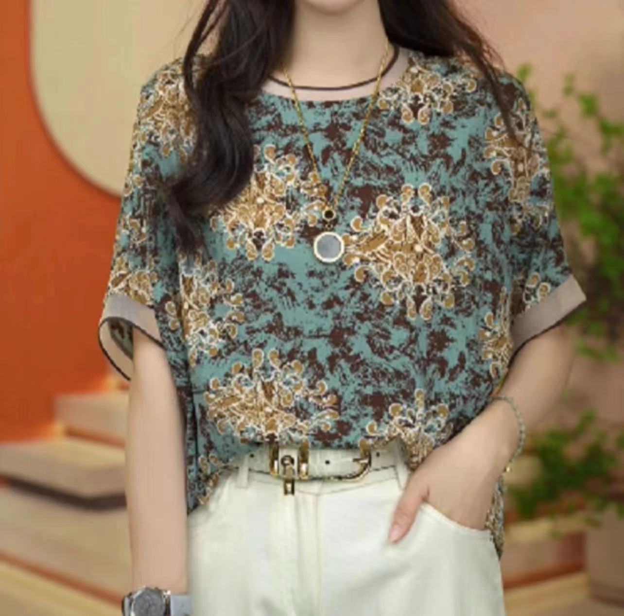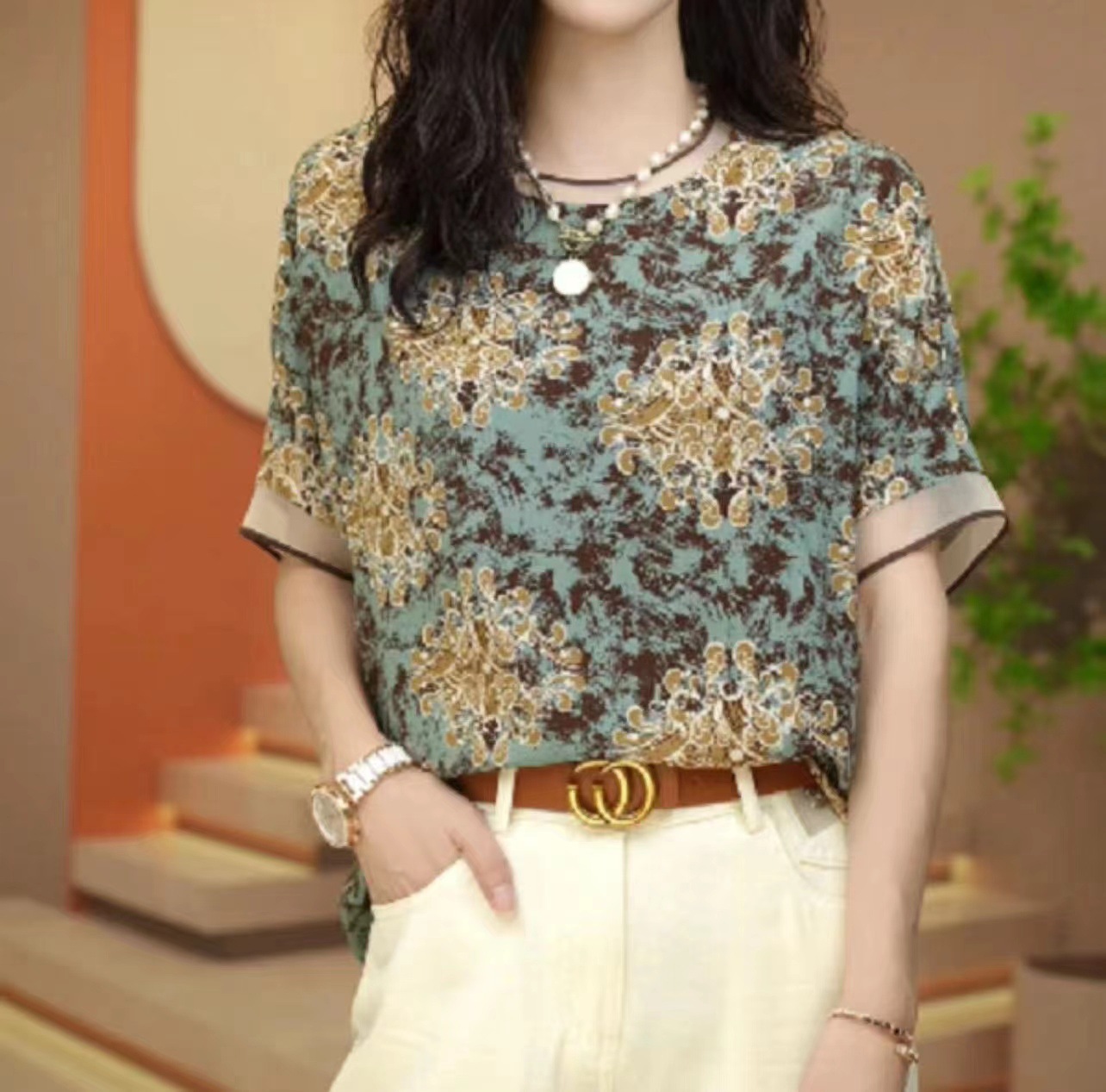 雀说新中式复古印花T恤新款高级感洋气时尚百搭显瘦圆领上衣AL2280