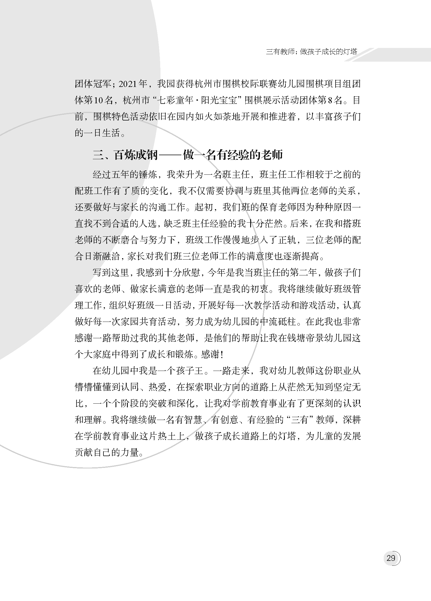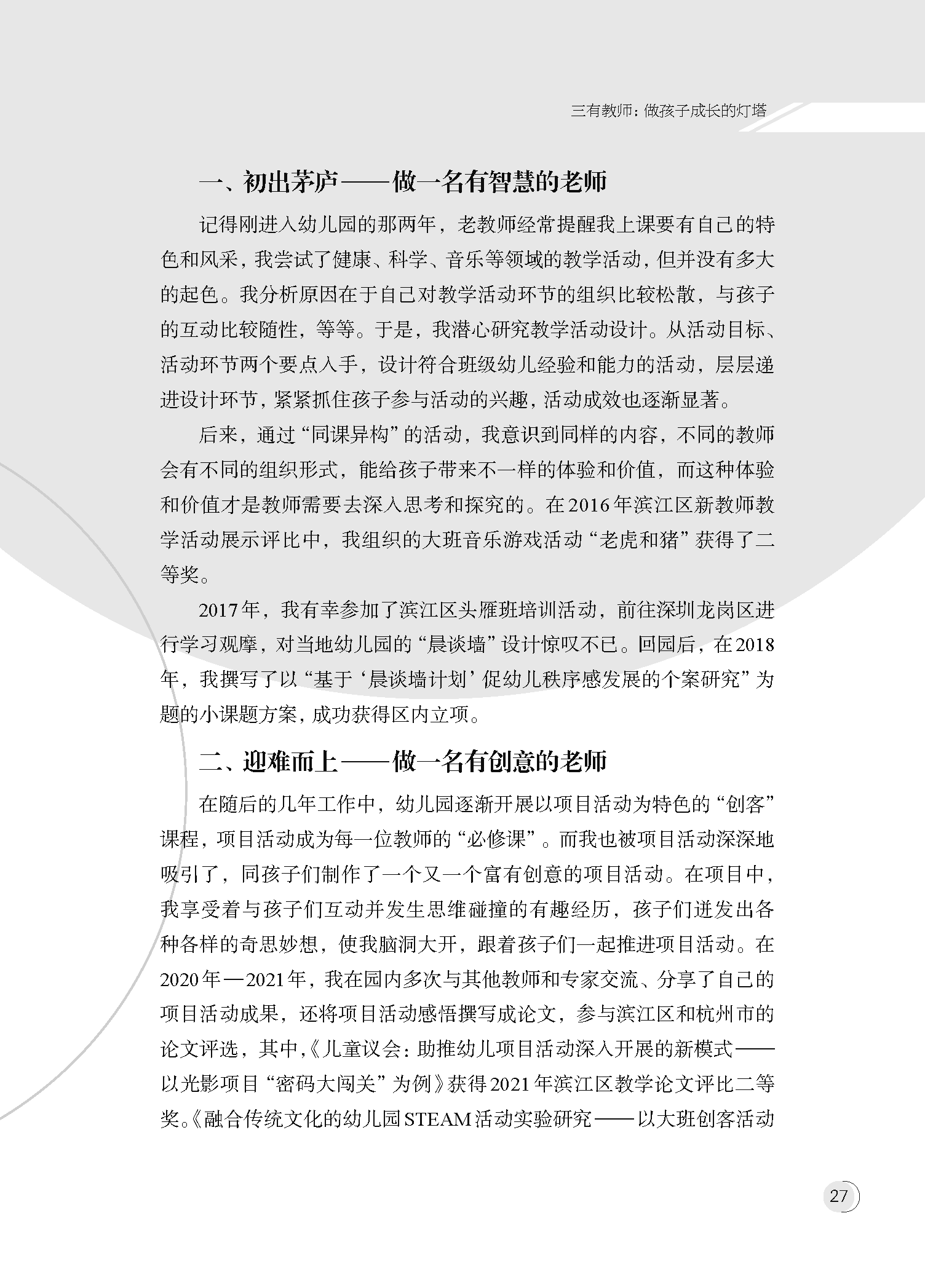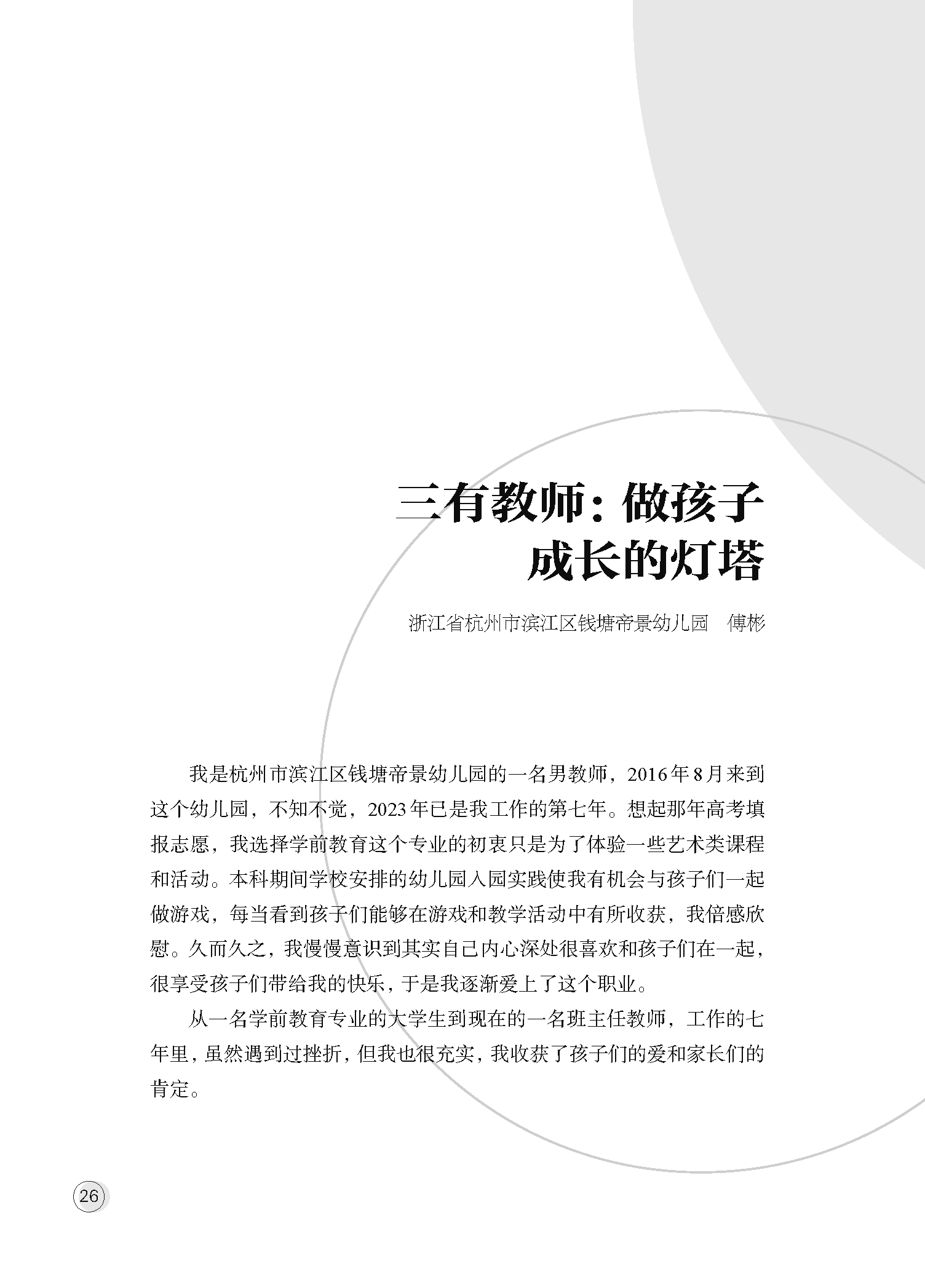 基于上述原因,本书的编纂具有特别的时代意义。据我所知,本书是我国第一部全面反映幼儿园男教师职场生活的故事集,它将镜头聚焦于中国幼儿园男教师的职场生存状态与鲜活感受,力图清晰、真实地构筑“中国男幼师”群像,以激起全社会对这一独立而独特的群体的关注、关心与支持,从而更好地促进学前教育事业的高质量发展。