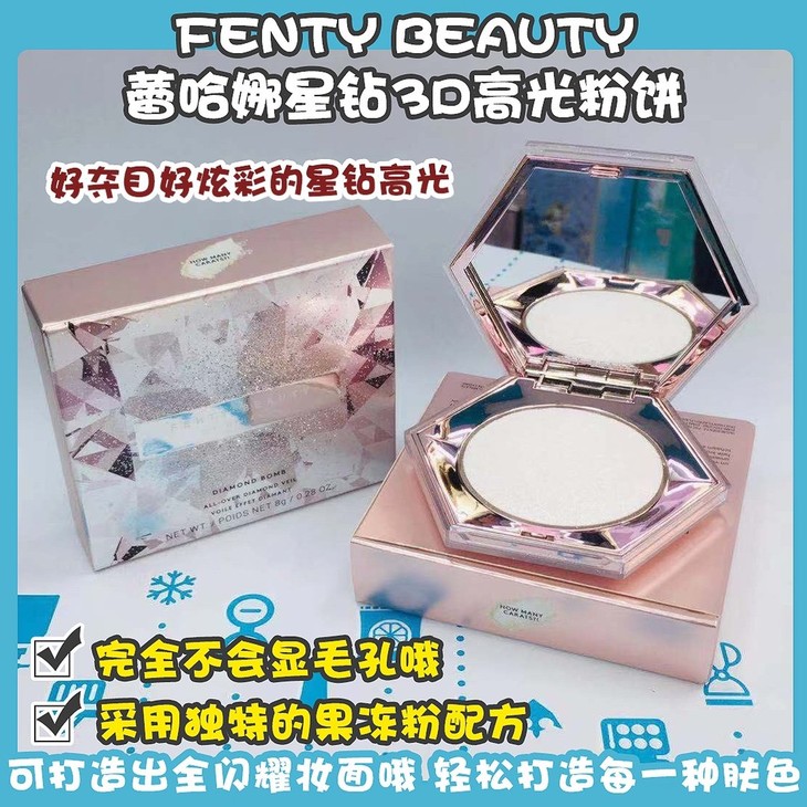 FENTY BEAUTY蕾哈娜星钻3D高光粉饼 👍好夺目好炫彩的星钻高光blingbling闪✨!质地是软糯土豆泥质地☁,完全不会显毛孔哦😇,叠在腮红上面显得皮肤超好💗,就是那种超嫩超想咬一口的肤质👯!还采用独特的果冻粉配方,有弹性,触感凉爽🍃,贴合肌肤。这款高光具有百分百的纯净光泽💫,可打造出全闪耀妆面哦,轻松打造每一种肤色❣