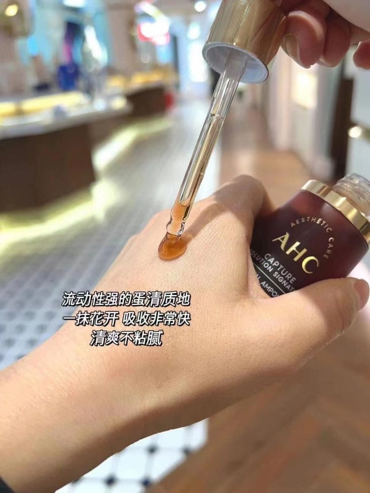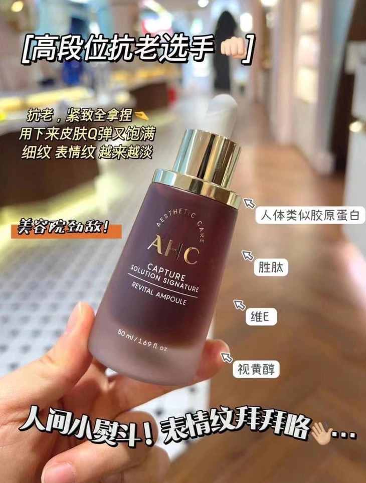 👑AHC抗皱紧緻精华50ml 👍“小熨斗”安瓶精华 💥富含:胶原蛋白、胜肽、维E及AHC独家配方 ✅功效:抗老、紧致肌肤 💦红棕色蛋清质地,流动性很强、一抹化开,清爽不粘腻 💧适合:初老肌