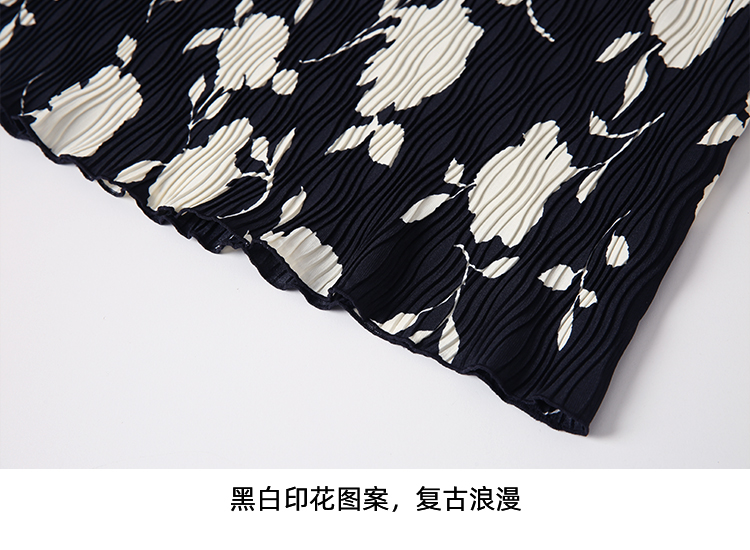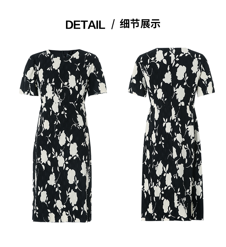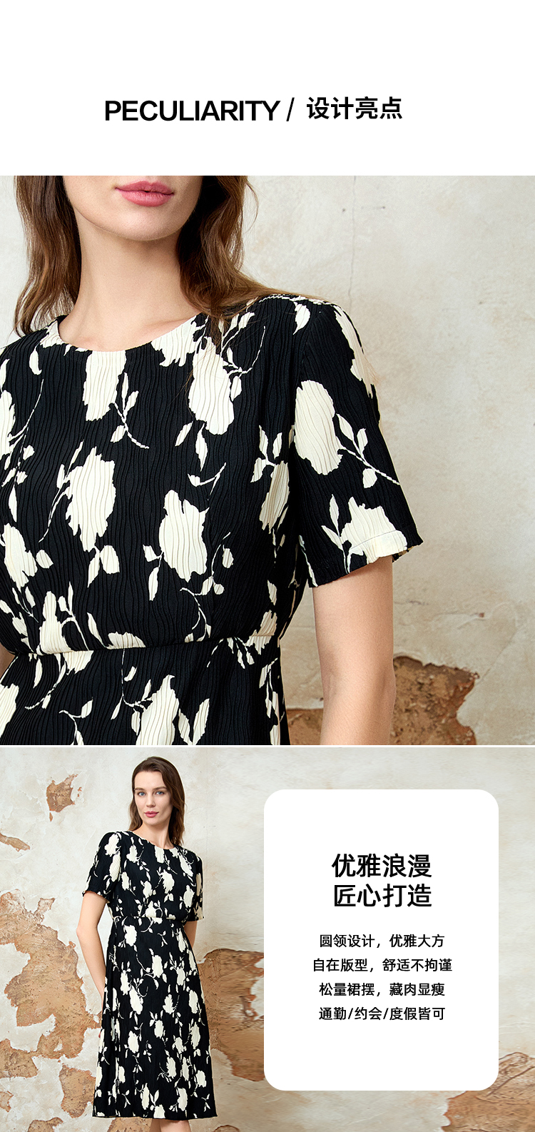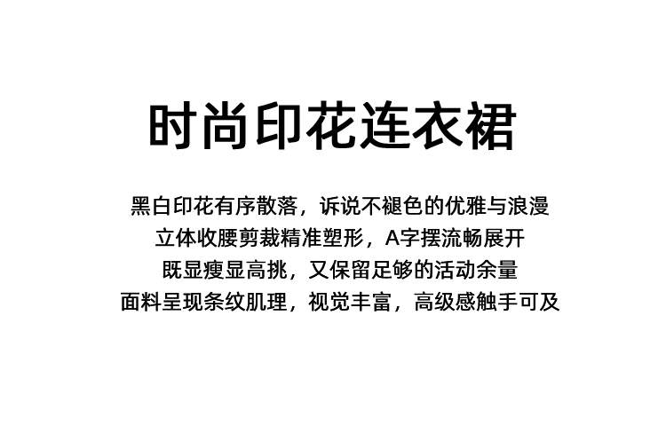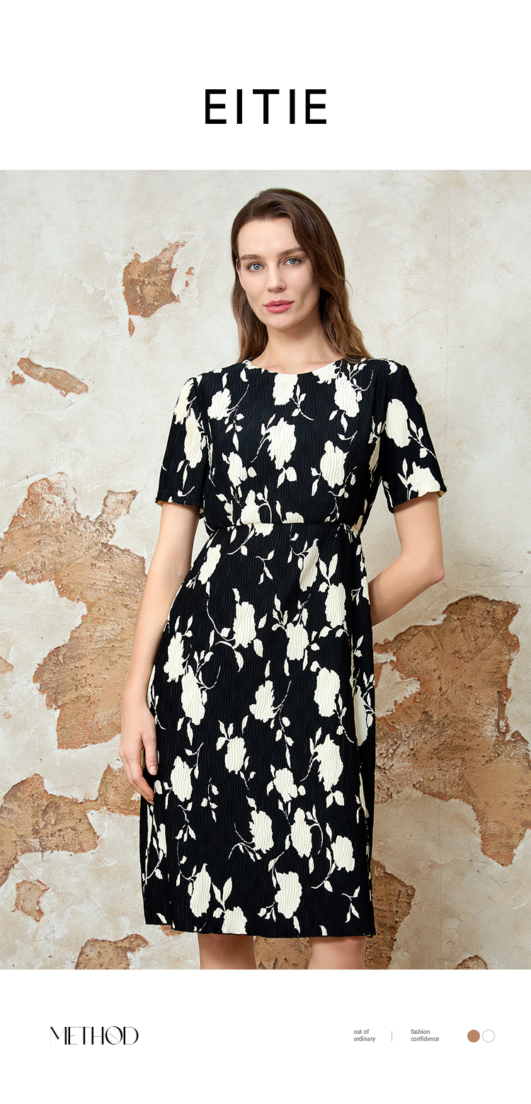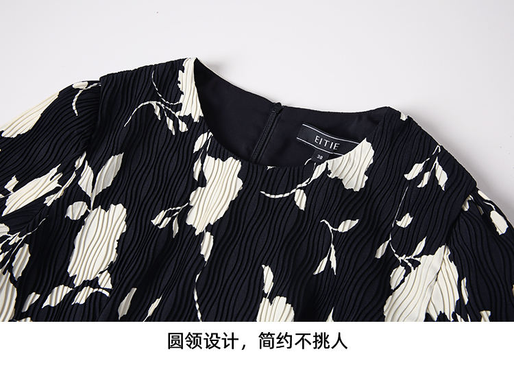 EITIE爱特爱高级气质圆领高腰a字黑白印花连衣裙春新款8107814