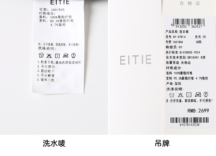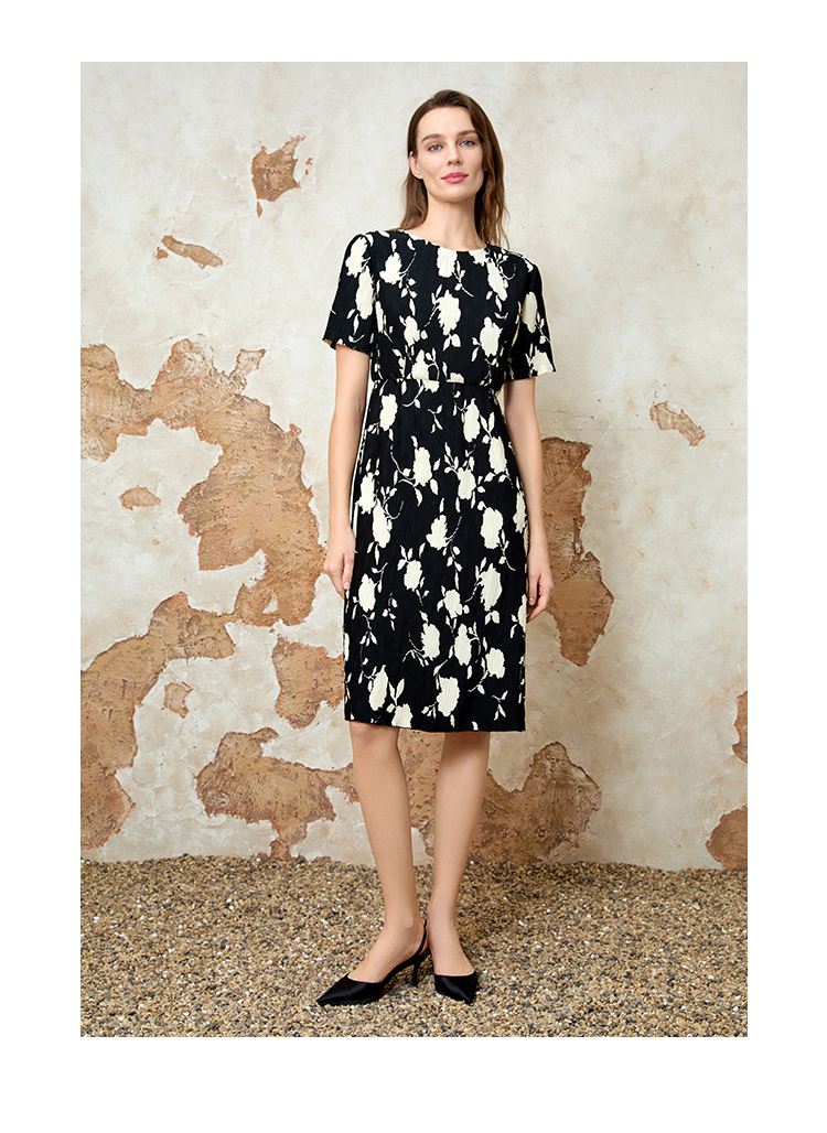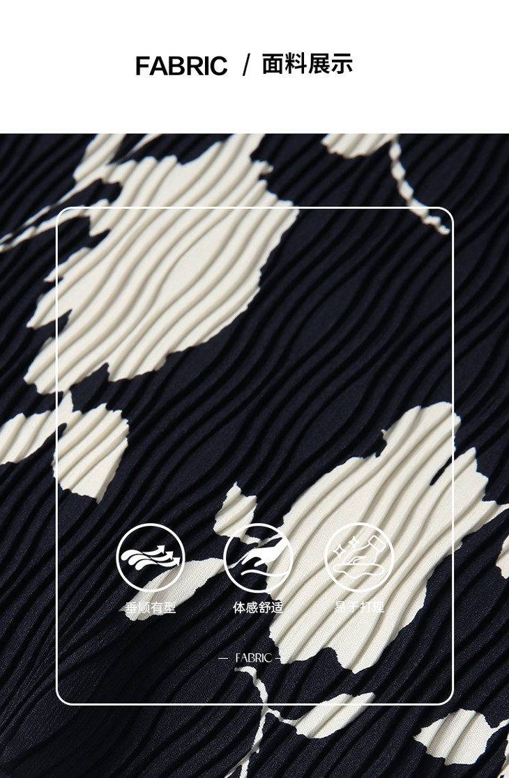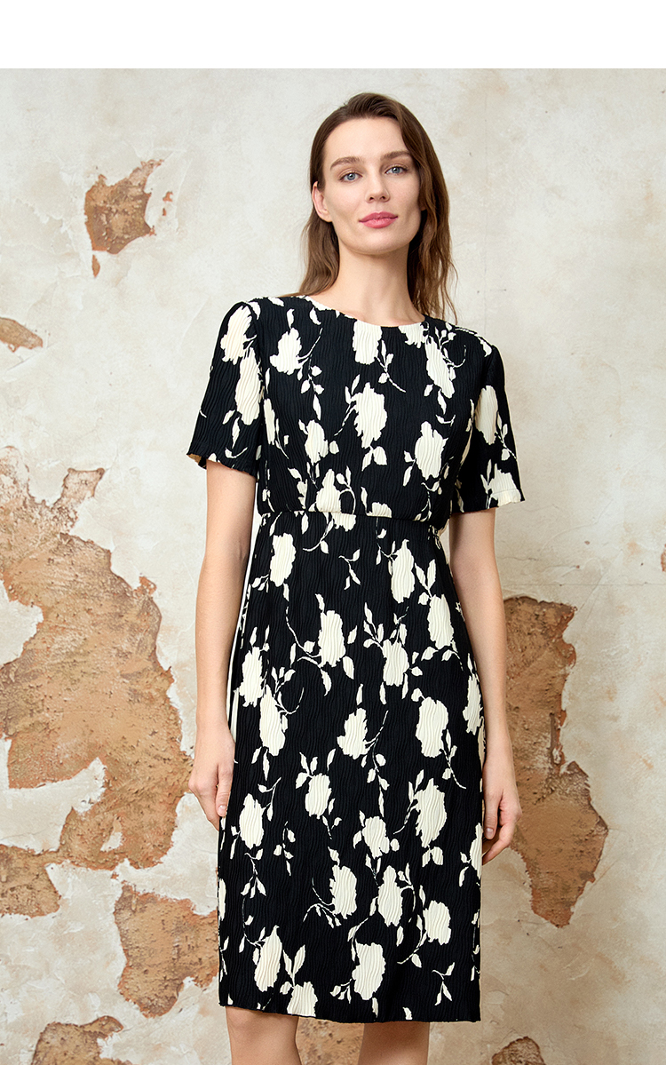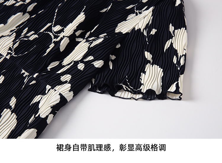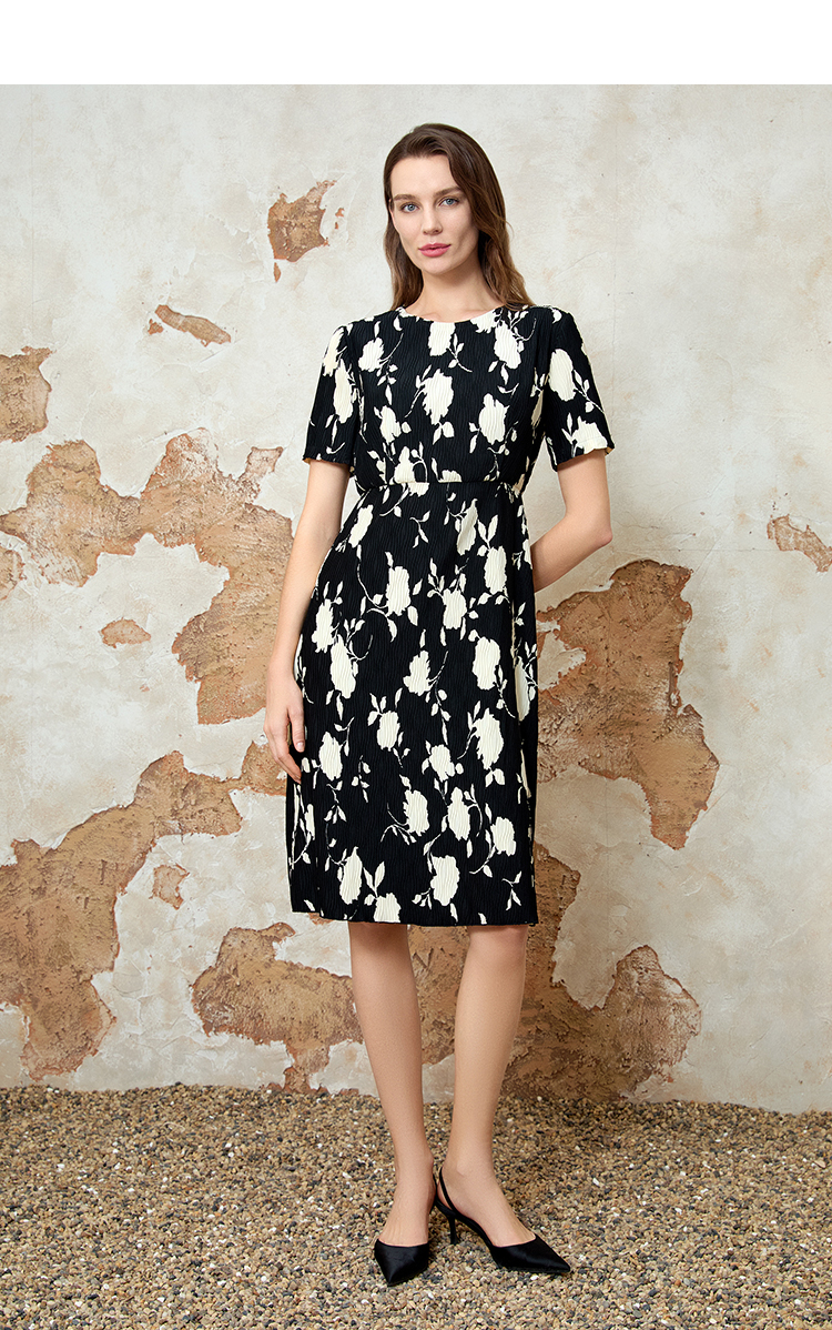 EITIE爱特爱高级气质圆领高腰a字黑白印花连衣裙春新款8107814