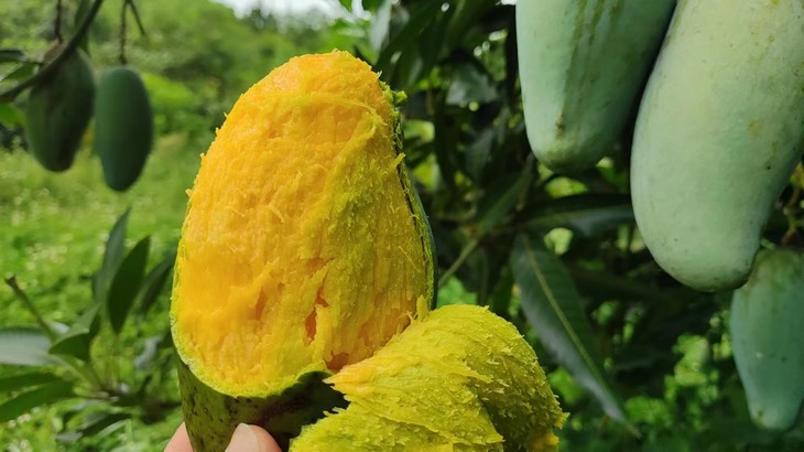 除了火龙果和青柚,玉大哥还生态种植了芒果,2022年接手已撂荒3年的果园,开始生态种植,水源为河水和雨水,不使用任何化学合成的农药、化肥、植物生长调节剂、除草剂等化学投入品。