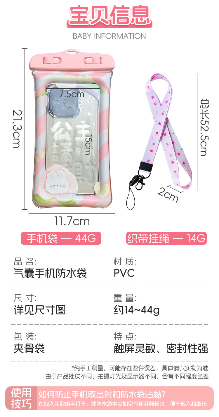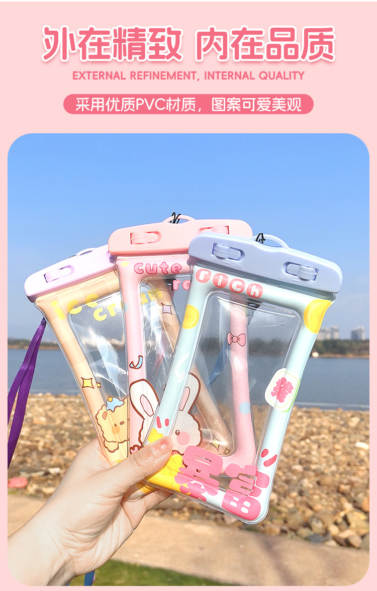 【密封性强,自带挂绳,安全实用】简约可爱卡通手机防水袋 气囊可触屏保护套 漂流游泳手机袋防水-QQ