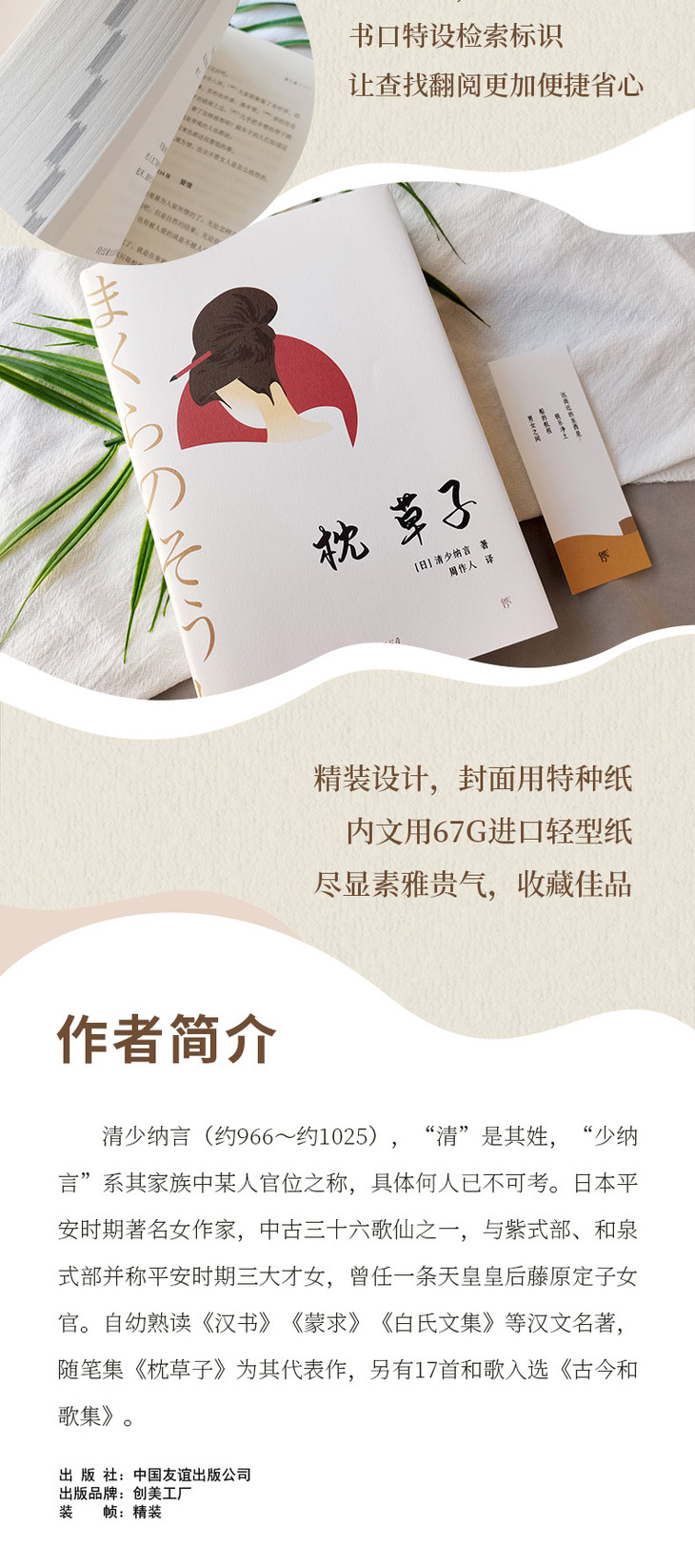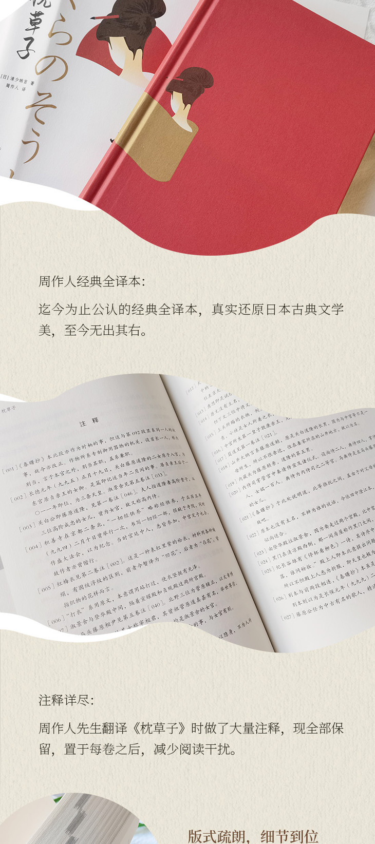 4.注释详尽:周作人先生翻译《枕草子》时做了大量注释,现全部保留,置于每卷之后,减少阅读干扰。