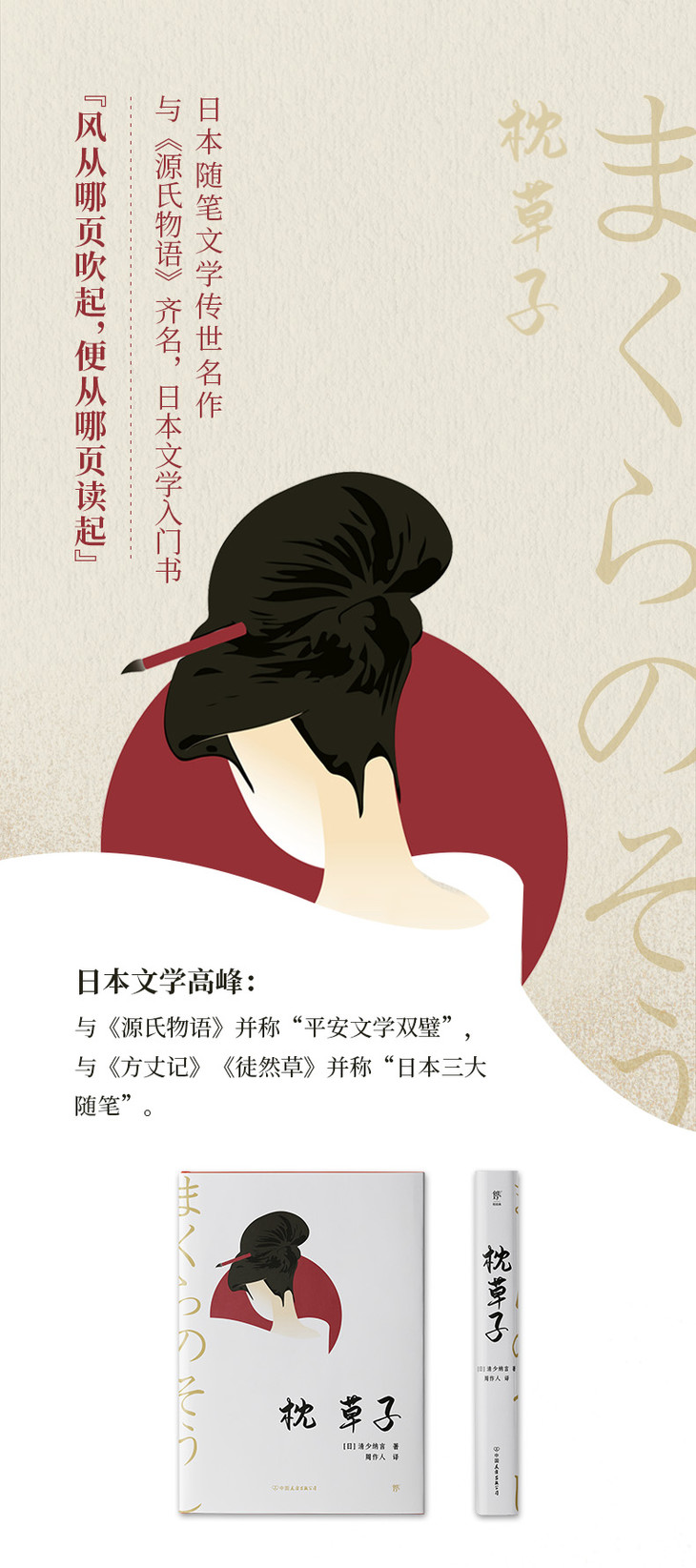 《枕草子》开日本随笔文学之先河,约成书于1001年,是日本平安时期女作家清少纳言的代表作,与《源氏物语》齐名,被誉为日本平安时代文学中的双璧。也与后来出现的《方丈记》《徒然草》二书,并称日本文学三大随笔。全书分20卷,共305段,分类聚、日记和随想三大内容,多是她在宫廷任职期间的所见所闻,感情细腻,文笔清淡,其真实性和随意性处处可见。所谓“风从哪页吹起,便从哪页读起”,便是本书的魅力所在。