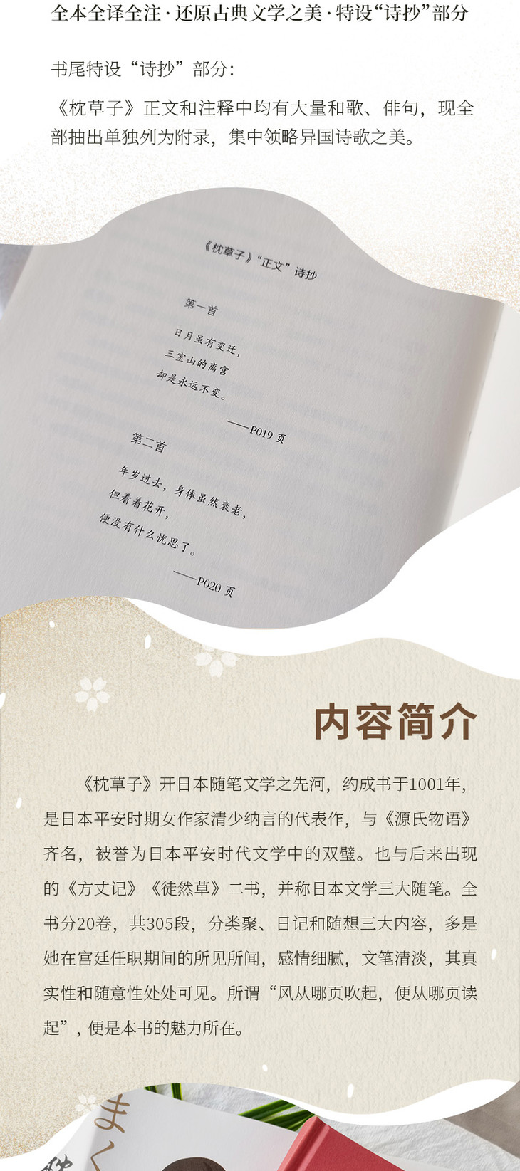 2.书尾特设“诗抄”部分:《枕草子》正文和注释中均有大量和歌、俳句,现全部抽出单独列为附录,集中领略异国诗歌之美。