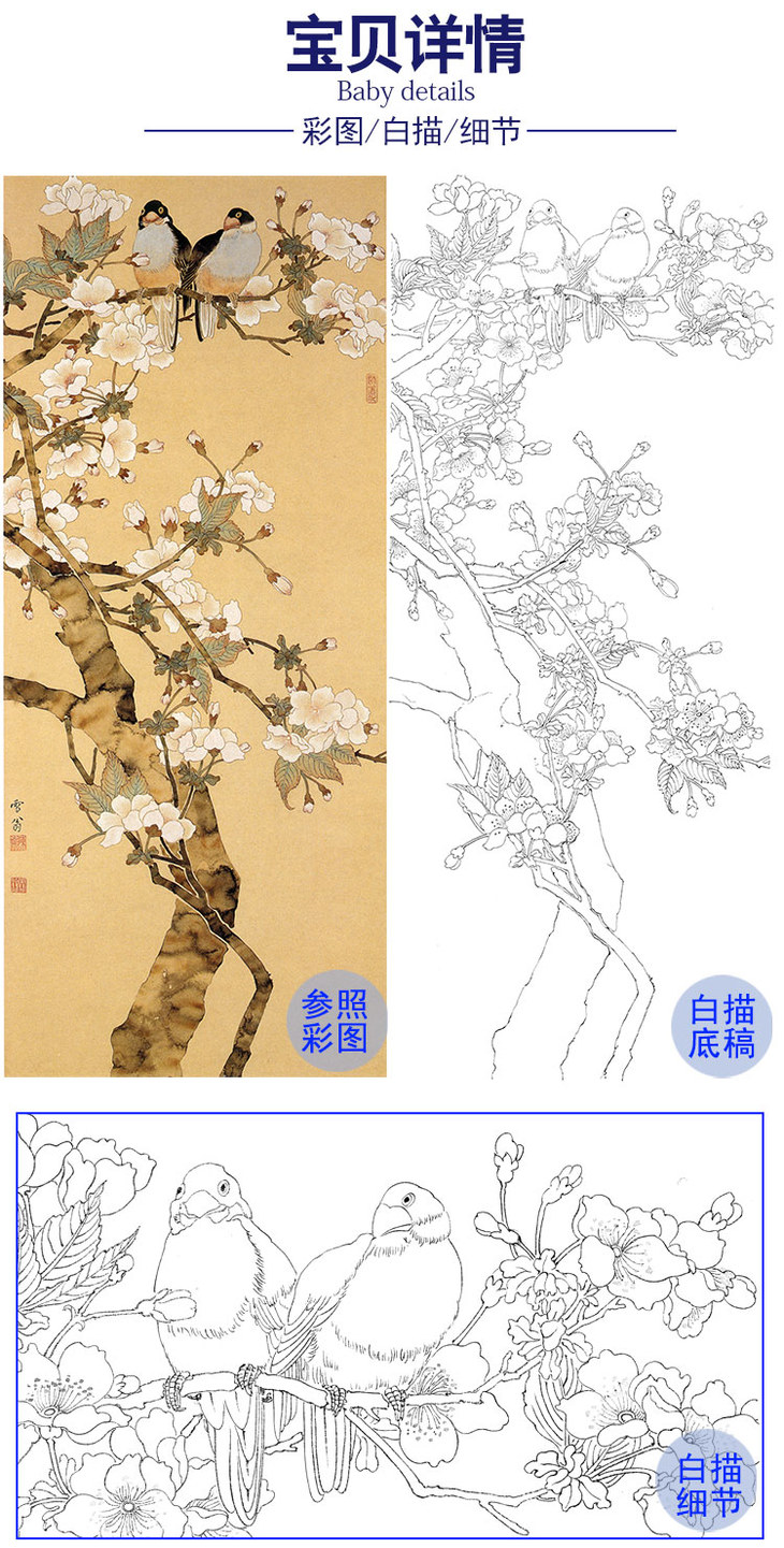 陈之佛竖幅工笔花鸟白描底稿-樱花小鸟-QA84