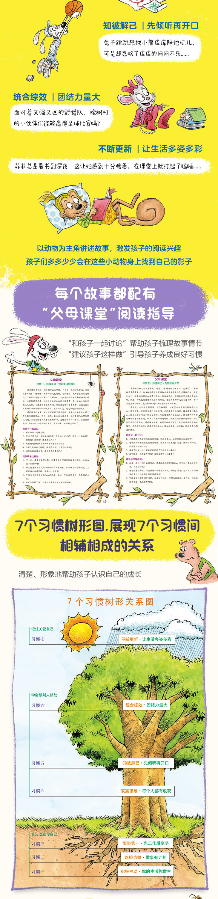对应习惯的7个有趣故事,贴近孩子生活;每个故事都配有相应的讨论问题和阅读指导,适合亲子讨论