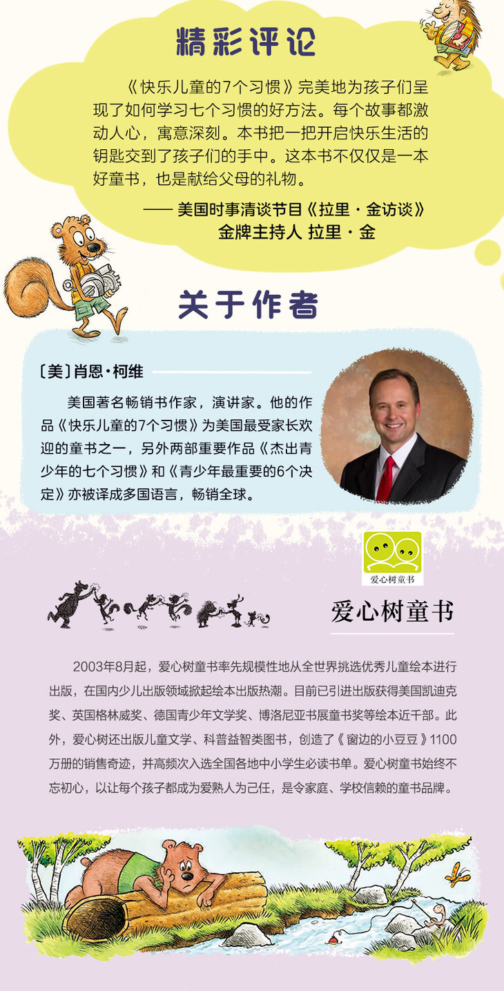《快乐儿童的7个习惯》完mei地为孩子们呈现了如何学习七个习惯的好方法。每个故事都激动人心,寓意深刻。本书把一把开启快乐生活的钥匙交到了孩子们的手中。这本书不仅仅是一本好童书,也是献给父母的礼物。——美国时事清谈节目《拉里·金访谈》jin牌主持人 拉里·金