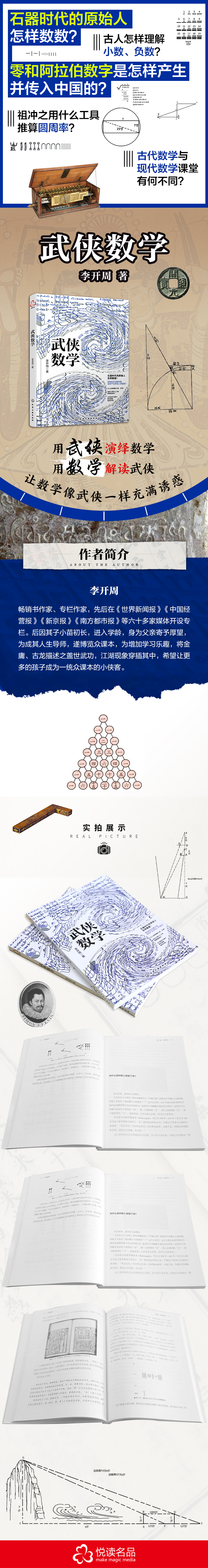 石器时代的原始人怎样数数?零和阿拉伯数字是怎样产生并传入中国的?古人怎样理解小数和负数?祖冲之用什么工具推算圆周率?数学的推算有什么实际功能,能带来什么样的乐趣?古代中国的数学在当时世界上有何独特之处,与现代数学课堂有哪些不同?这些问题,都可以由郭靖、黄蓉、杨过、小龙女等武侠人物来作答。