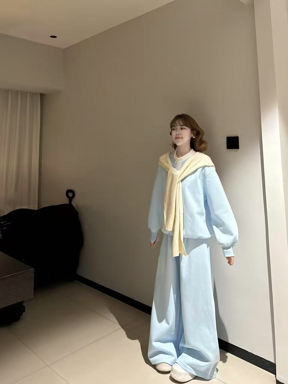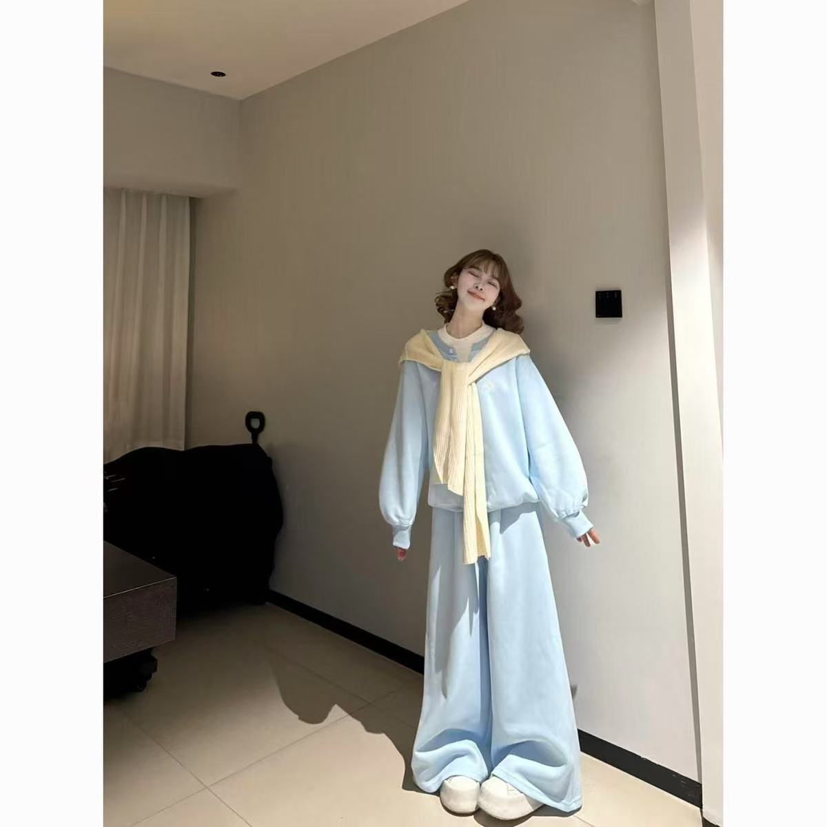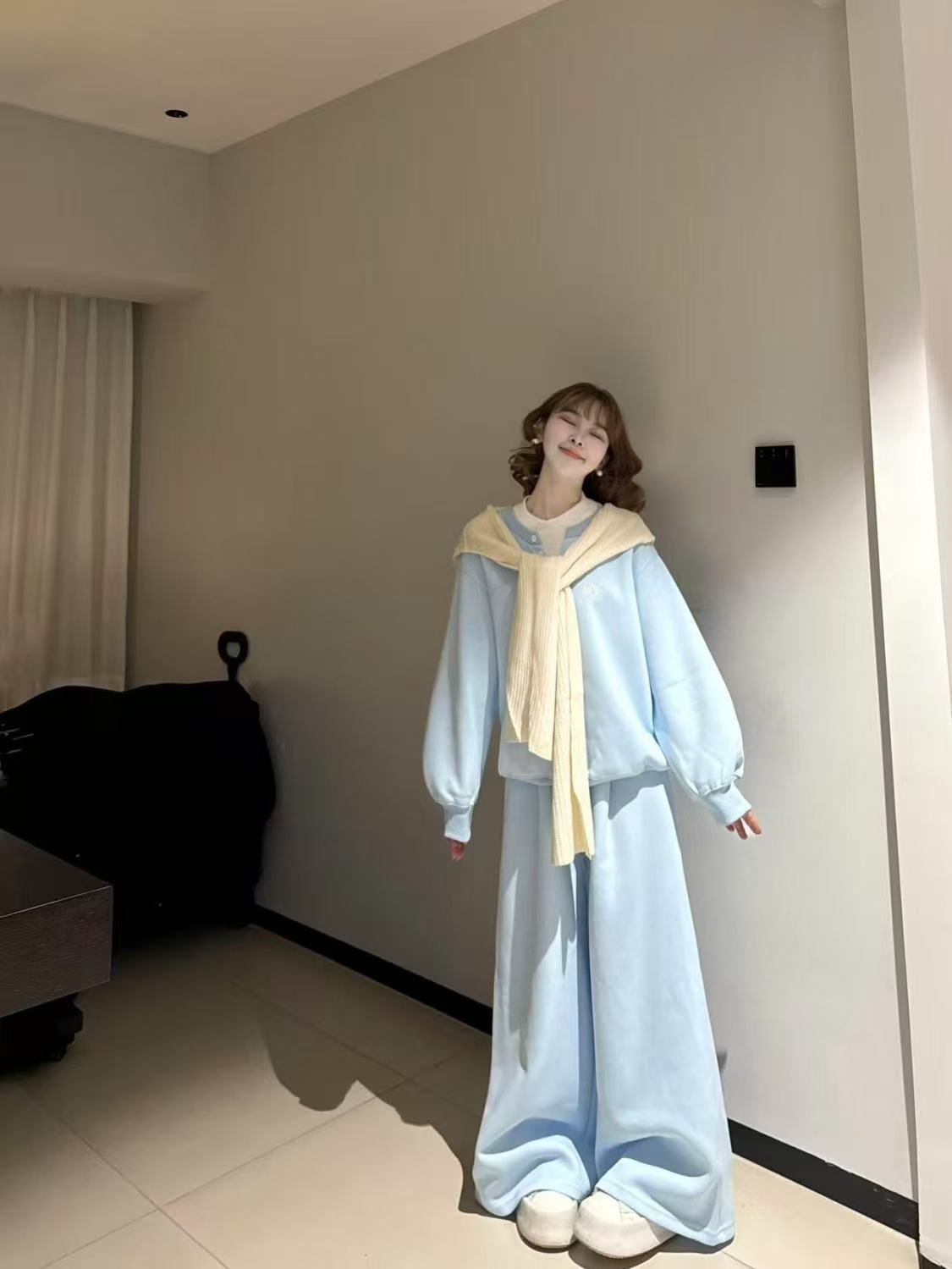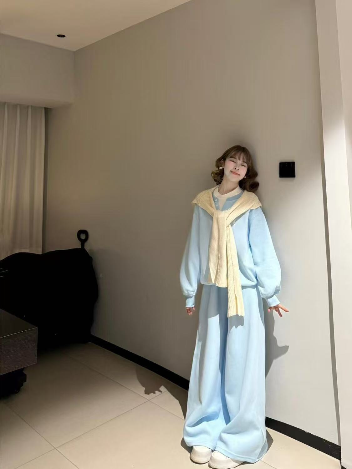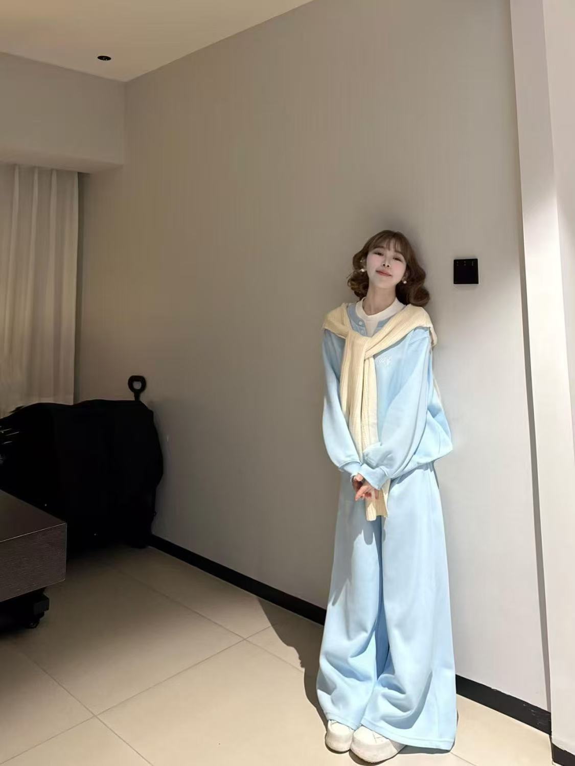 【懒人福音❗️柔软亲肤】蓝色带披肩长袖卫衣女套装2025秋冬新款慵懒宽松休闲运动三件套潮。jc