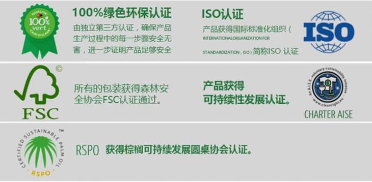 还经过了ISO认证、100%绿色环保认证、FSC认证、RSPO等安全认证,成分可以让你安心