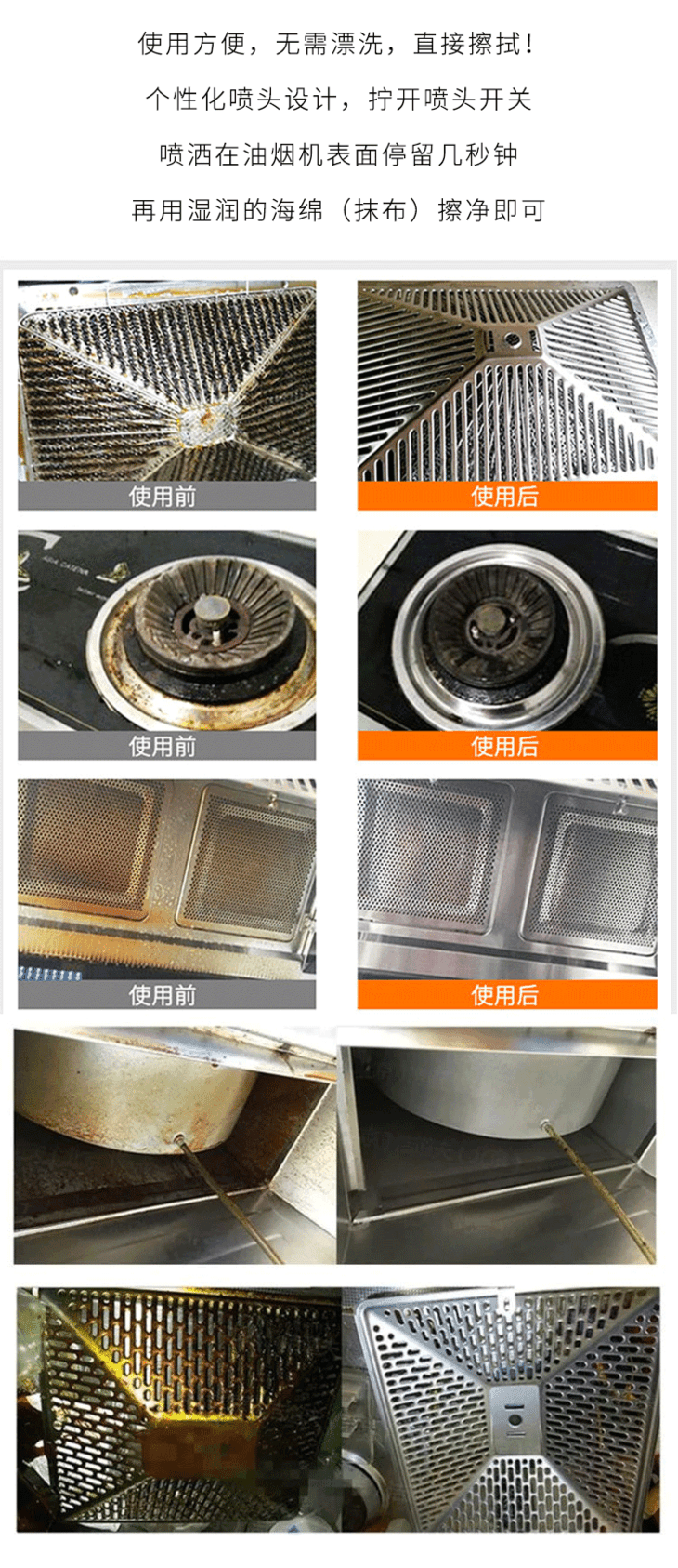 喷嘴设计,精确打击油污,使用方便,无需漂洗,直接擦拭!