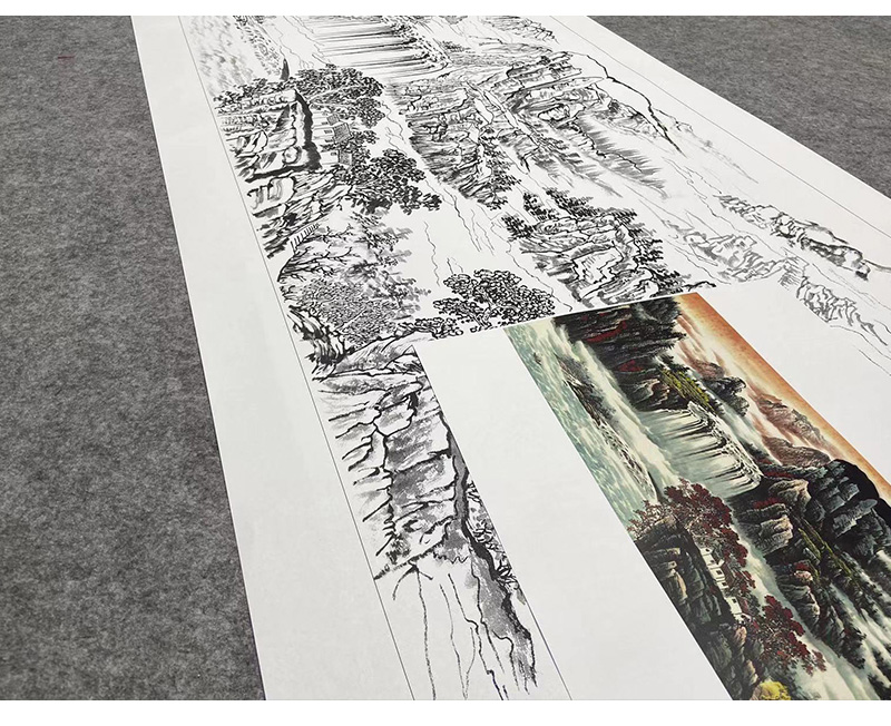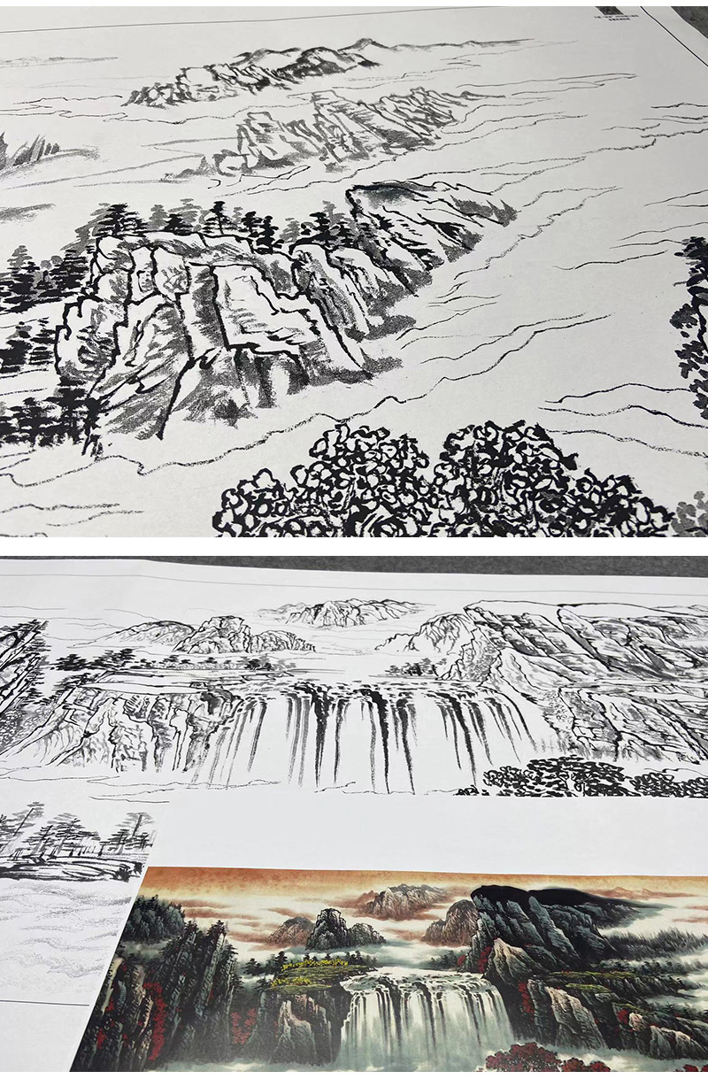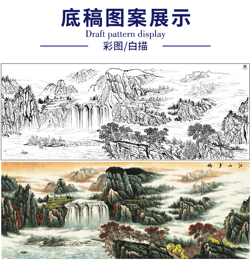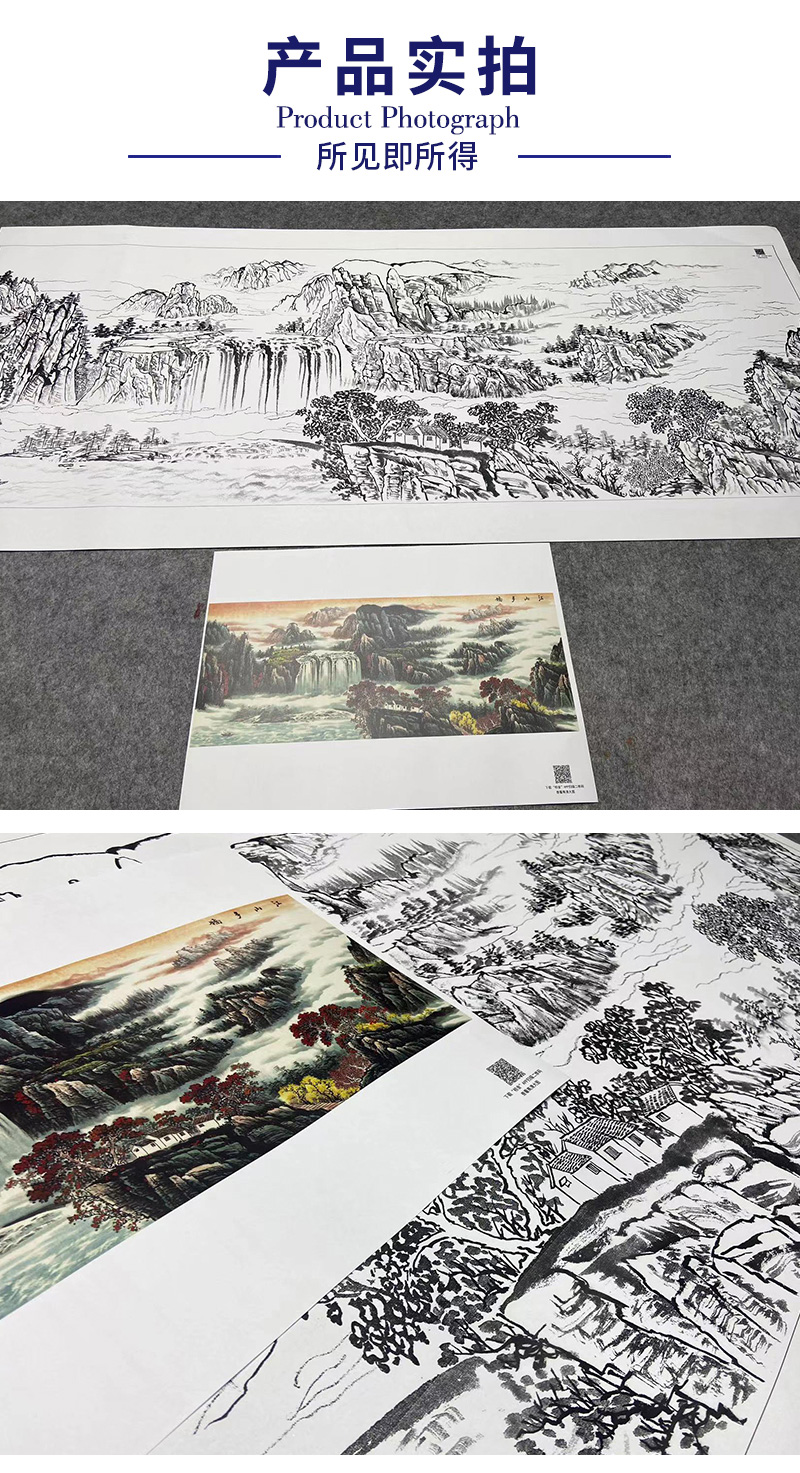 【大彩图】横幅工笔画白描底稿《江山多娇》临摹勾线山水线稿FS03