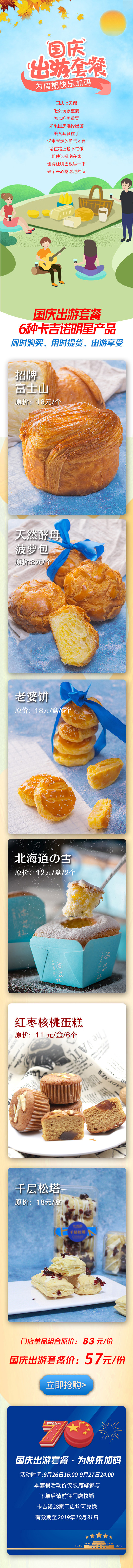 国庆出游套餐包括:天然酵母菠萝包1个、招牌富士山1个、老婆饼1盒(6个)、北海道の雪1盒(两个)、千层松塔1盒、红枣核桃蛋糕1盒(6个)。