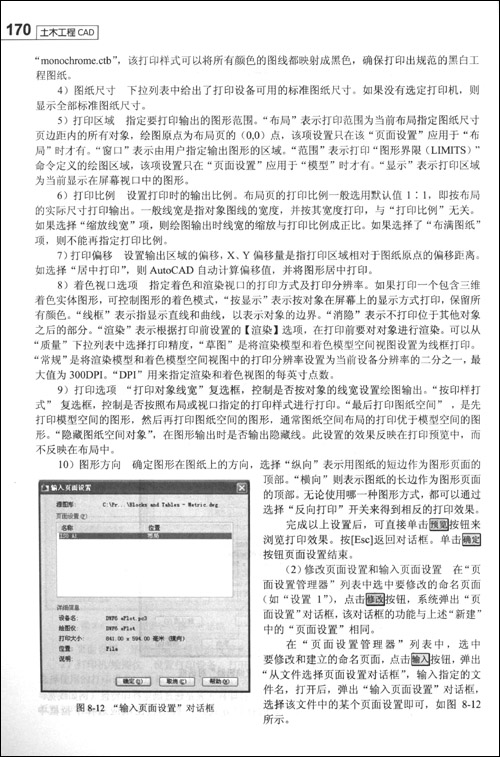 5)打印区域指定要打印输出的图形范围。“布局”表示打印范围为当前布局指定图纸尺寸页边距内的所有对象,绘图原点为布局页的(0,0)点,该项设置只在该“页面设置”应用于“布局”时才有。“窗口”表示由用户指定输出图形的区域。“范围”表示打印“图形界限(LIMITS)”命令定义的绘图区域,该项设置只在“页面设置”应用于“模型”时才有。“显示”表示打印区域为当前显示在屏幕视口中的图形。