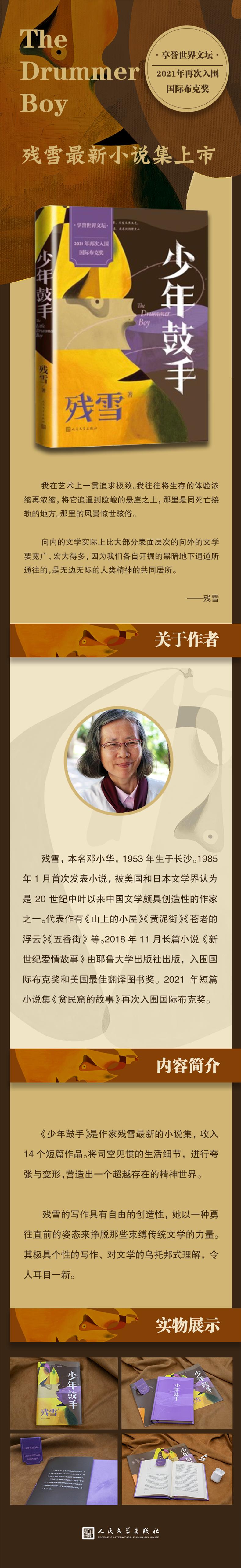 《少年鼓手》是作家残雪最新的小说集,收入14个短篇作品。将司空见惯的生活细节,进行夸张与变形,营造出一个超越存在的精神世界。