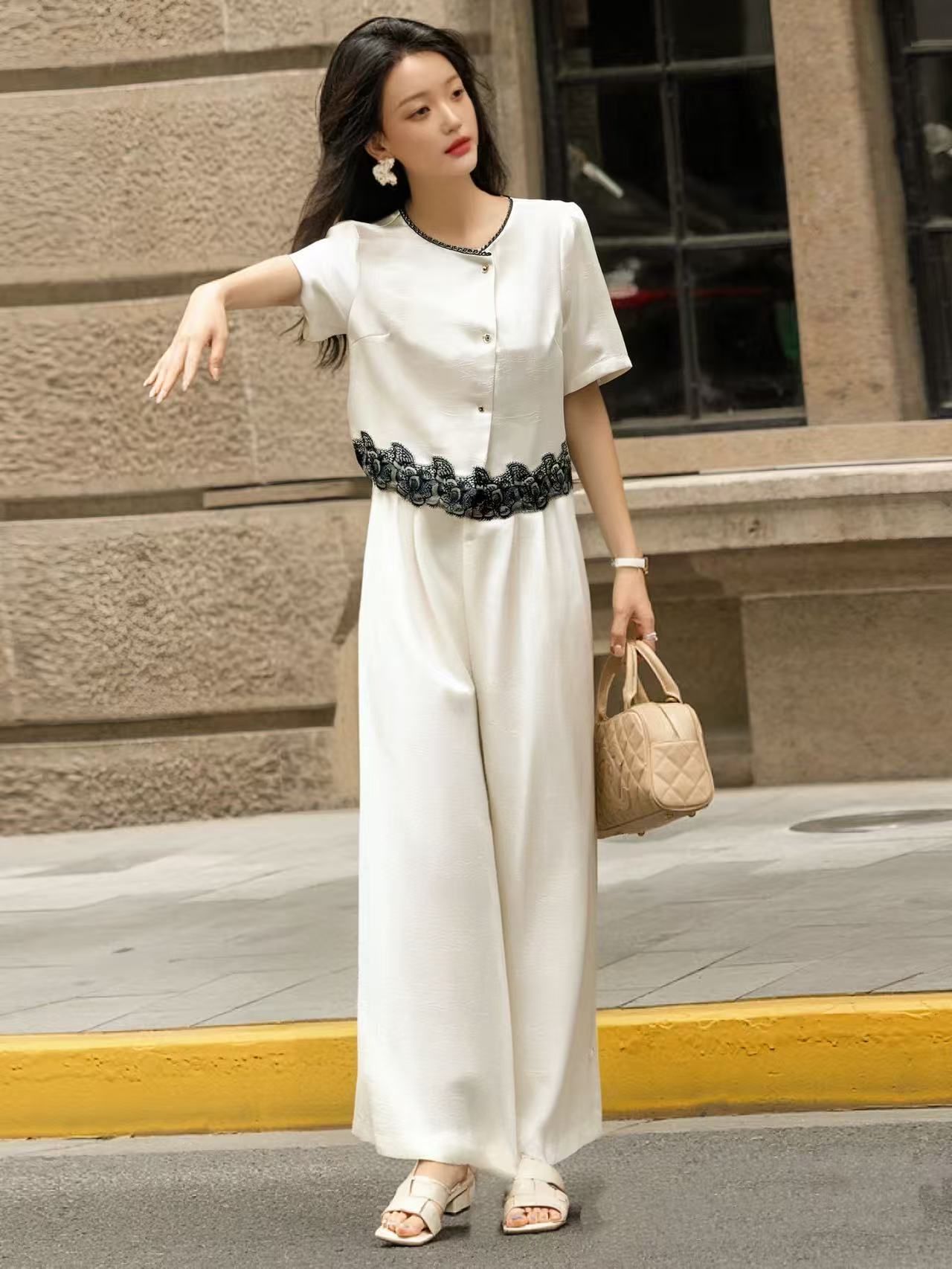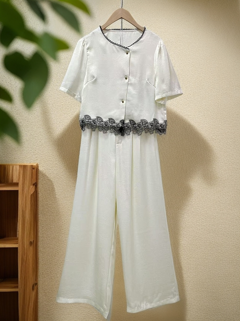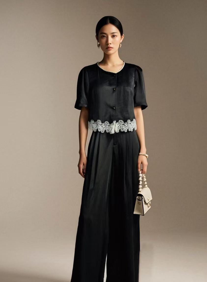 【限八一促】 福利推荐~垂感顺滑{ 套装 }缎面感压皱蕾丝上衣➕阔腿裤-喜出