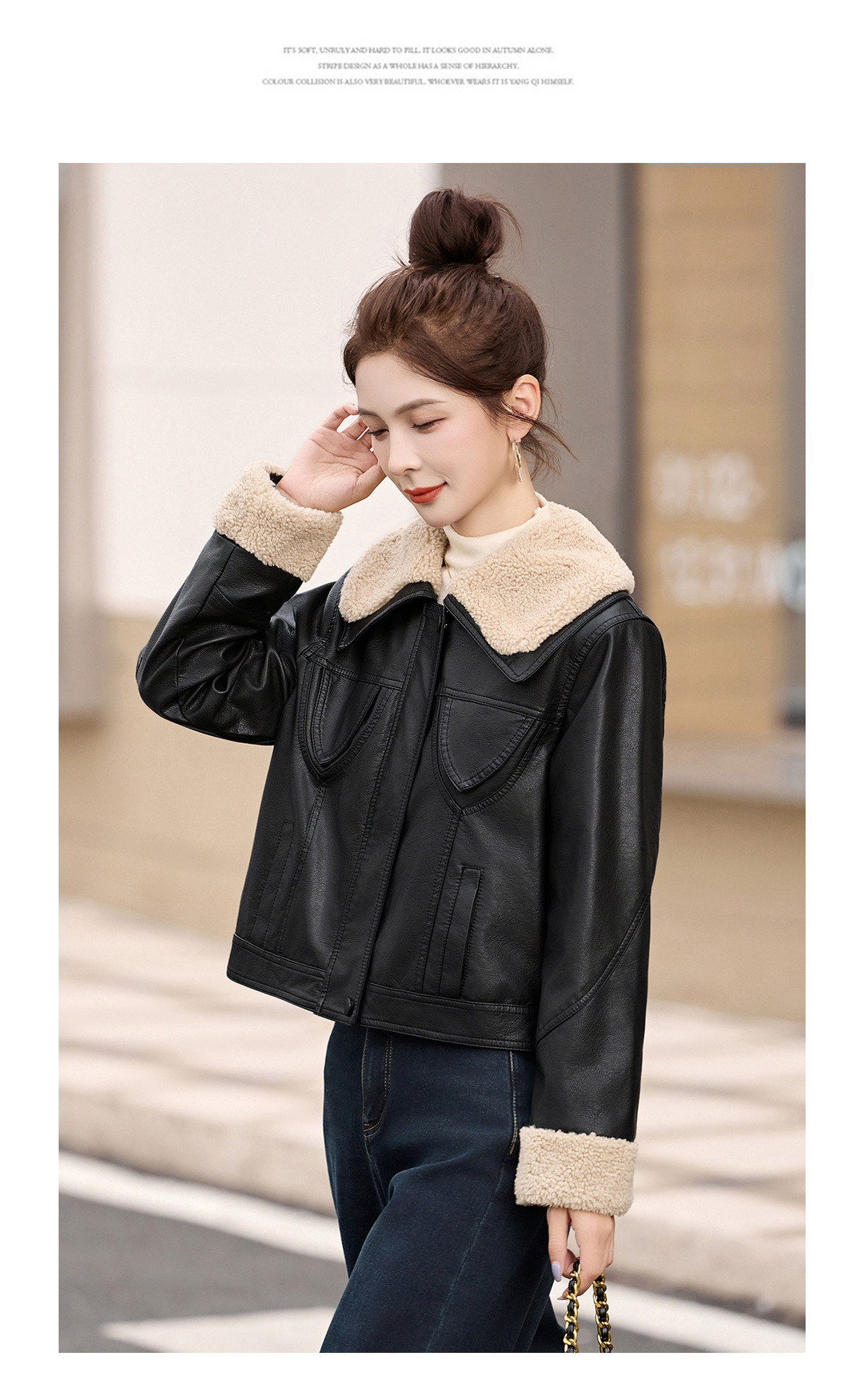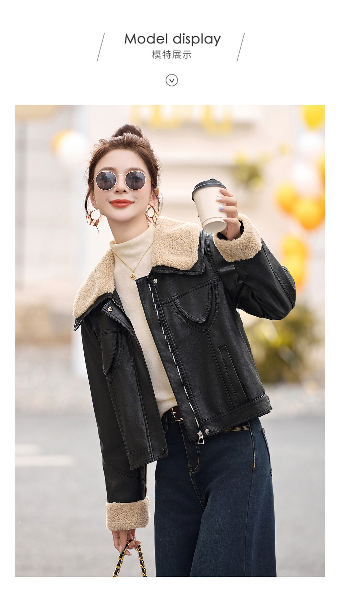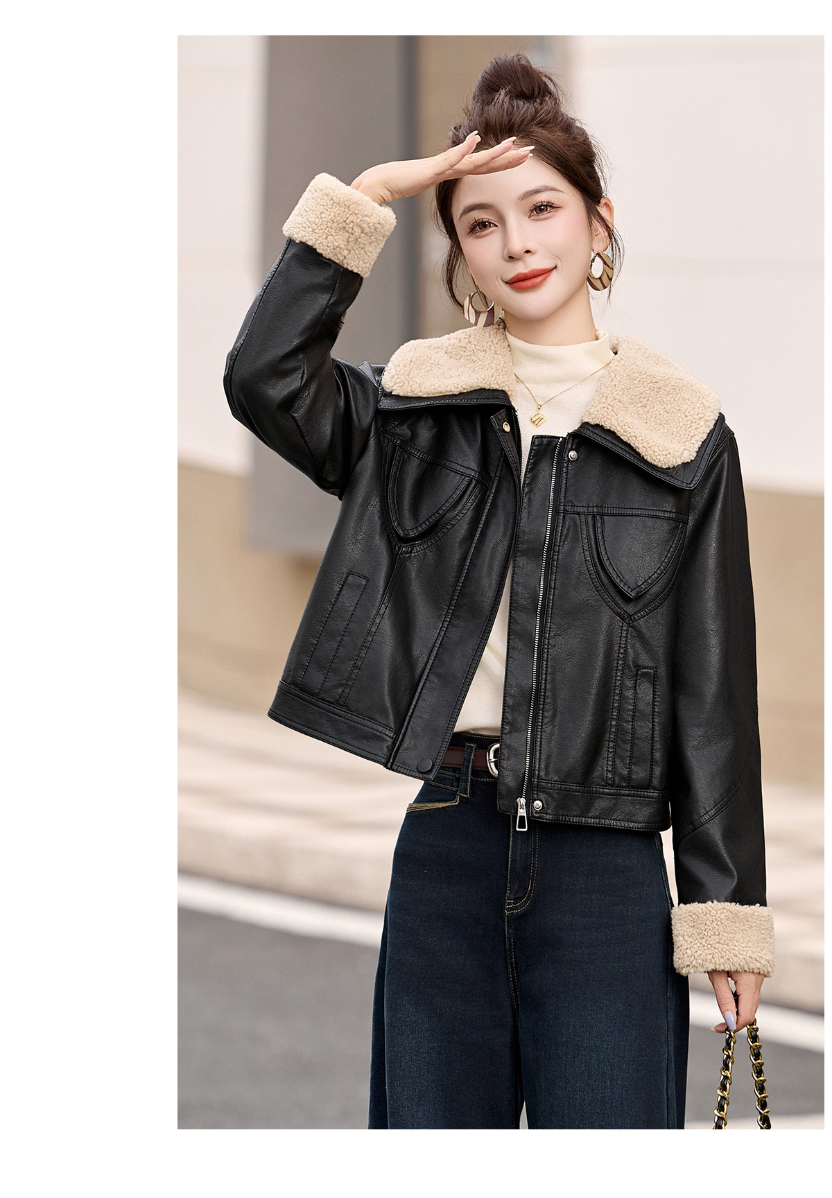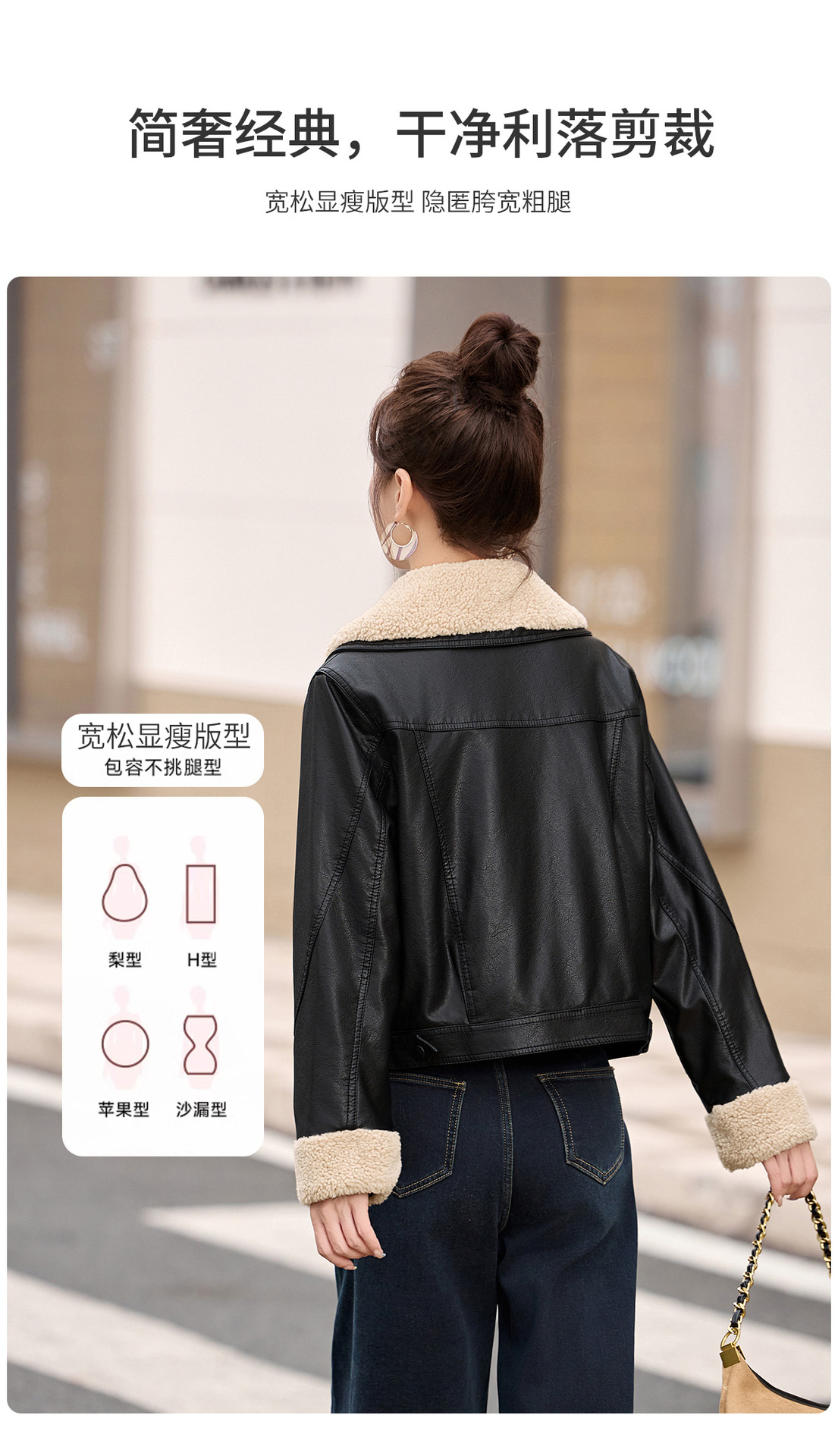 羊羔毛拼接加绒黑色皮衣,加厚保暖小个子皮夹克外套HR-9802