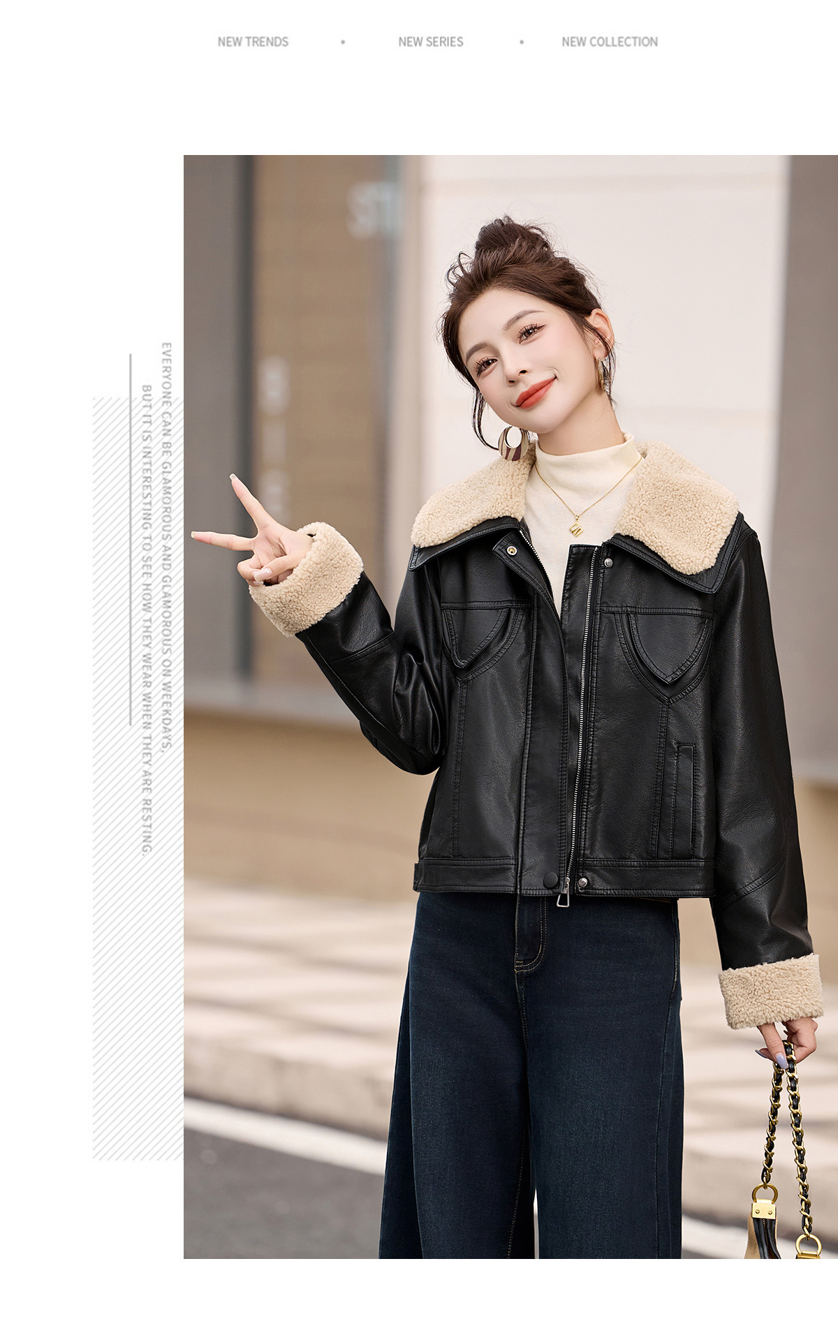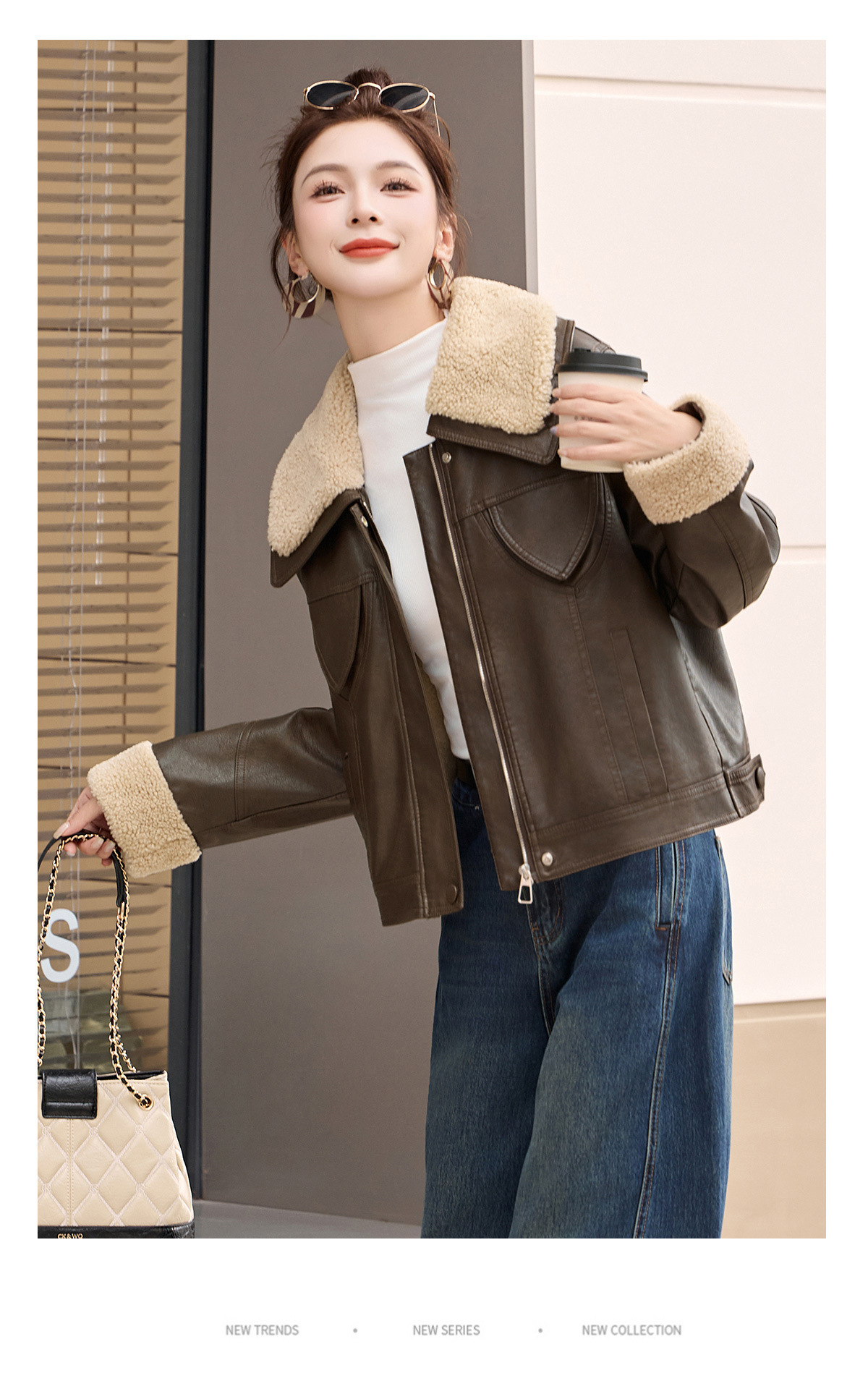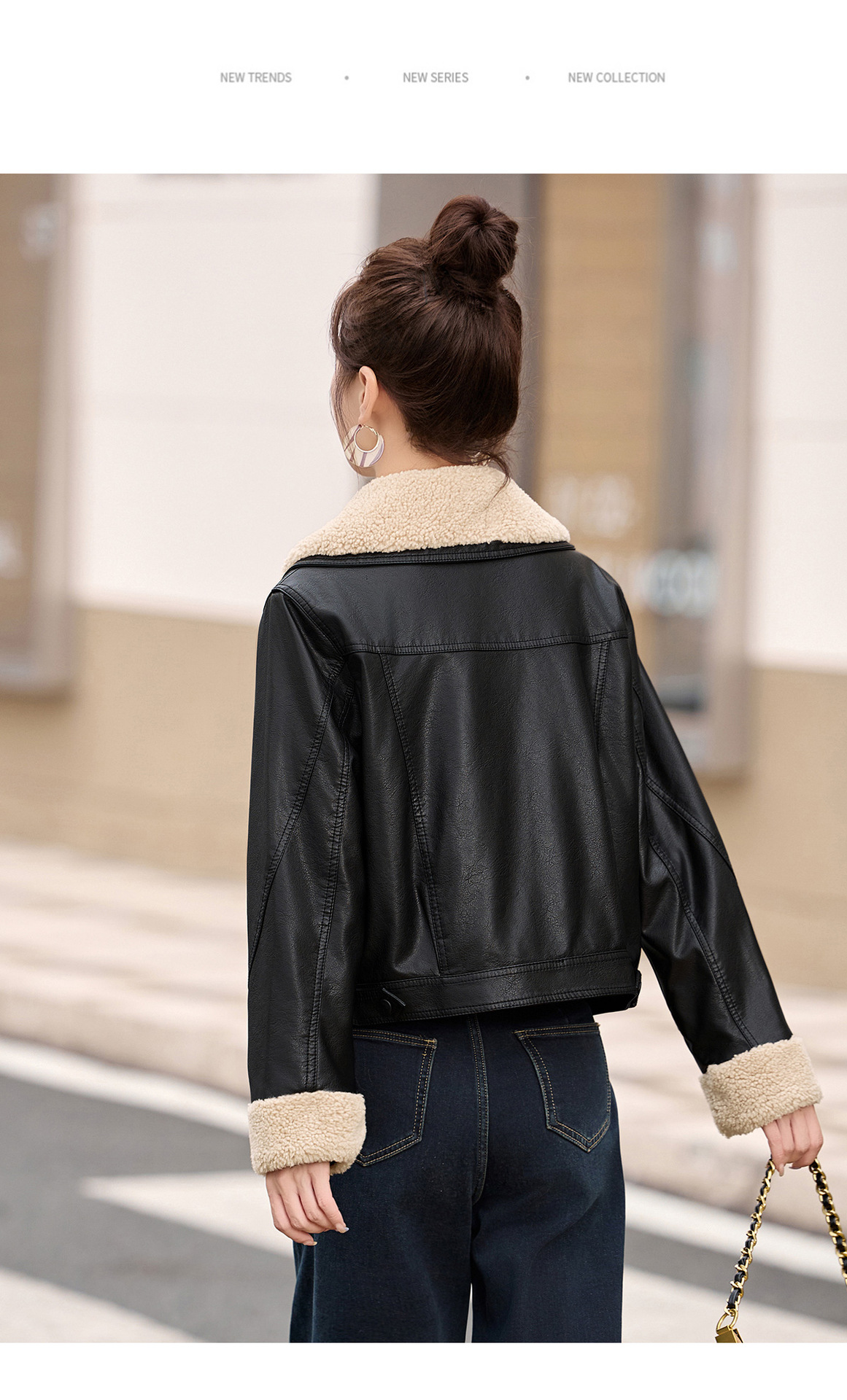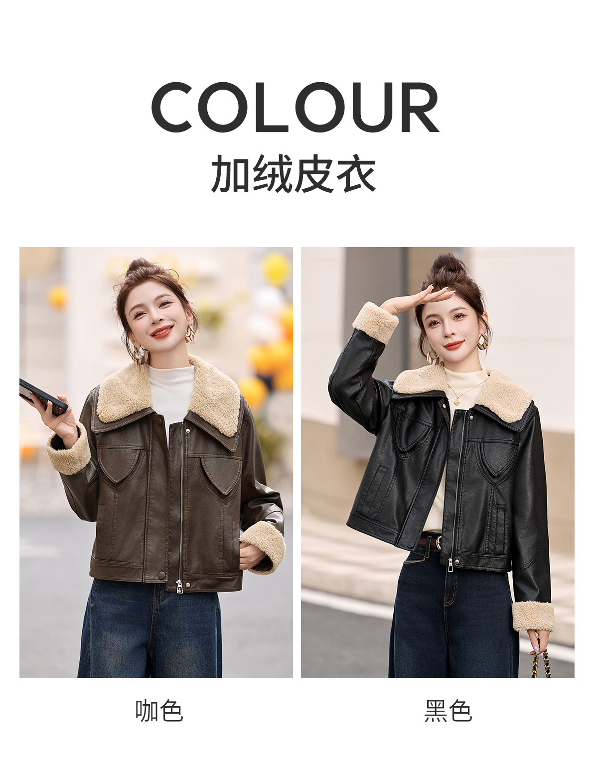 羊羔毛拼接加绒黑色皮衣,加厚保暖小个子皮夹克外套HR-9802
