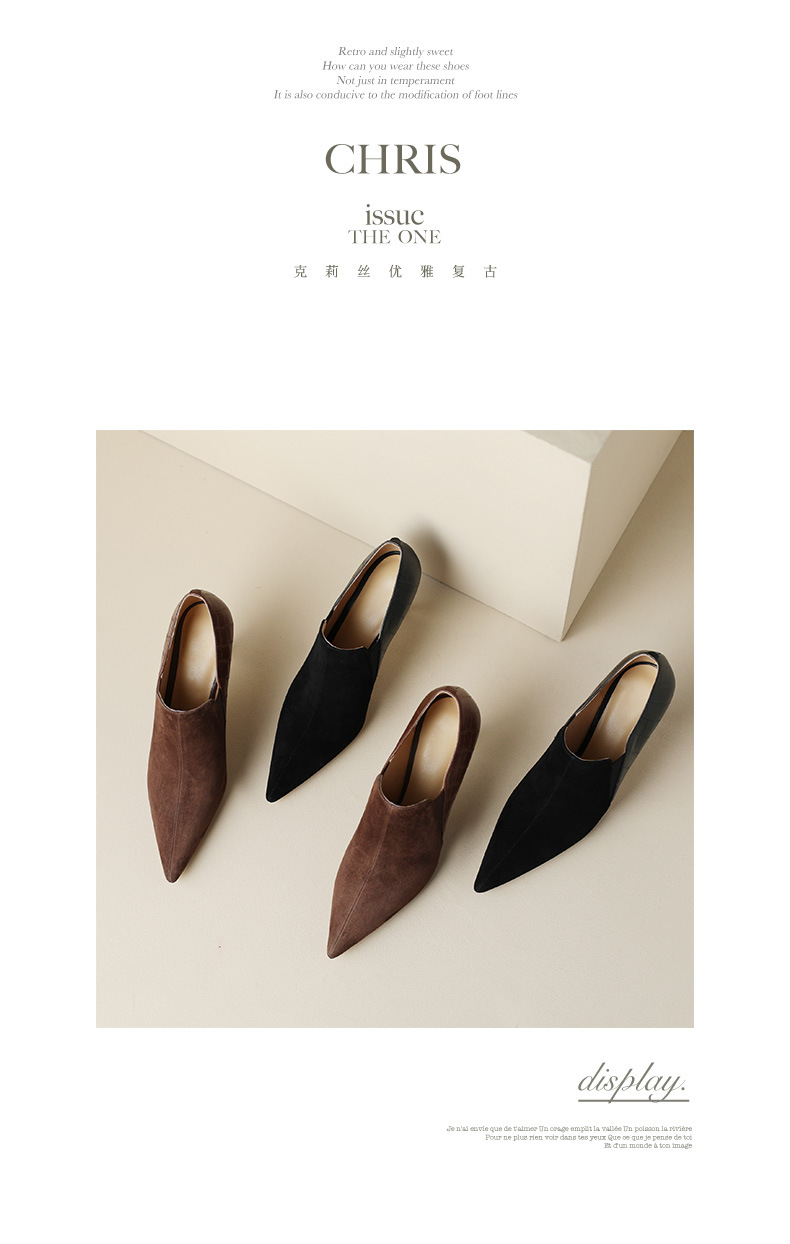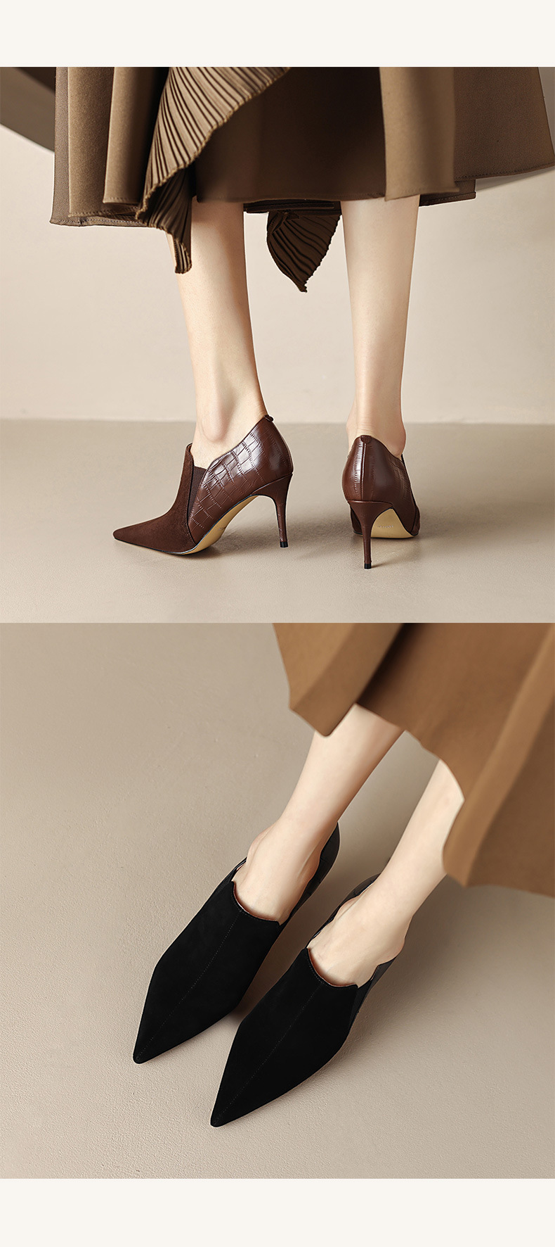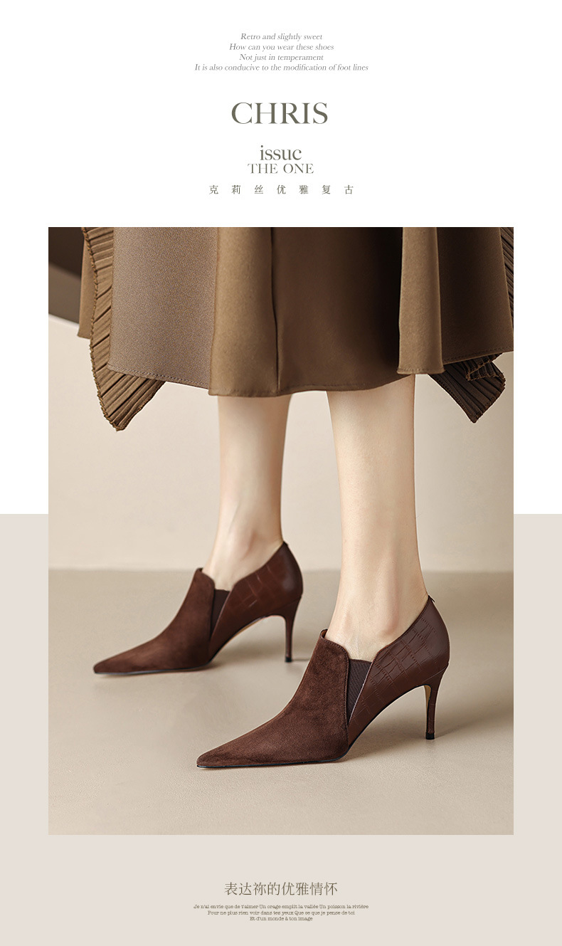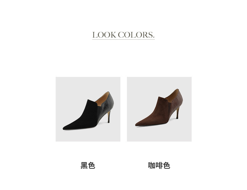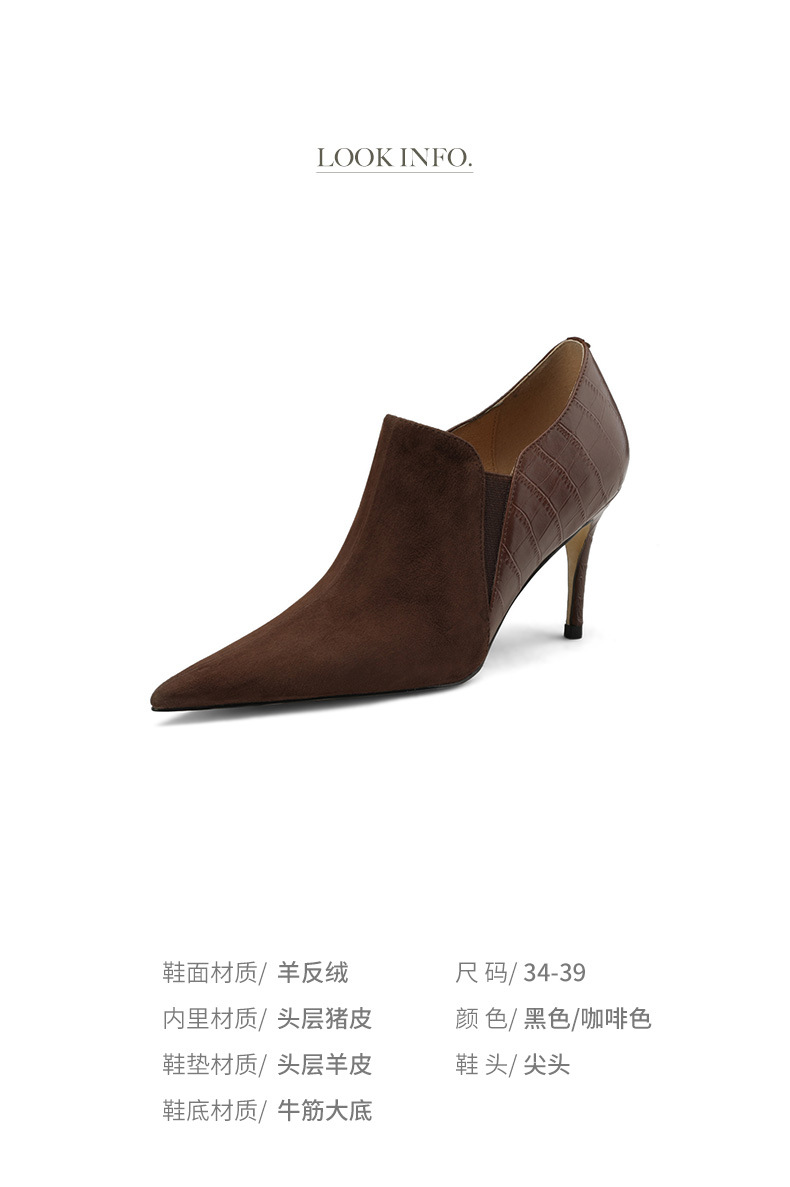 法式复古单鞋,女尖头细跟春新小皮鞋气质翻皮中跟深口女鞋拼色MLS-633