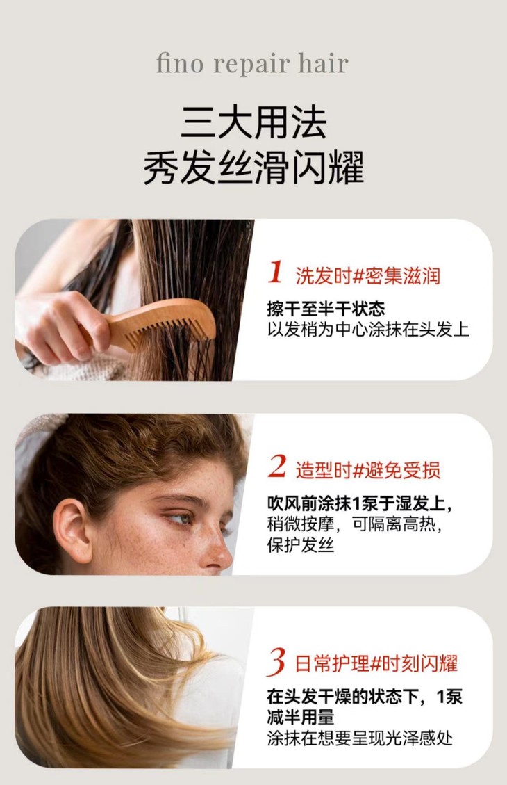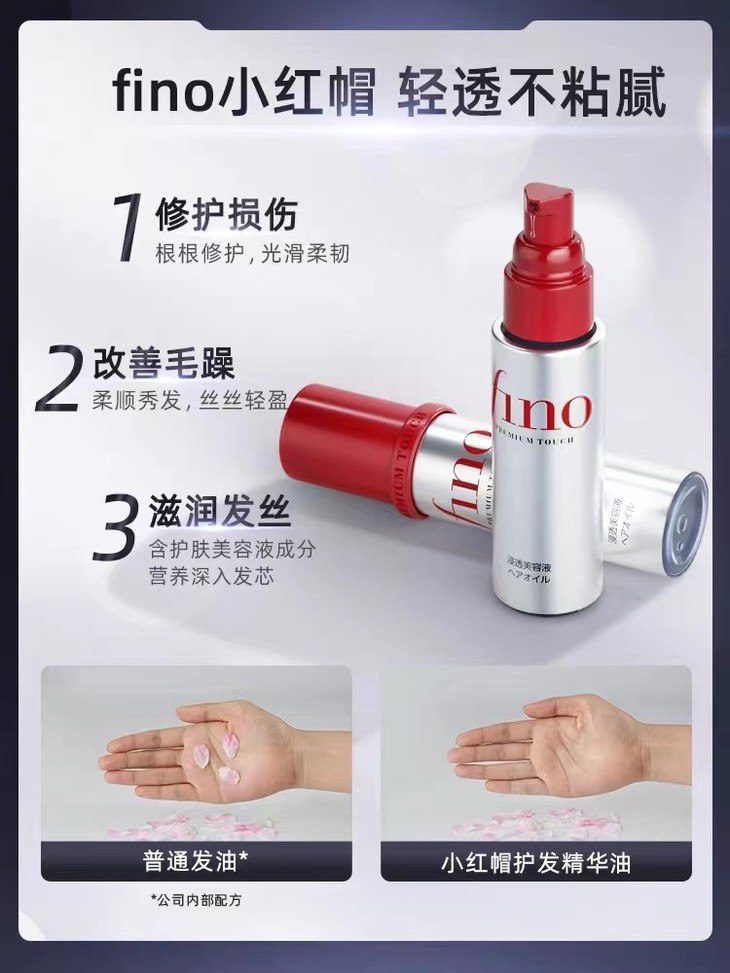 👑资生堂FINO高效渗透修护发油70ml 👍明星同款清新花香,3大美容液精华,搭载修护黑科技! 💦清爽不粘腻,涂抹后迅速吸收,起到柔顺秀发,提升光泽效果 ✅内含修护精华油,长期使用发质会越来越好~ 🟣主要功效:修护受损,柔顺亮泽,抚平毛躁,清甜润发 🟡适用发质:各类发质均适用,特别是烫染受损发质~